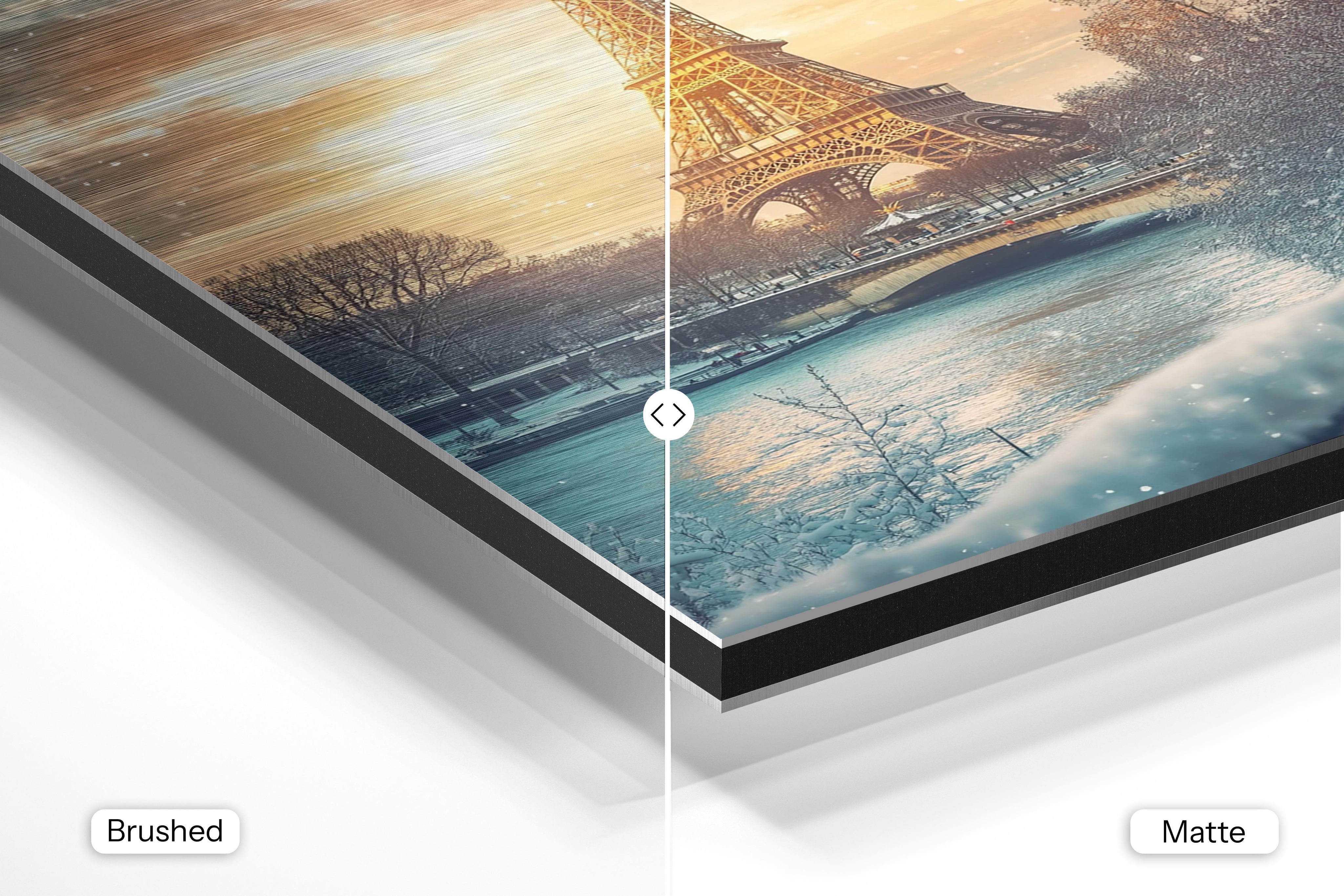 - Brushed Aluminum, on the other hand, features a raw metallic texture with visible brush strokes. Whites and highlights in your image let the silver surface show through, adding a dramatic, shimmering effect. Ideal for black-and-white images, minimalist designs, or abstract art, it creates a bold, industrial vibe with a modern edge.