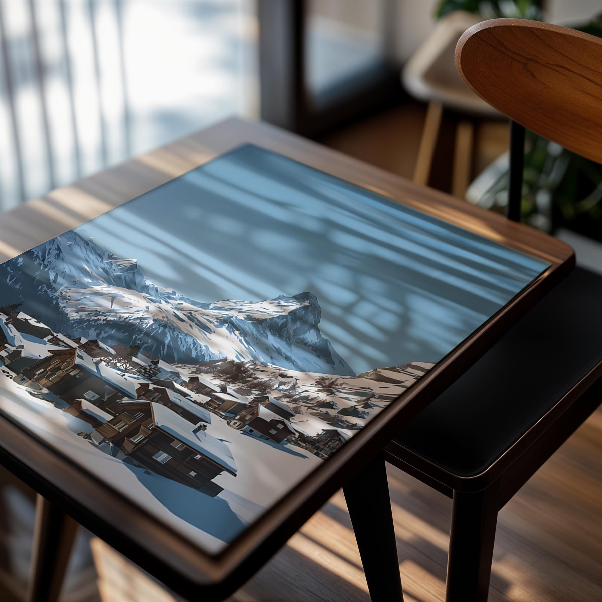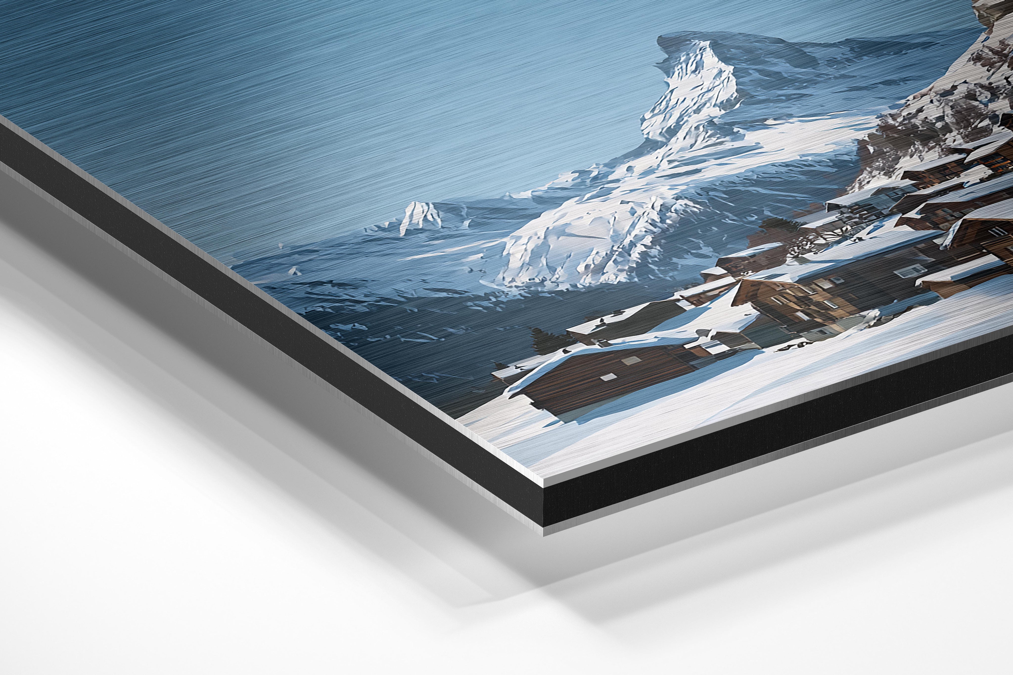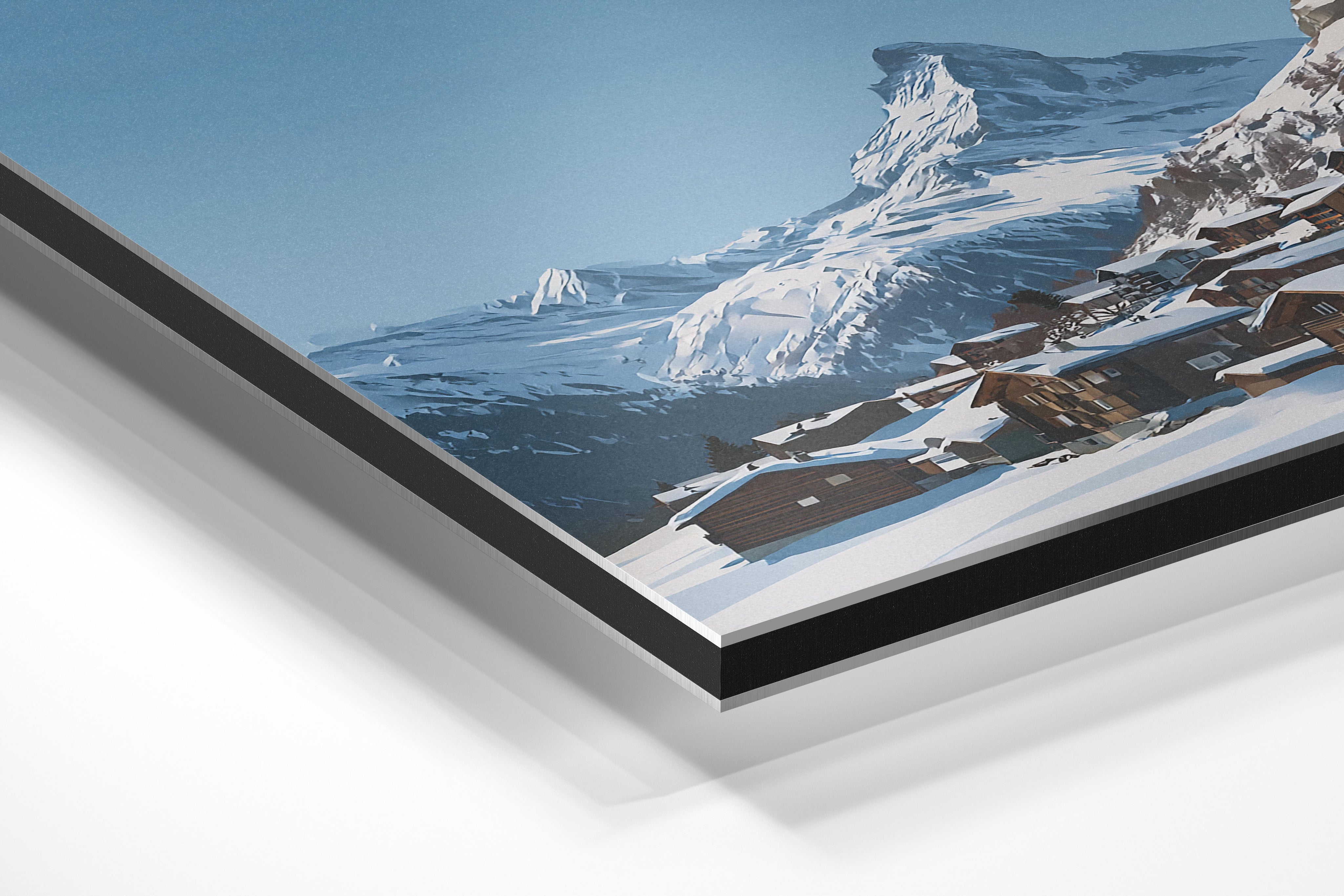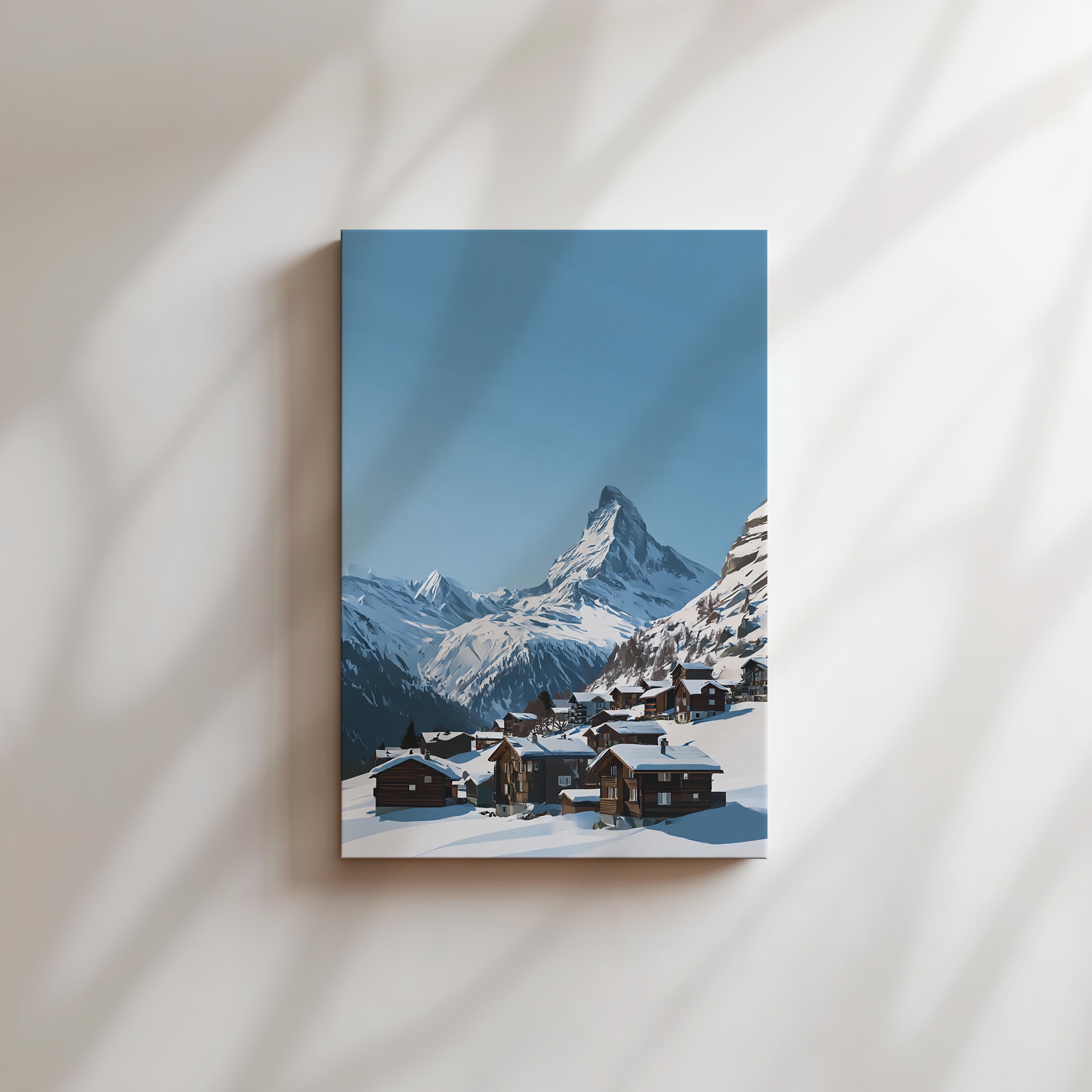 Wooden alpine chalets nestle in the snow with the majestic Matterhorn towering in the background under clear blue skies. The crisp winter setting feels peaceful and pristine, making this image ideal for cozy interiors, ski lodges, or any space wishing to evoke alpine charm and escape into a winter wonderland.