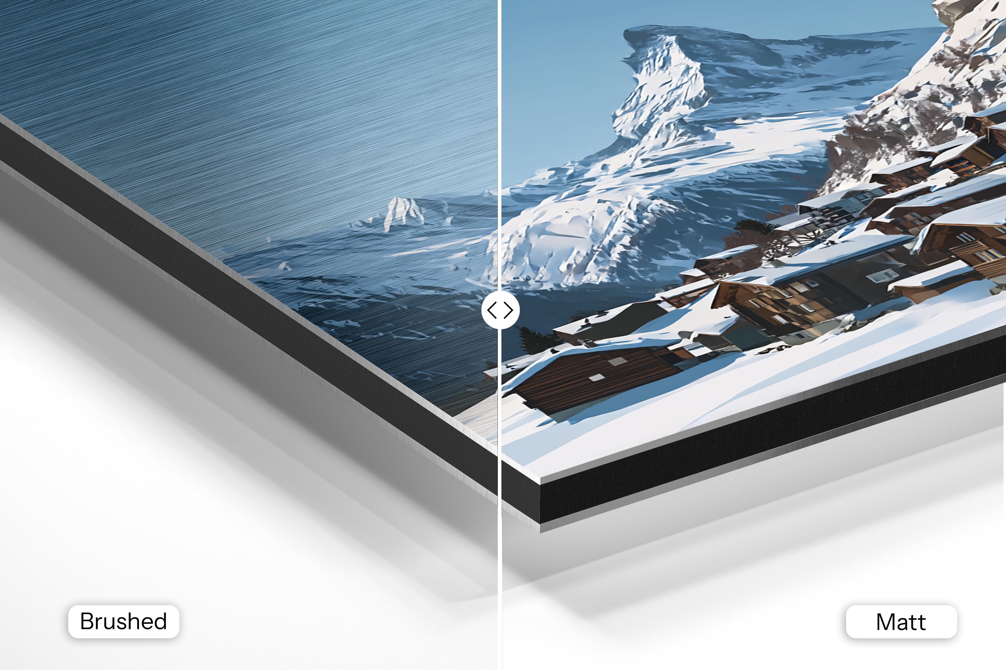 - Brushed Aluminum, on the other hand, features a raw metallic texture with visible brush strokes. Whites and highlights in your image let the silver surface show through, adding a dramatic, shimmering effect. Ideal for black-and-white images, minimalist designs, or abstract art, it creates a bold, industrial vibe with a modern edge.