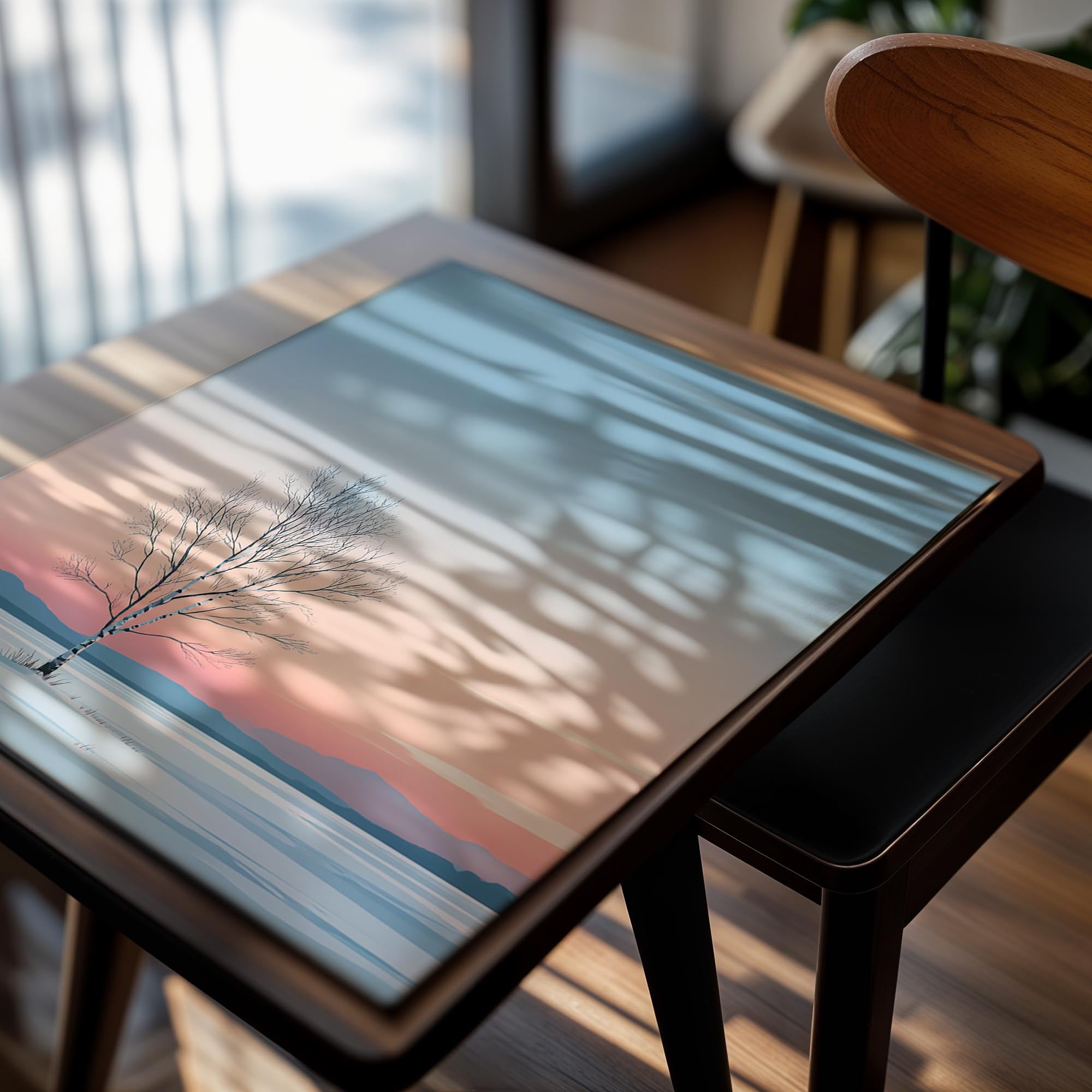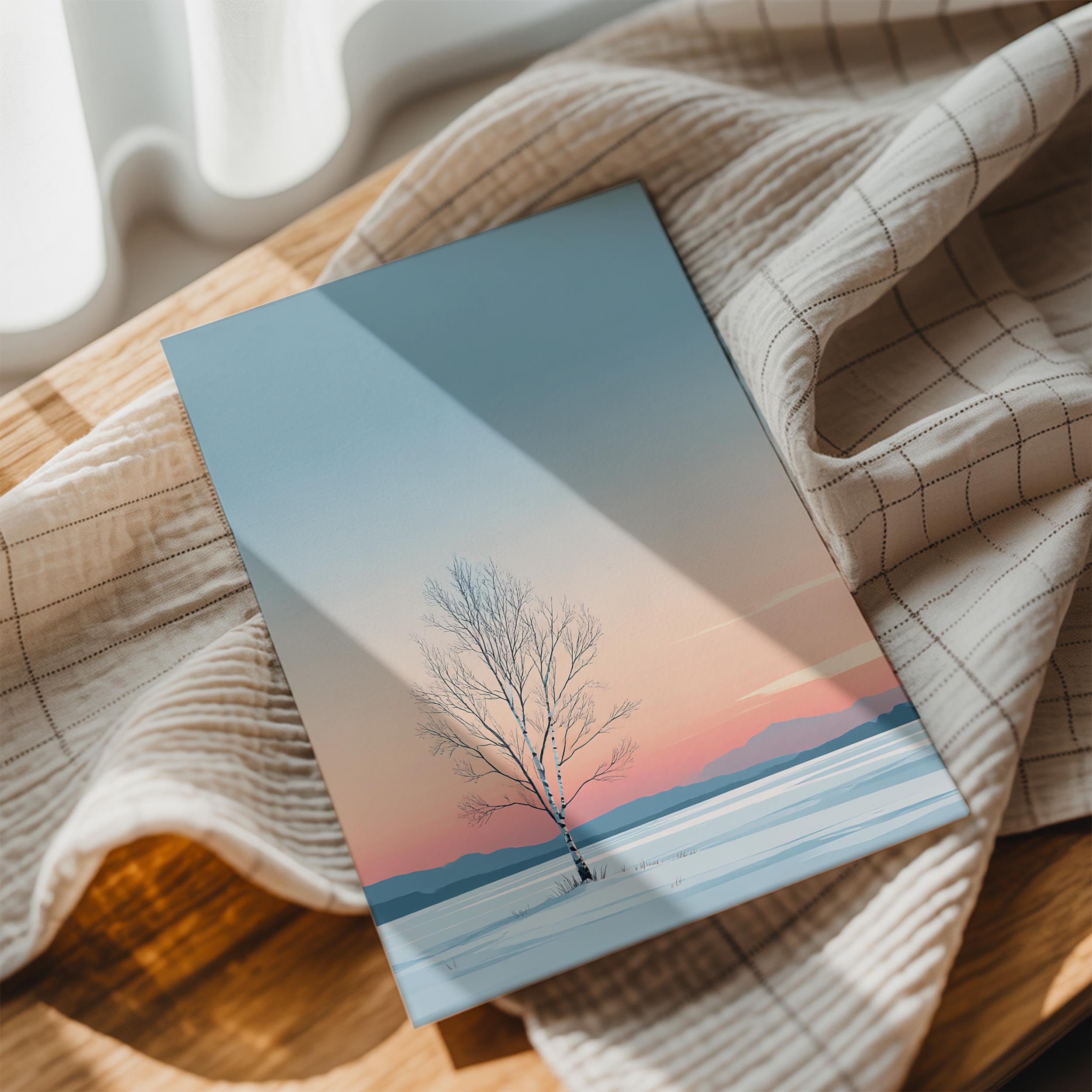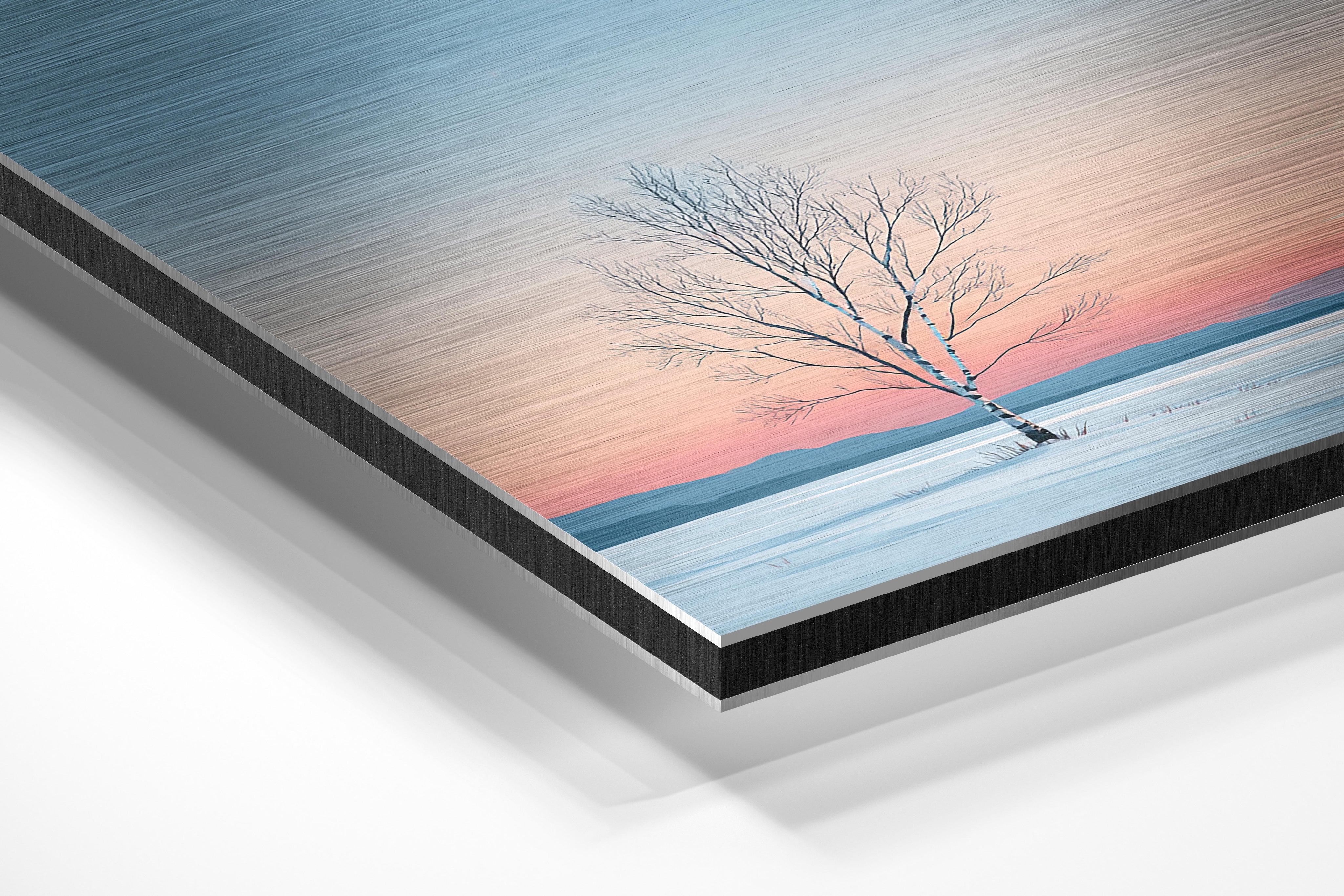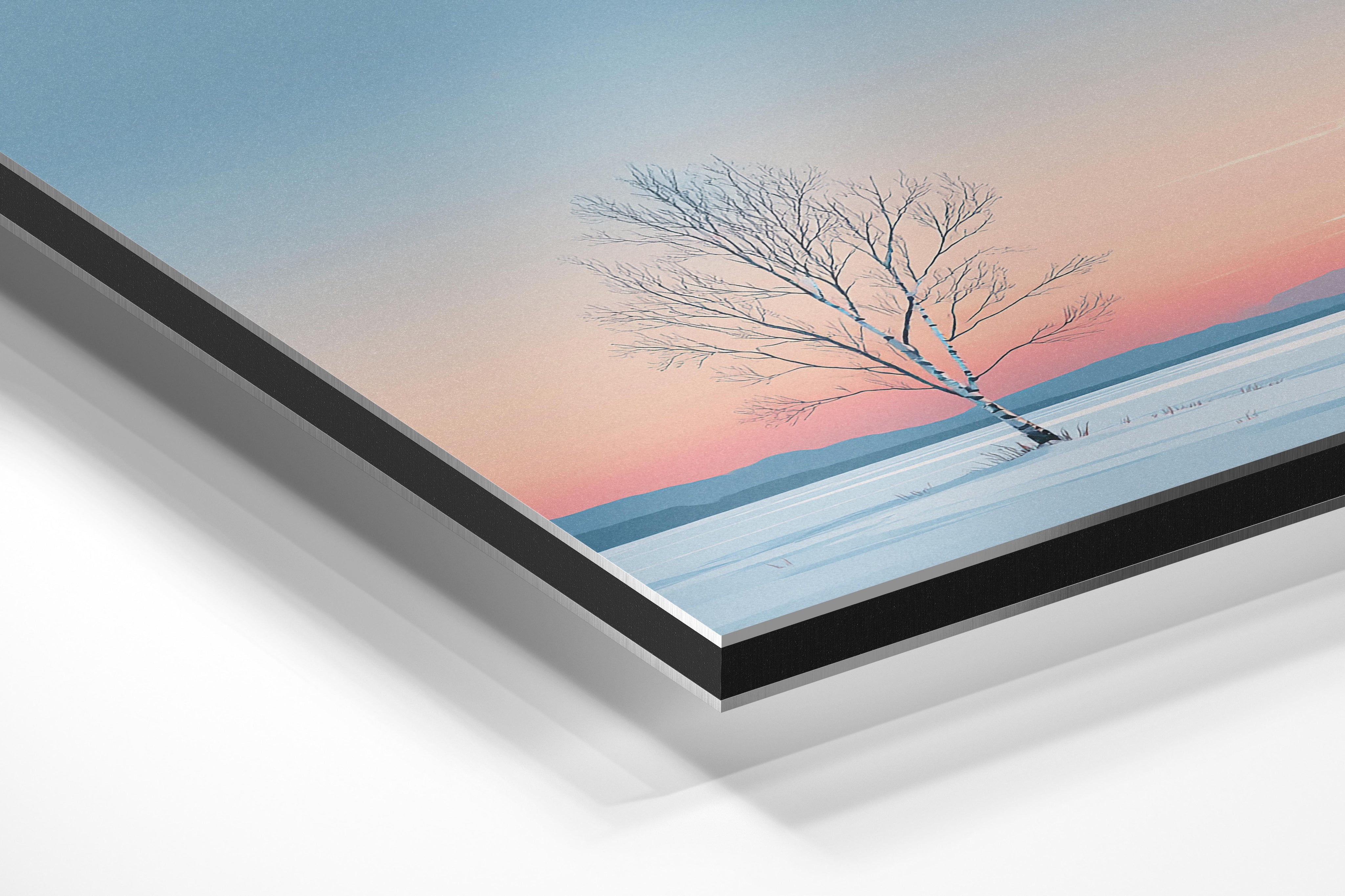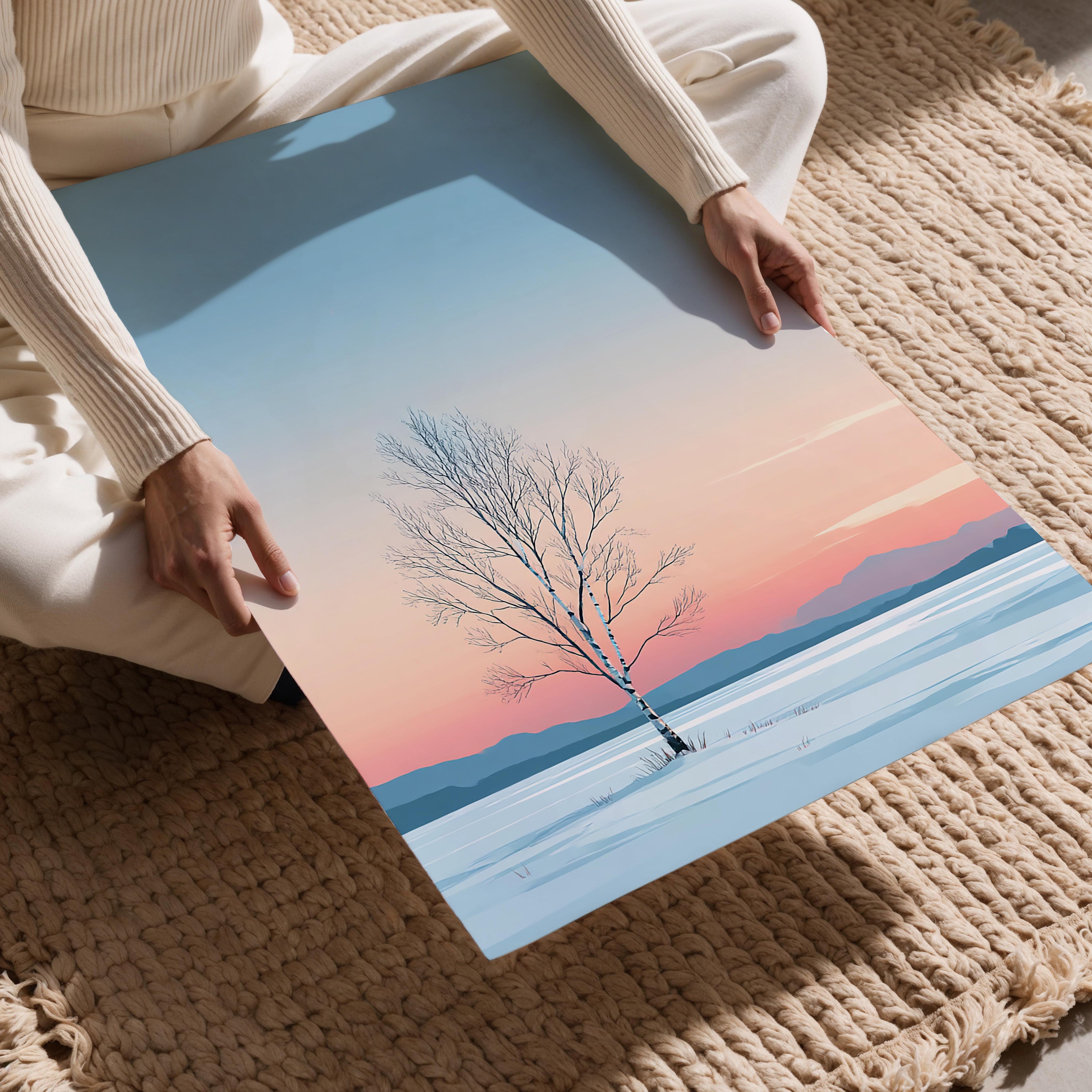 A lone birch tree stands tall in the center of a snowy landscape, exuding quiet strength and solitude. The pastel gradient sky transitions from soft peach to icy blue, casting a calming glow across the wintry terrain. Its minimalistic composition highlights the slender elegance of the bare branches, while distant blue mountains softly fade into the background. This image evokes a peaceful, introspective mood, making it ideal for minimalist interiors, meditation spaces, or Scandinavian-style decor. It offers a serene reminder of stillness and endurance through winter's hush, and its poetic simplicity allows it to fit beautifully into modern wall art collections.