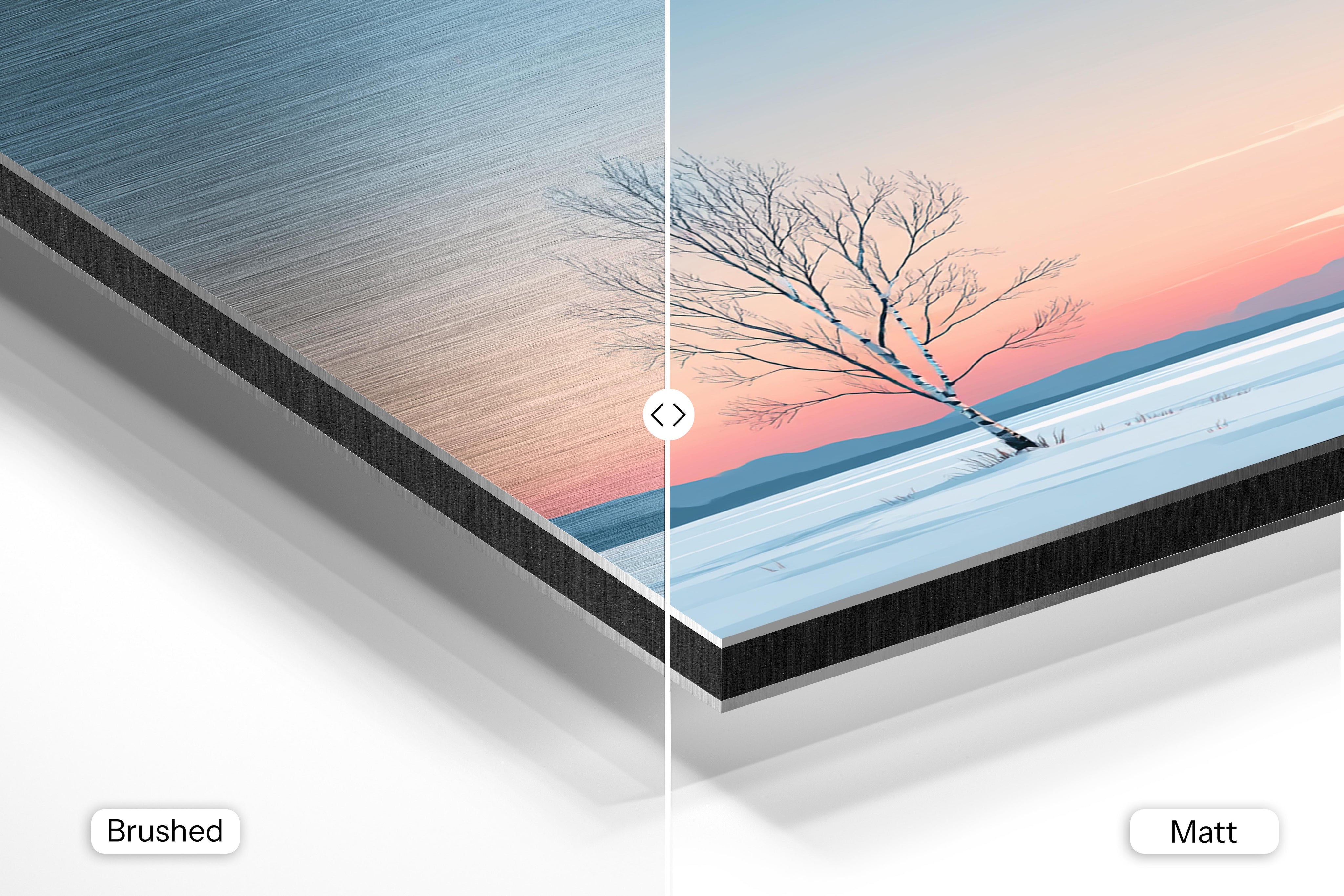 - Brushed Aluminum, on the other hand, features a raw metallic texture with visible brush strokes. Whites and highlights in your image let the silver surface show through, adding a dramatic, shimmering effect. Ideal for black-and-white images, minimalist designs, or abstract art, it creates a bold, industrial vibe with a modern edge.