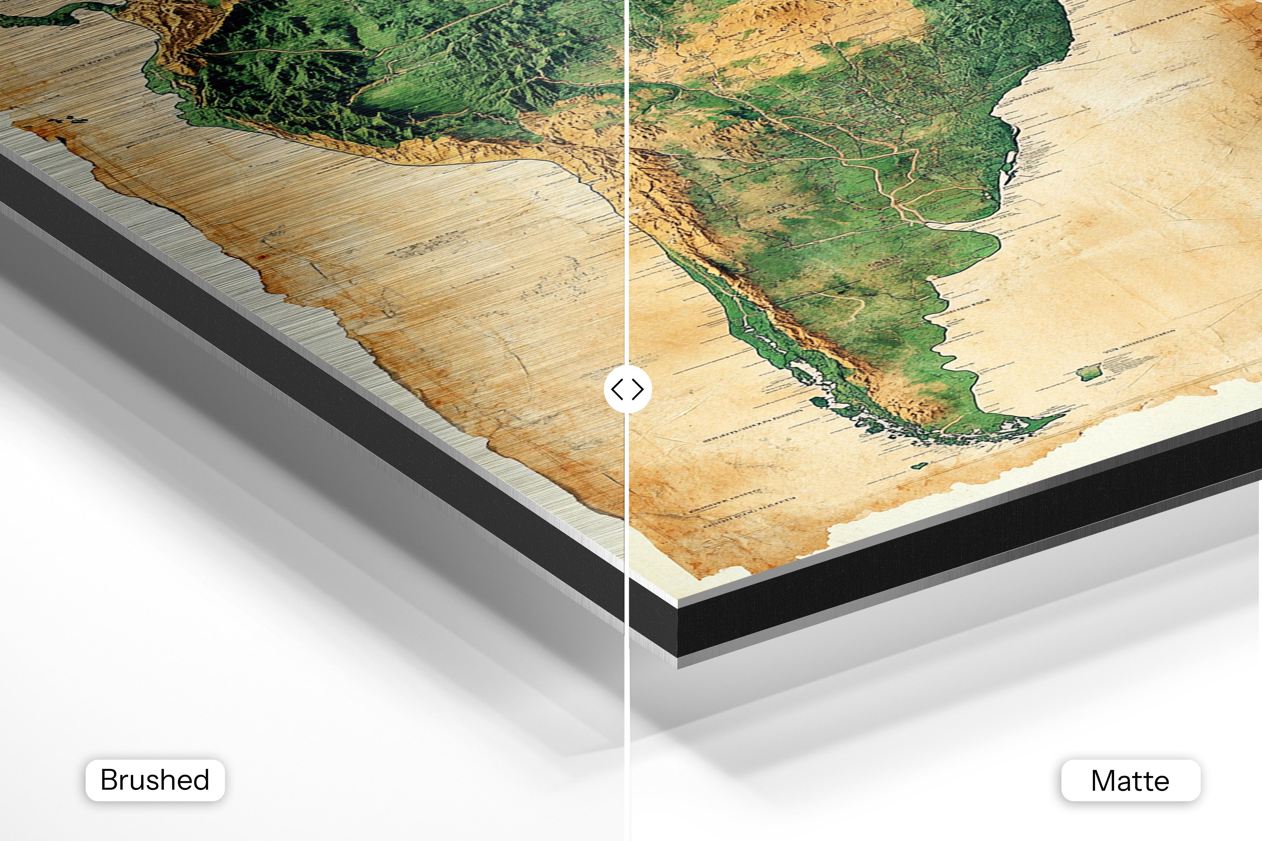 - Brushed Aluminum, on the other hand, features a raw metallic texture with visible brush strokes. Whites and highlights in your image let the silver surface show through, adding a dramatic, shimmering effect. Ideal for black-and-white images, minimalist designs, or abstract art, it creates a bold, industrial vibe with a modern edge.