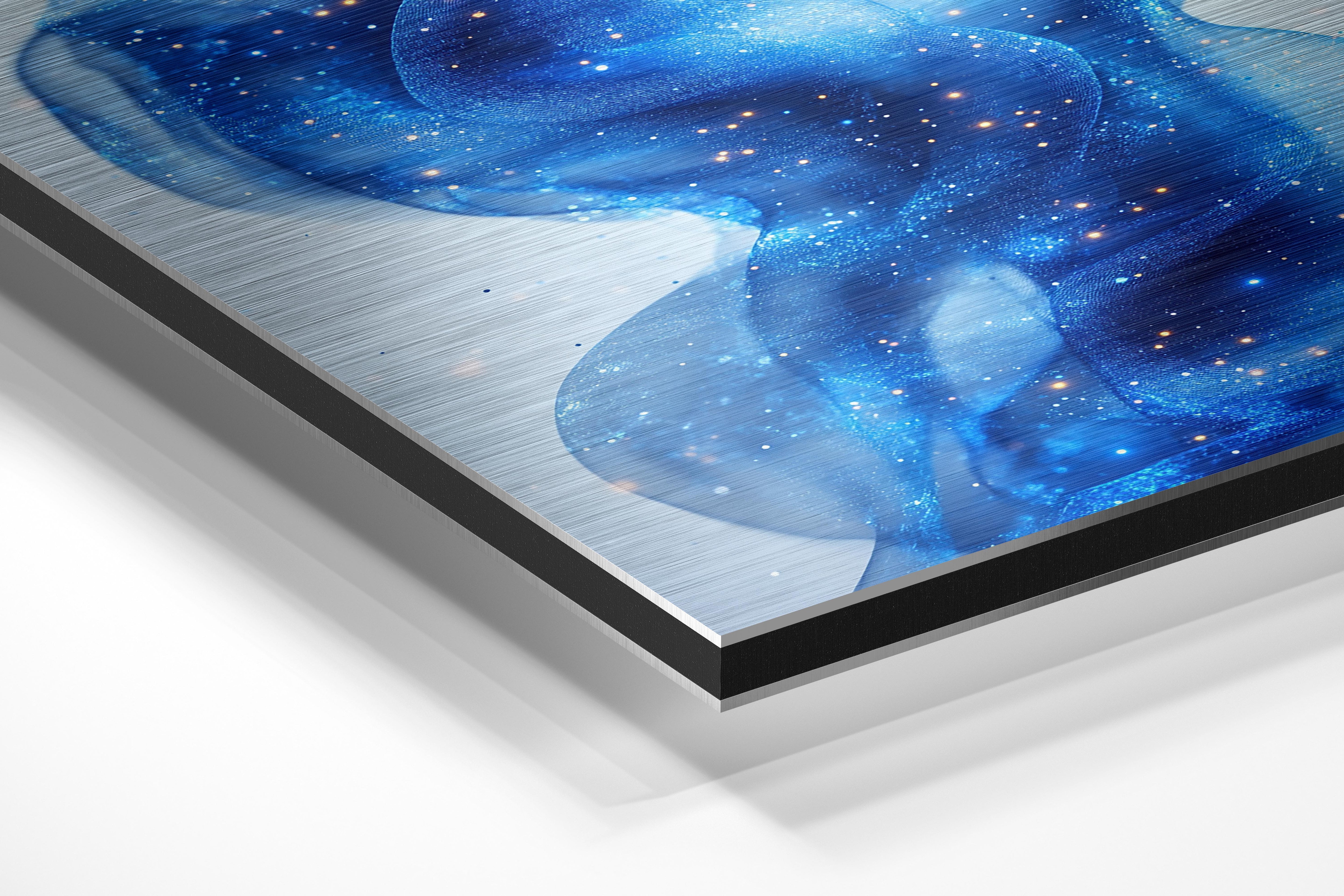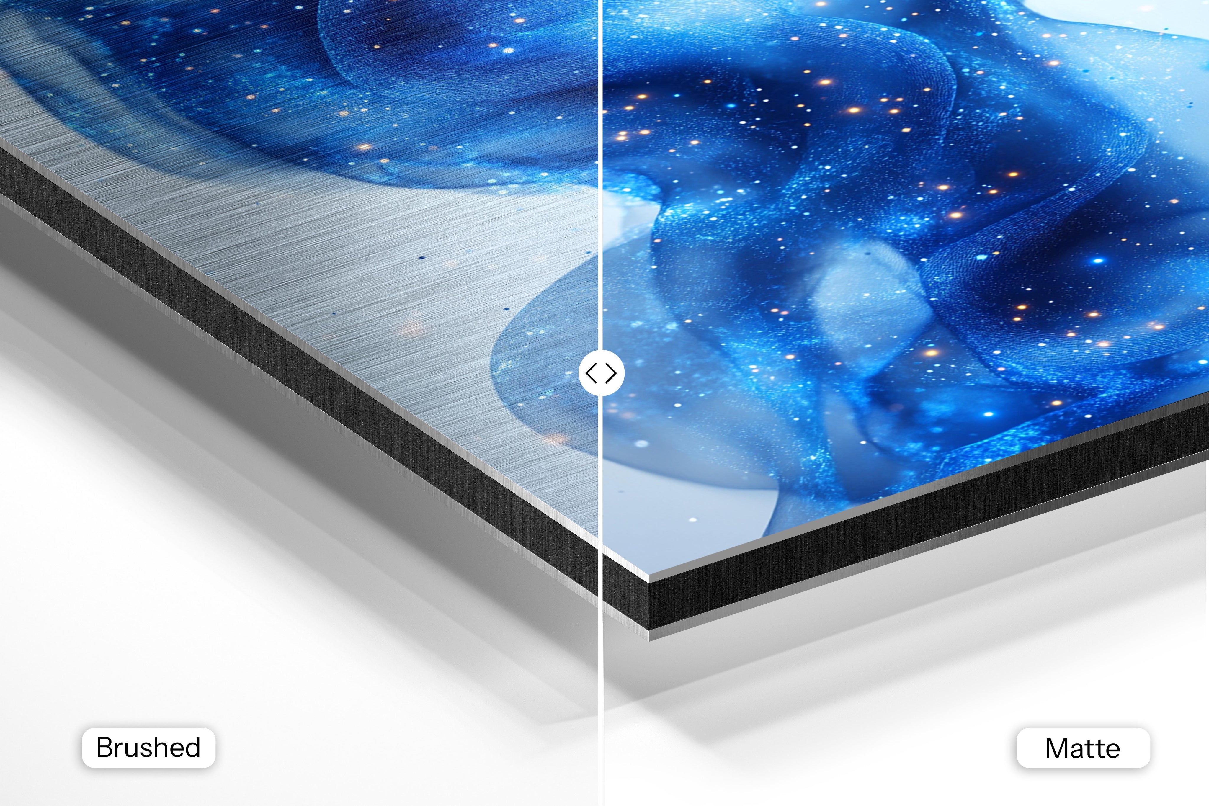 - Brushed Aluminum, on the other hand, features a raw metallic texture with visible brush strokes. Whites and highlights in your image let the silver surface show through, adding a dramatic, shimmering effect. Ideal for black-and-white images, minimalist designs, or abstract art, it creates a bold, industrial vibe with a modern edge.