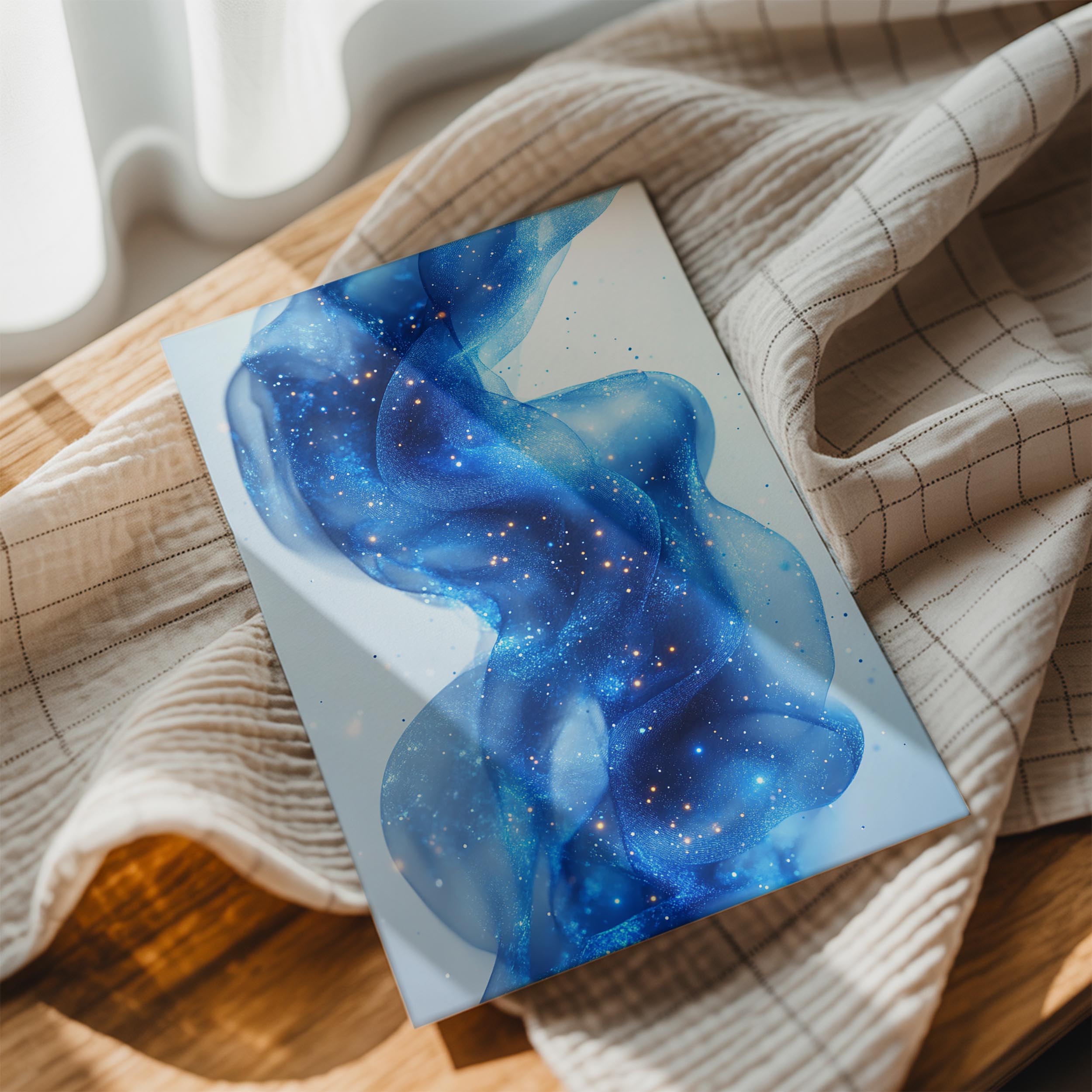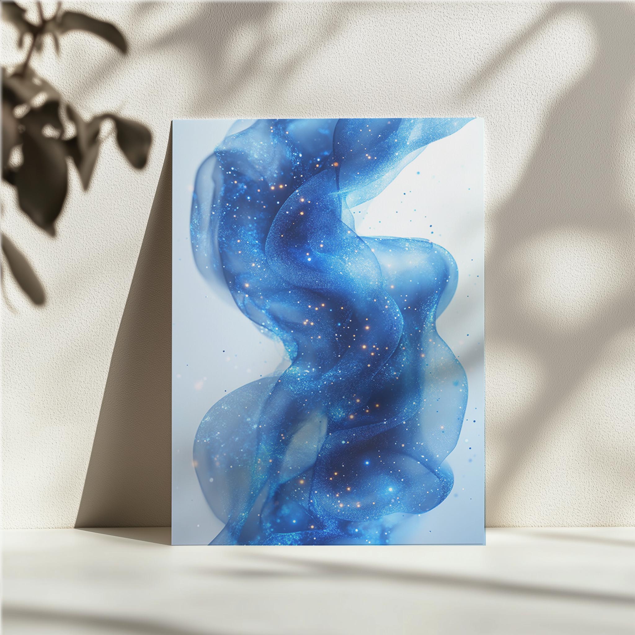 A flowing ribbon of translucent blue adorned with sparkling particles creates an ethereal, celestial effect. This piece evokes movement and lightness, making it ideal for modern interiors or creative spaces. The shimmering details add a sense of wonder, while the soft blues offer a calming presence. Perfect for settings like offices, spas, or bedrooms, this artwork combines elegance with a touch of whimsy. Its blend of simplicity and complexity makes it a versatile and captivating addition.