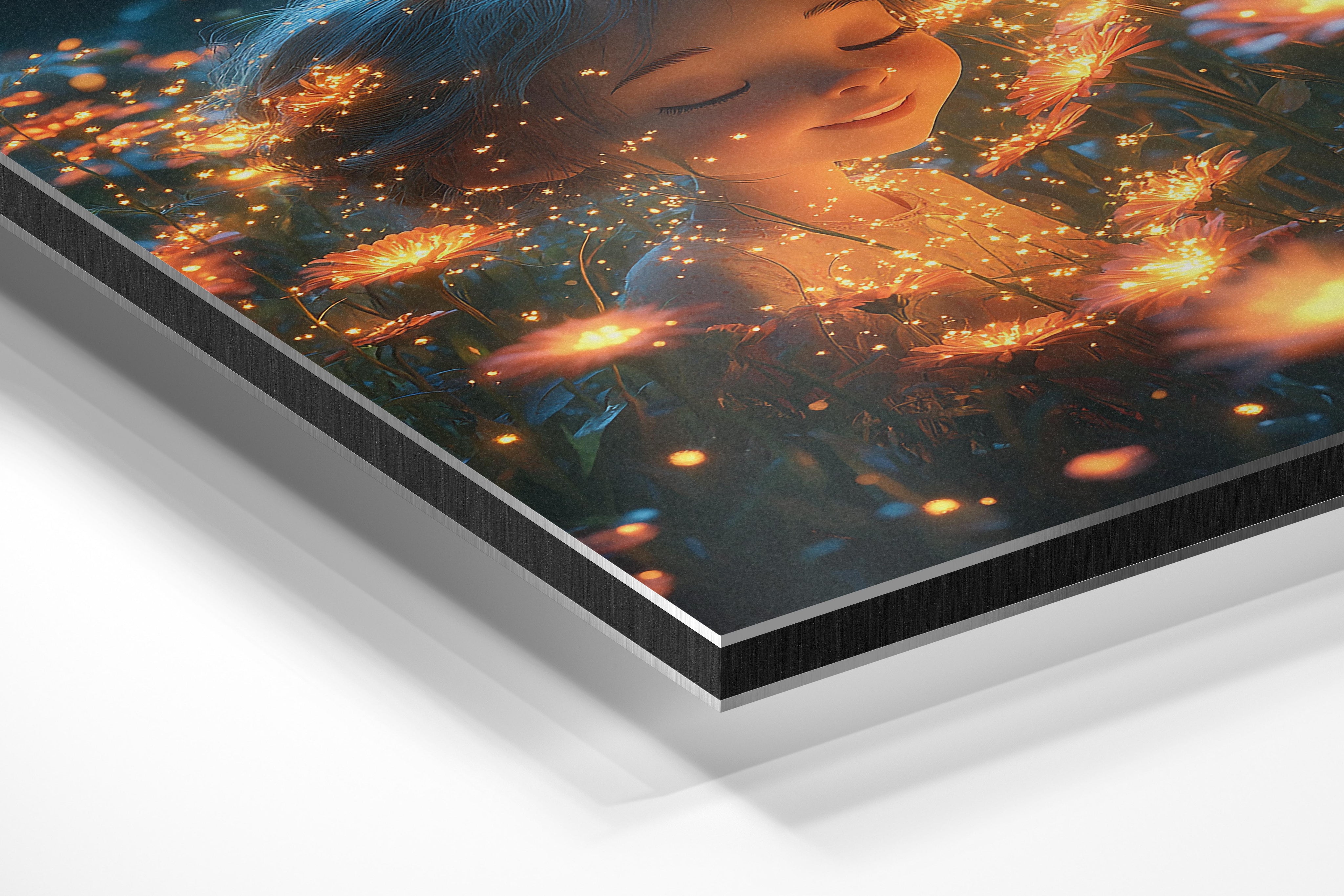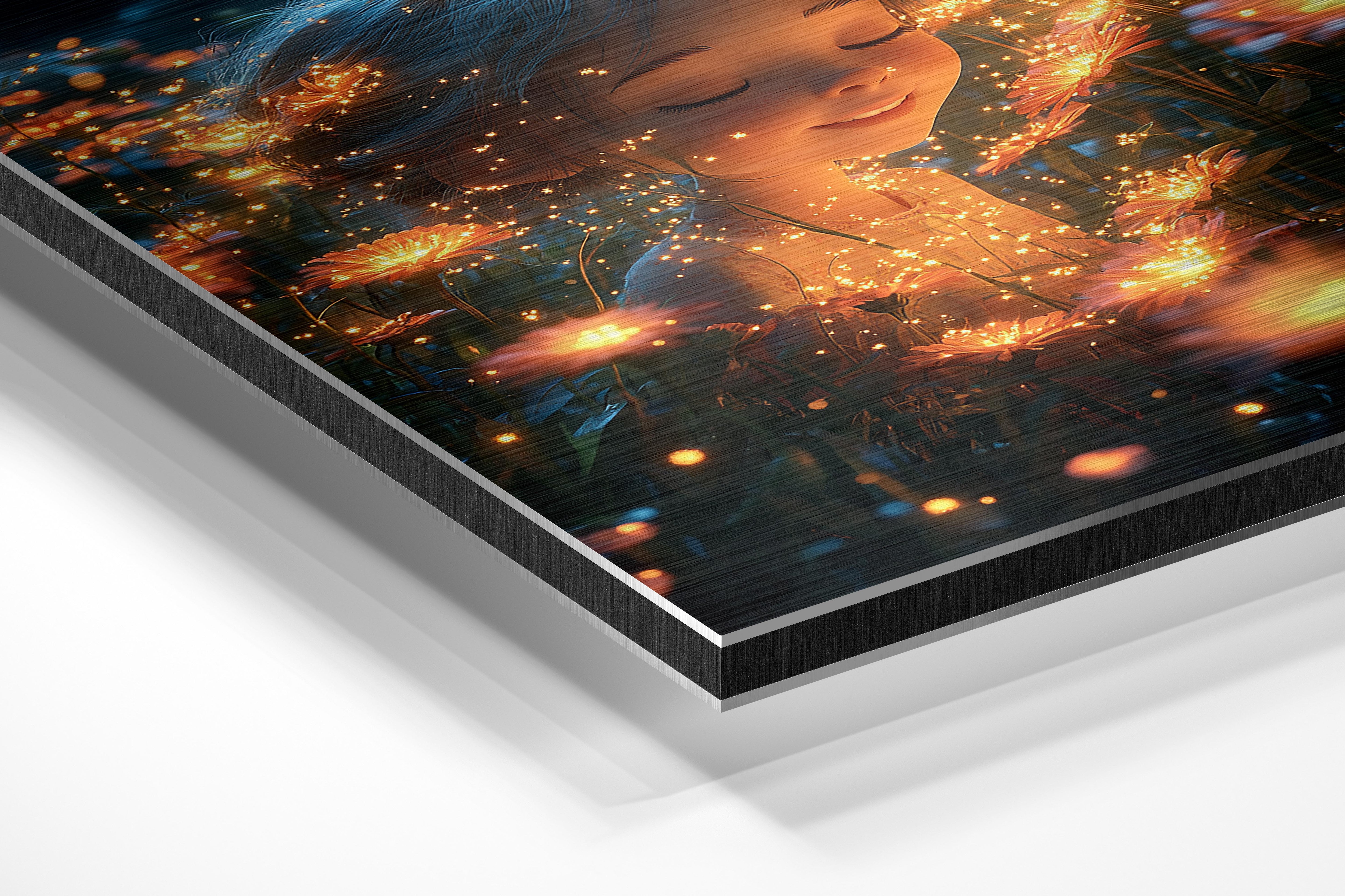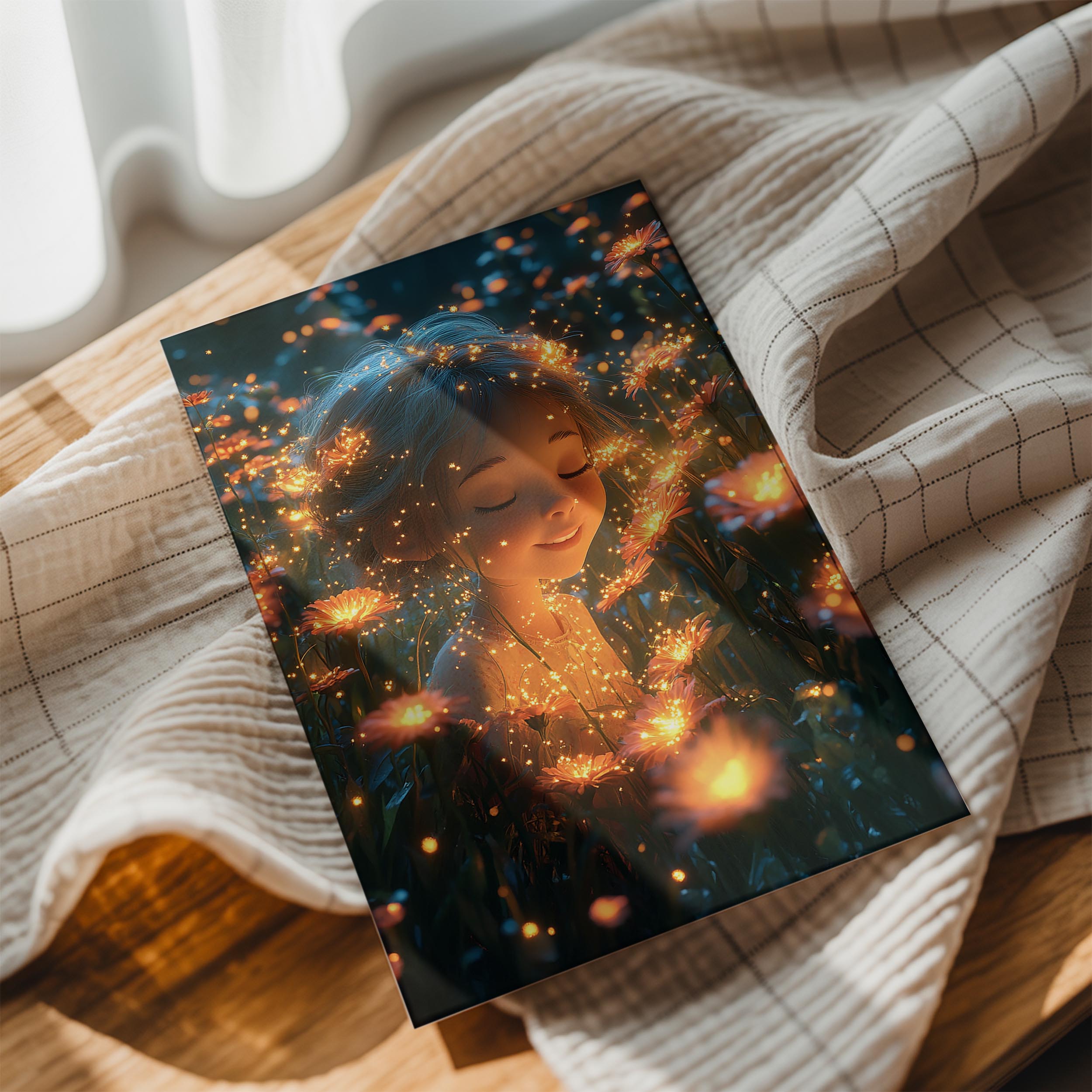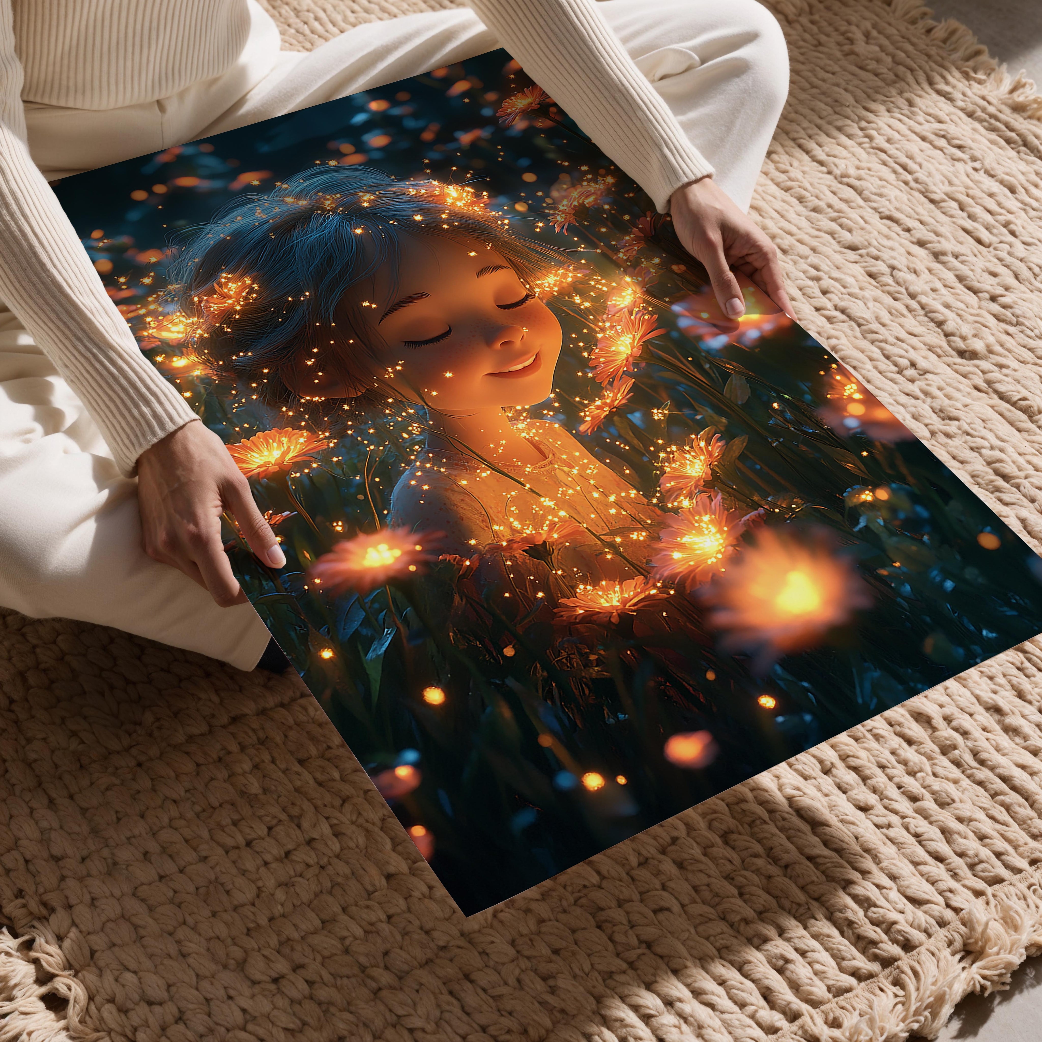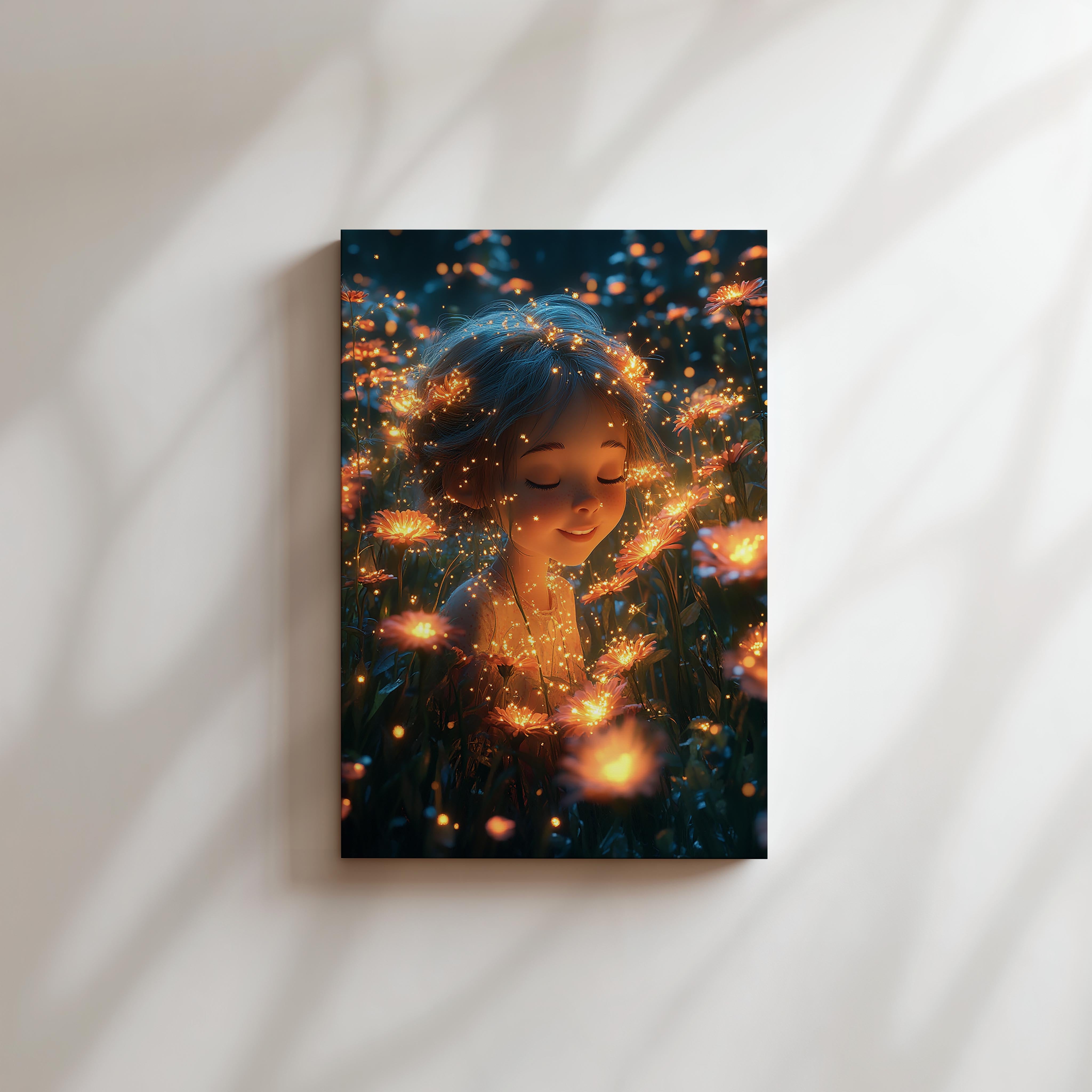 A magical depiction of a child surrounded by glowing flowers in a serene meadow. The soft lighting and sparkling details create an ethereal atmosphere, perfect for bedrooms, meditation spaces, or anyone drawn to the beauty of nature’s tranquility.