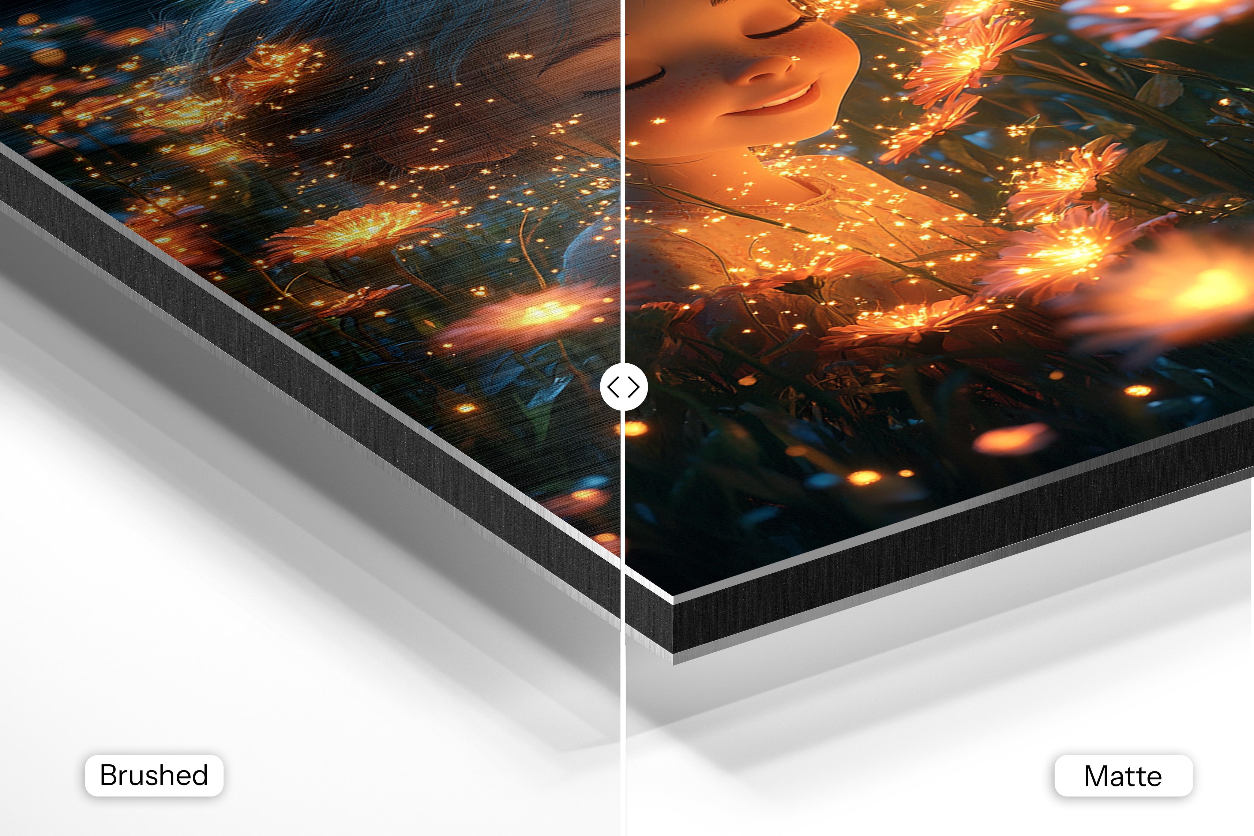 - Matte Aluminum offers a smooth, bright white surface that delivers crisp details and vibrant, true-to-life colors. With its non-reflective finish and subtle silky sheen, it’s perfect for photography, portraits, and colorful artwork—bringing a clean, polished look to any interior.