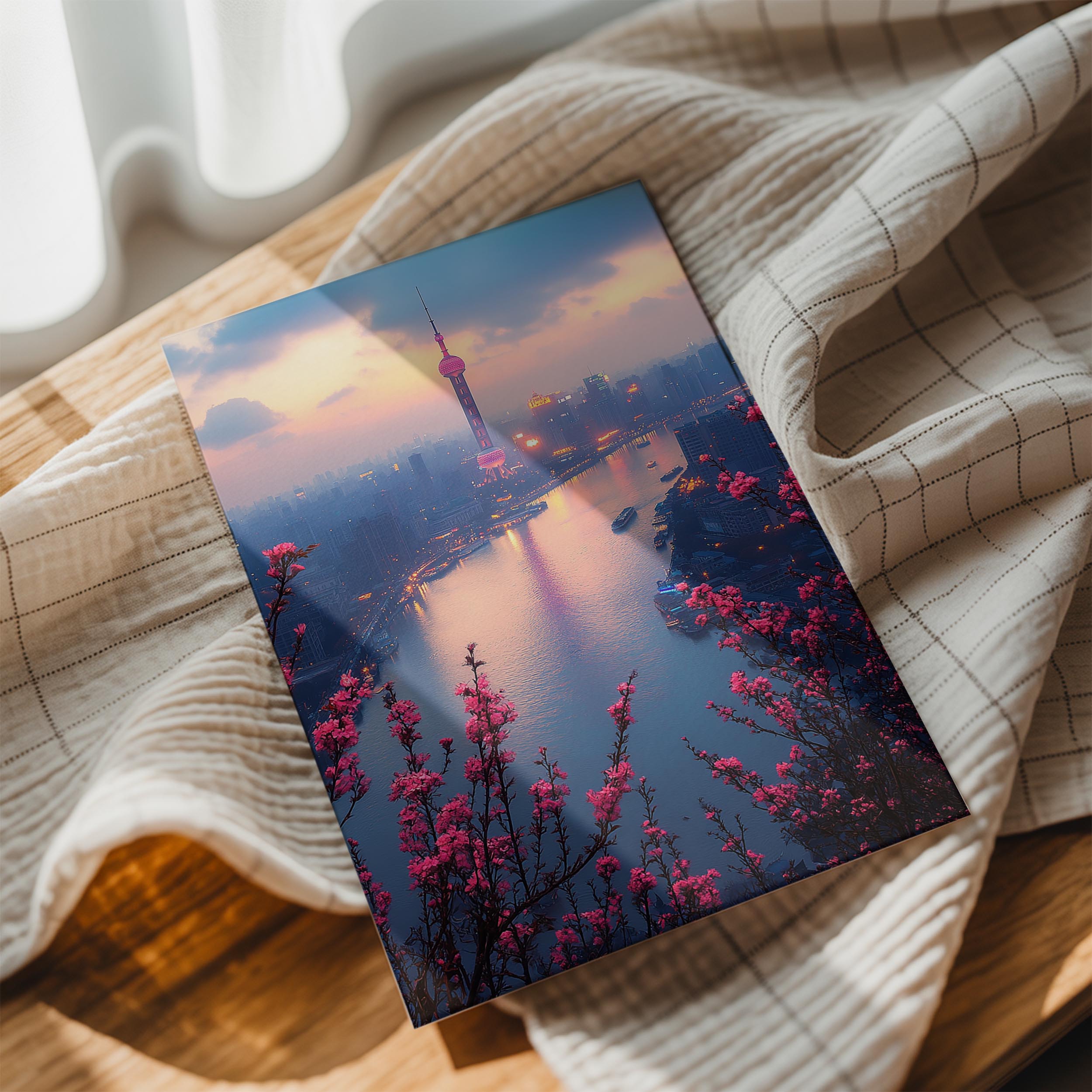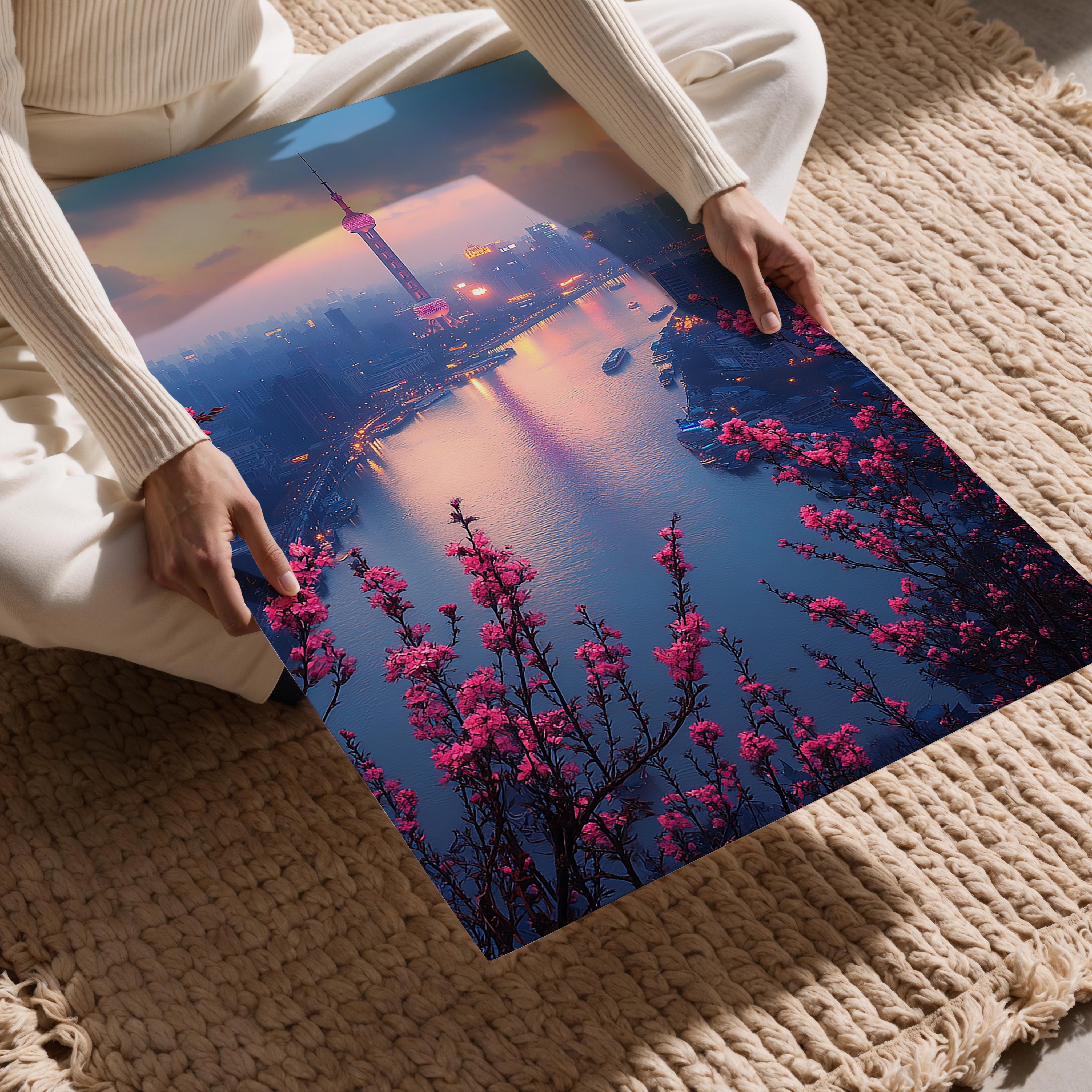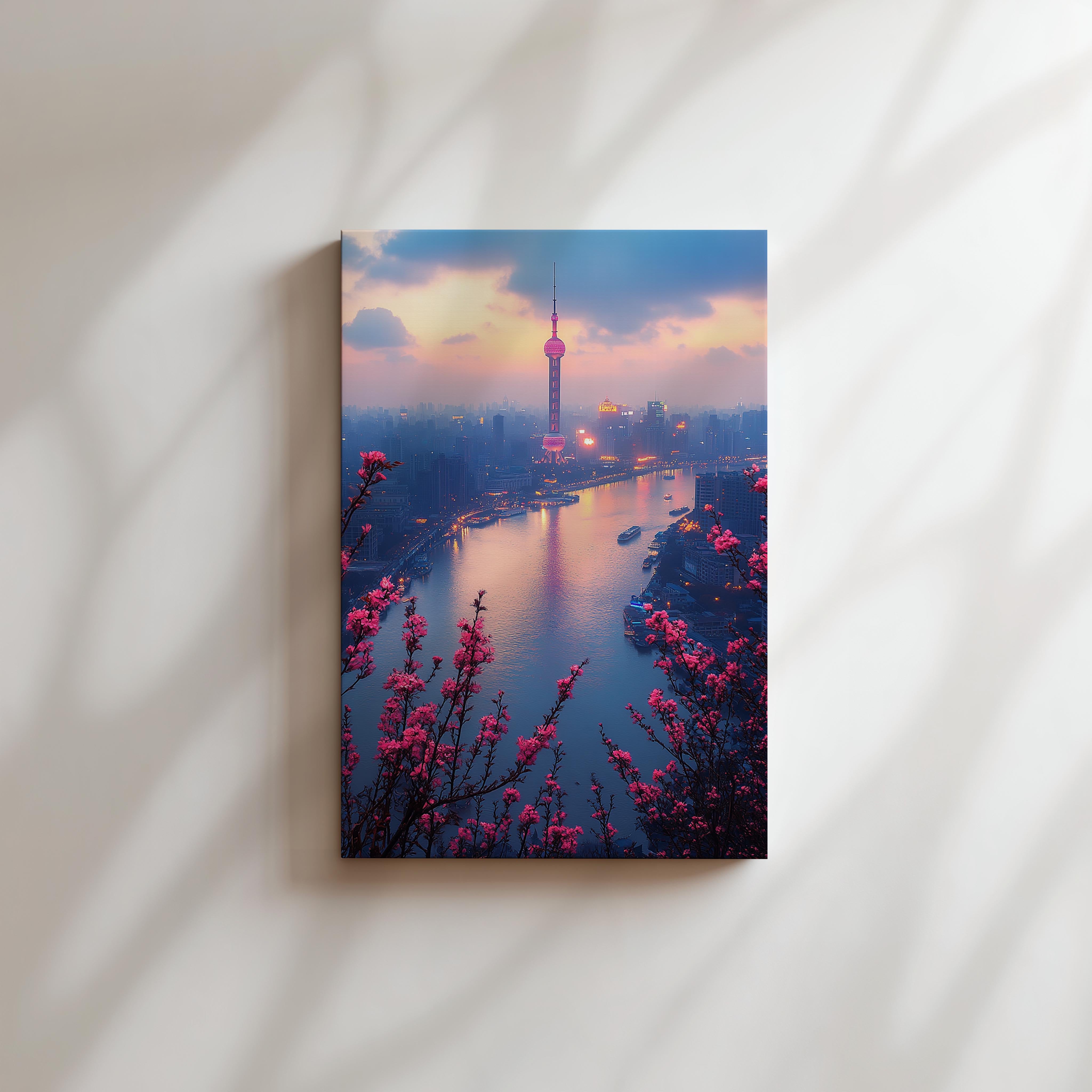 A picturesque view of the Shanghai skyline with cherry blossoms in the foreground. The tranquil river reflects the hues of a serene sunset, offering a perfect mix of urban sophistication and natural beauty. This image captures the charm of springtime and urban life, making it ideal for offices or homes seeking a calming yet dynamic visual statement.