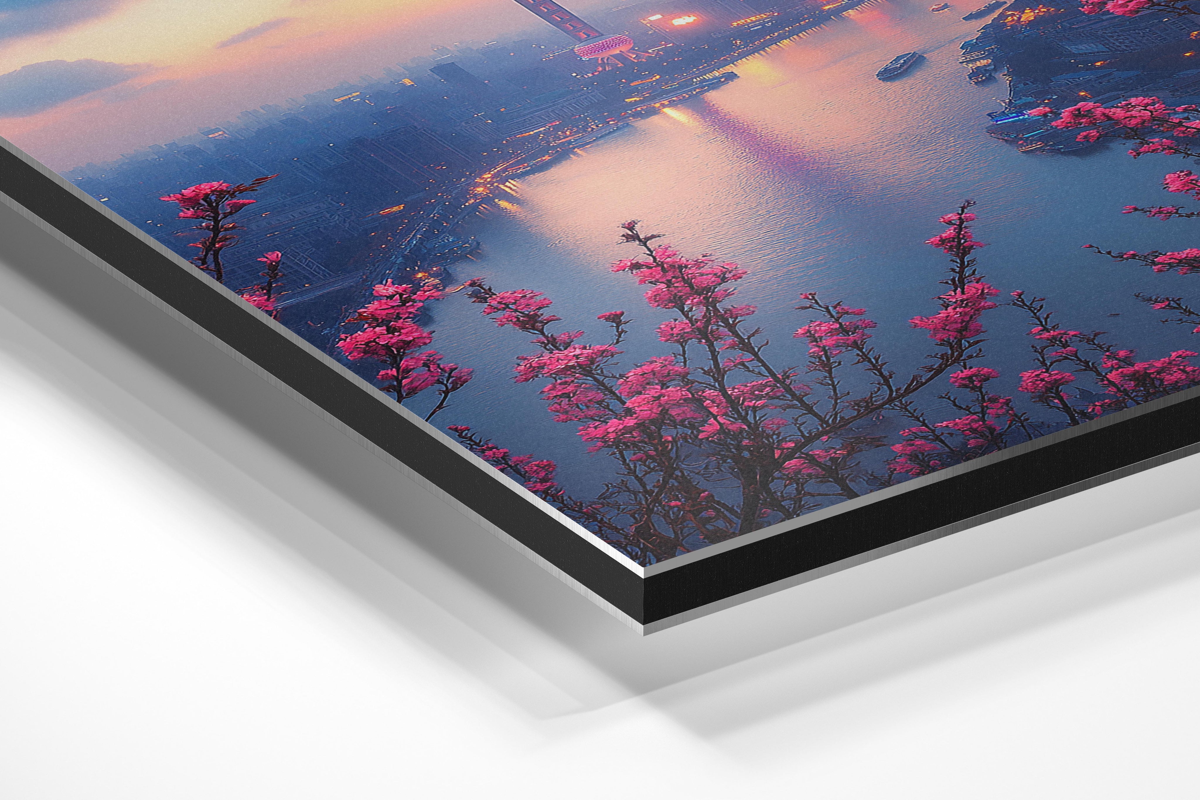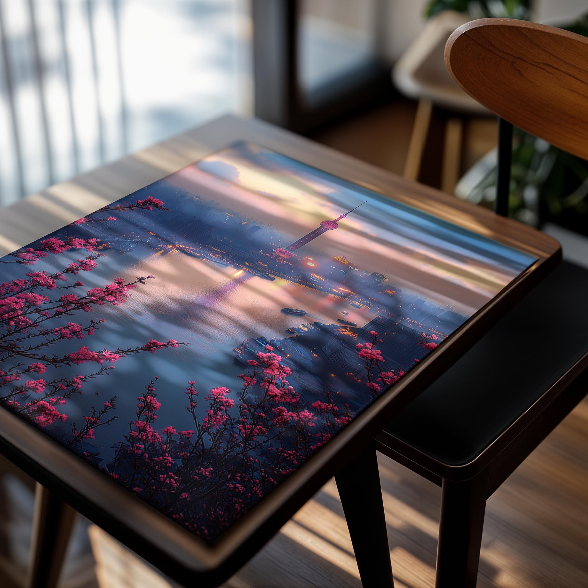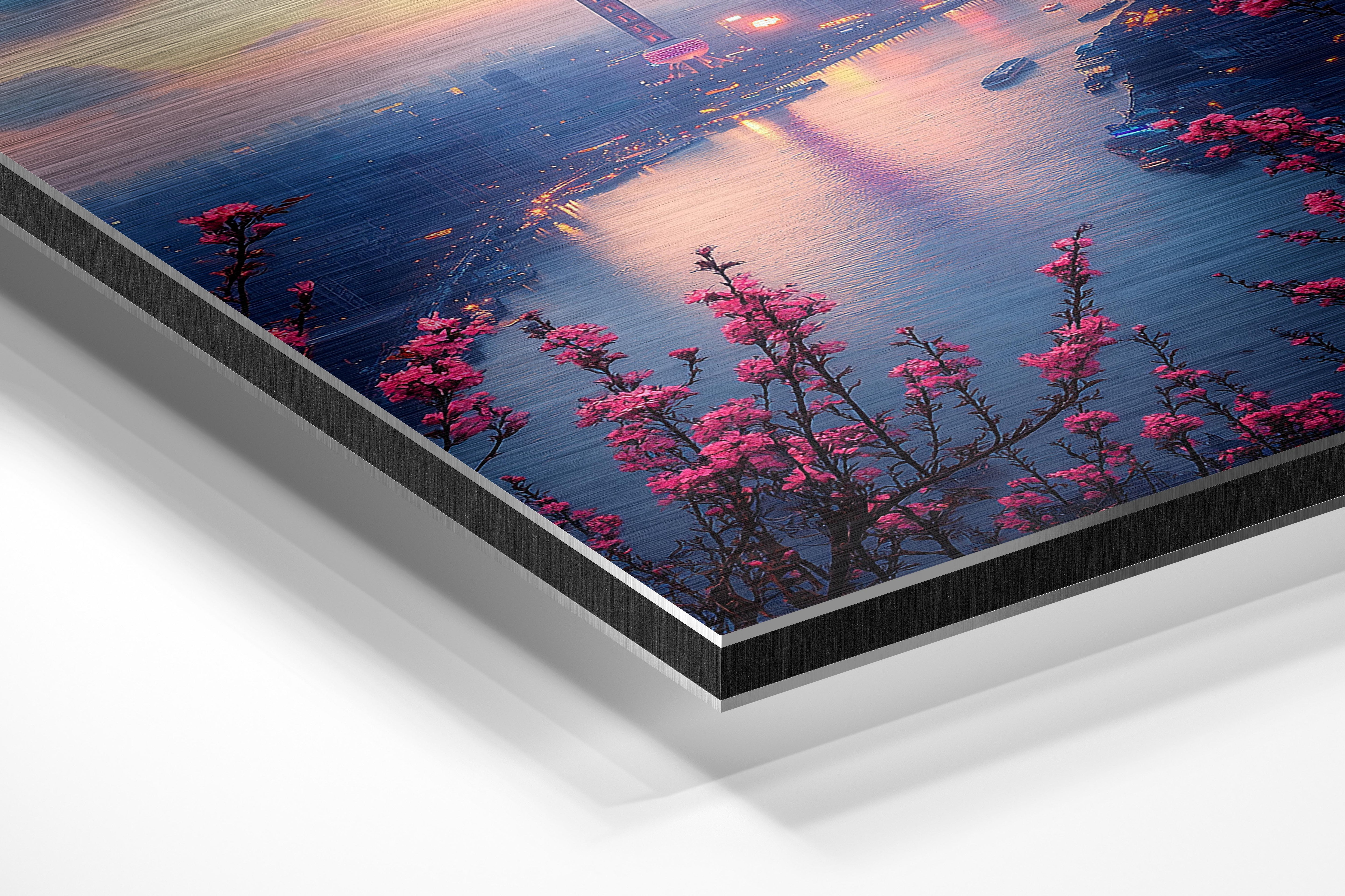 A picturesque view of the Shanghai skyline with cherry blossoms in the foreground. The tranquil river reflects the hues of a serene sunset, offering a perfect mix of urban sophistication and natural beauty. This image captures the charm of springtime and urban life, making it ideal for offices or homes seeking a calming yet dynamic visual statement.