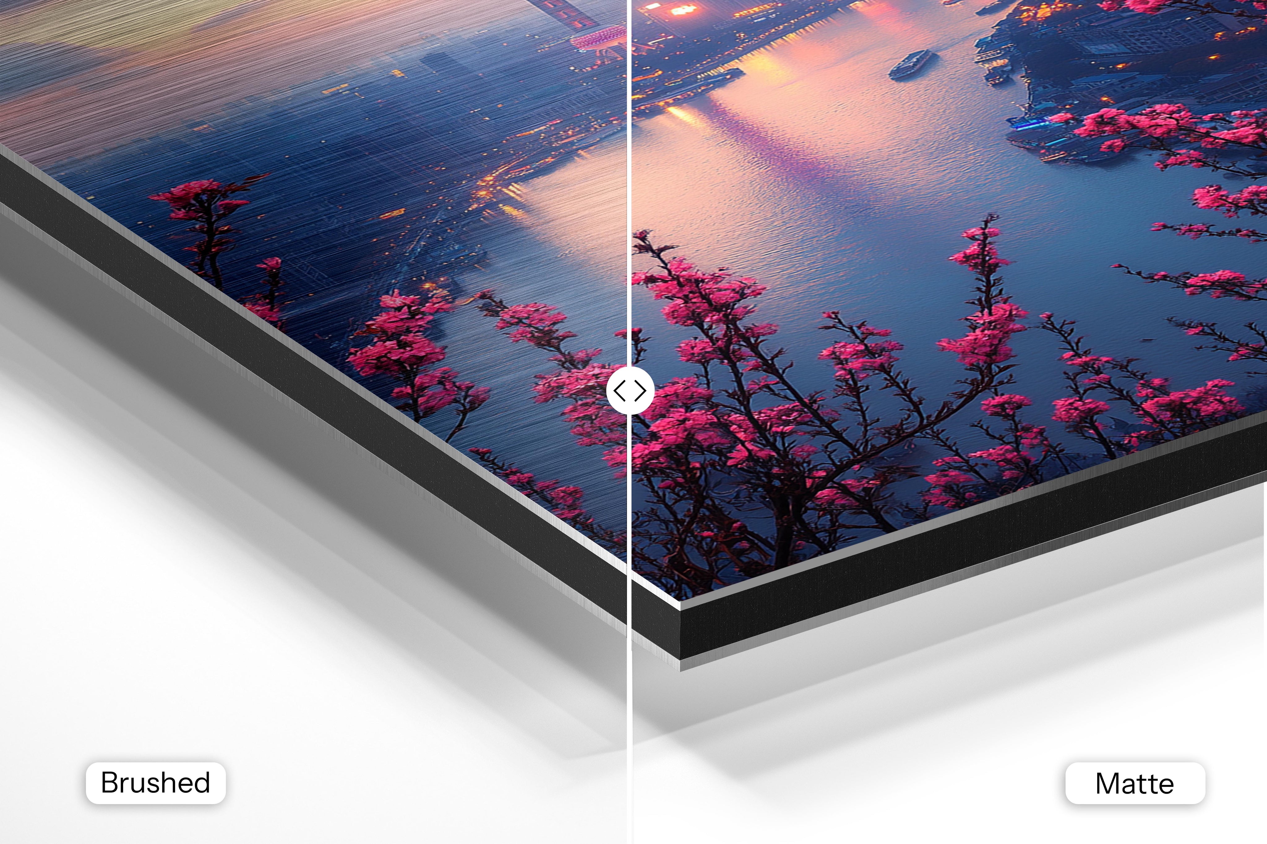 - Brushed Aluminum, on the other hand, features a raw metallic texture with visible brush strokes. Whites and highlights in your image let the silver surface show through, adding a dramatic, shimmering effect. Ideal for black-and-white images, minimalist designs, or abstract art, it creates a bold, industrial vibe with a modern edge.
