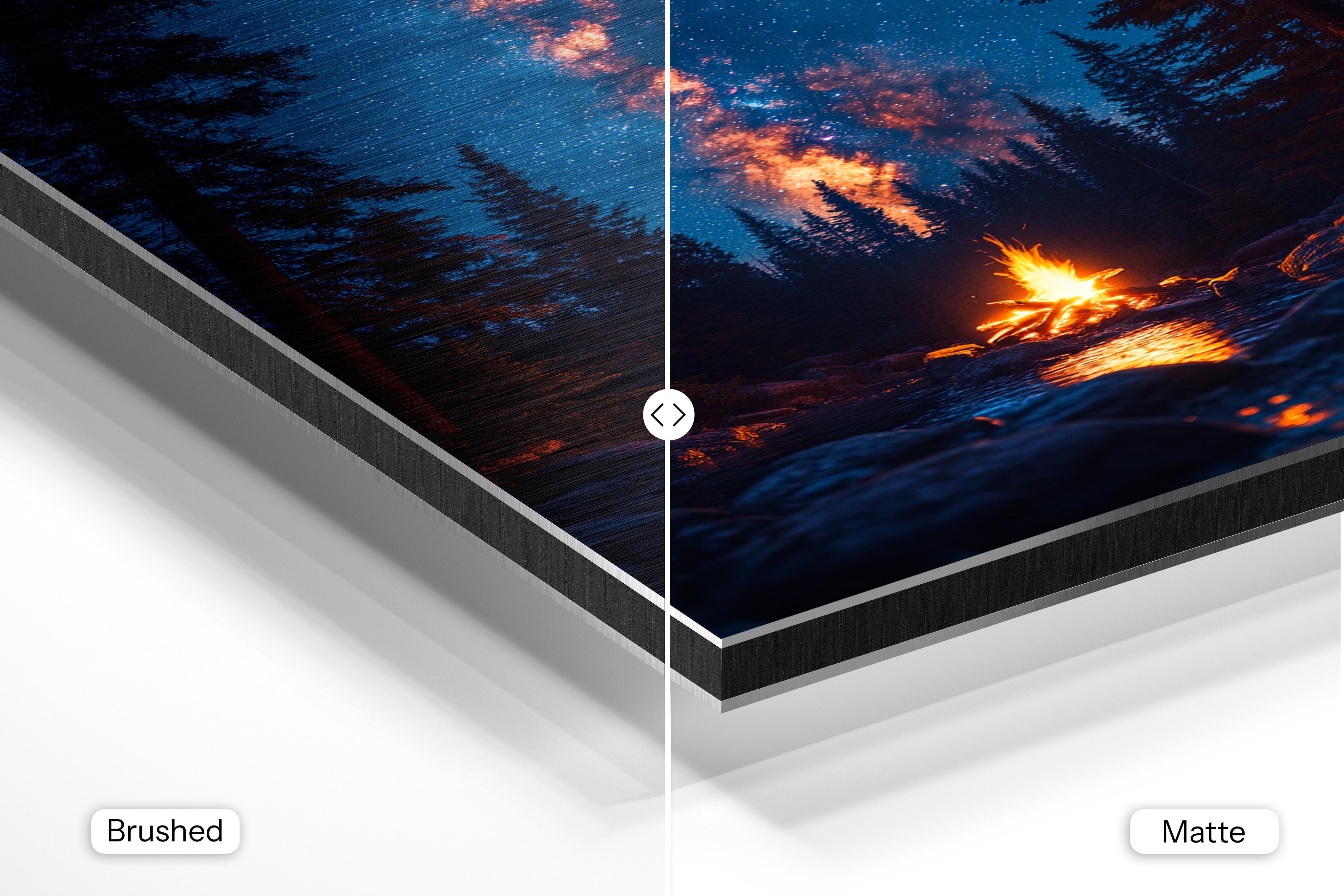 - Brushed Aluminum, on the other hand, features a raw metallic texture with visible brush strokes. Whites and highlights in your image let the silver surface show through, adding a dramatic, shimmering effect. Ideal for black-and-white images, minimalist designs, or abstract art, it creates a bold, industrial vibe with a modern edge.