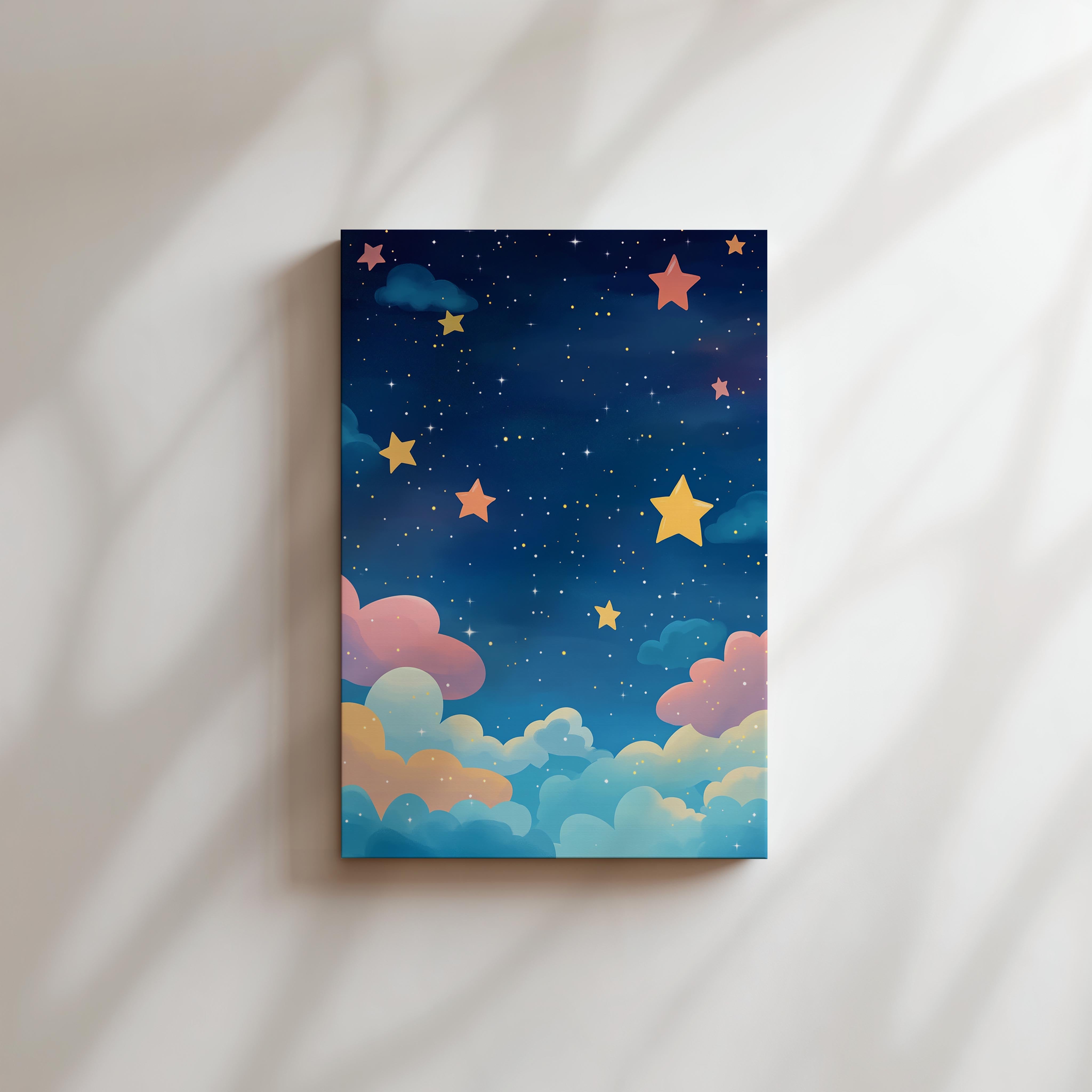 A serene depiction of a starry night sky with colorful clouds scattered across the horizon. The soft pinks, blues, and yellows create a peaceful and dreamy atmosphere, perfect for bedrooms or relaxation spaces. This artwork’s gentle tones and celestial theme make it a versatile choice for anyone who loves calm and tranquil settings. The whimsical stars and clouds add an enchanting touch to the overall composition.