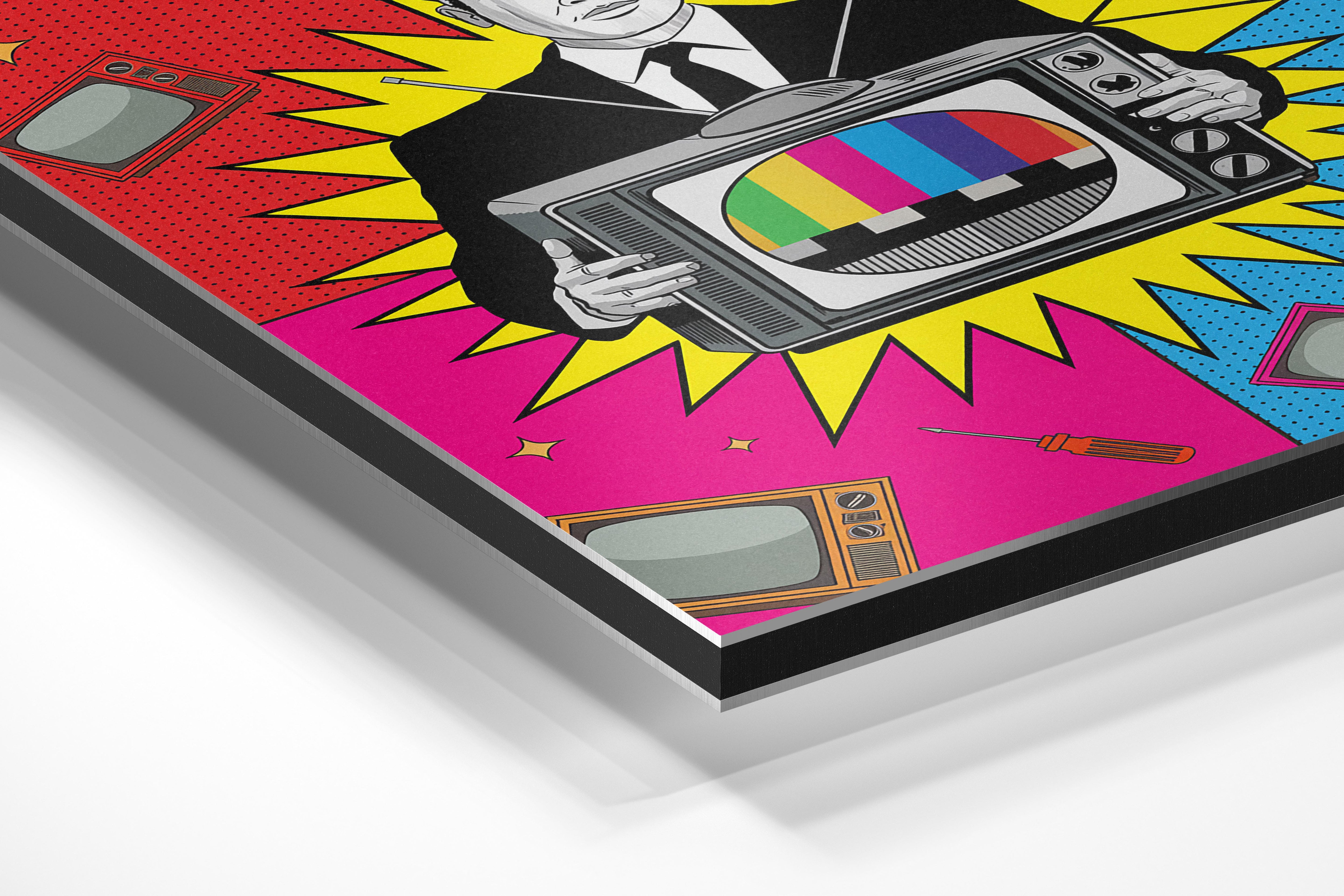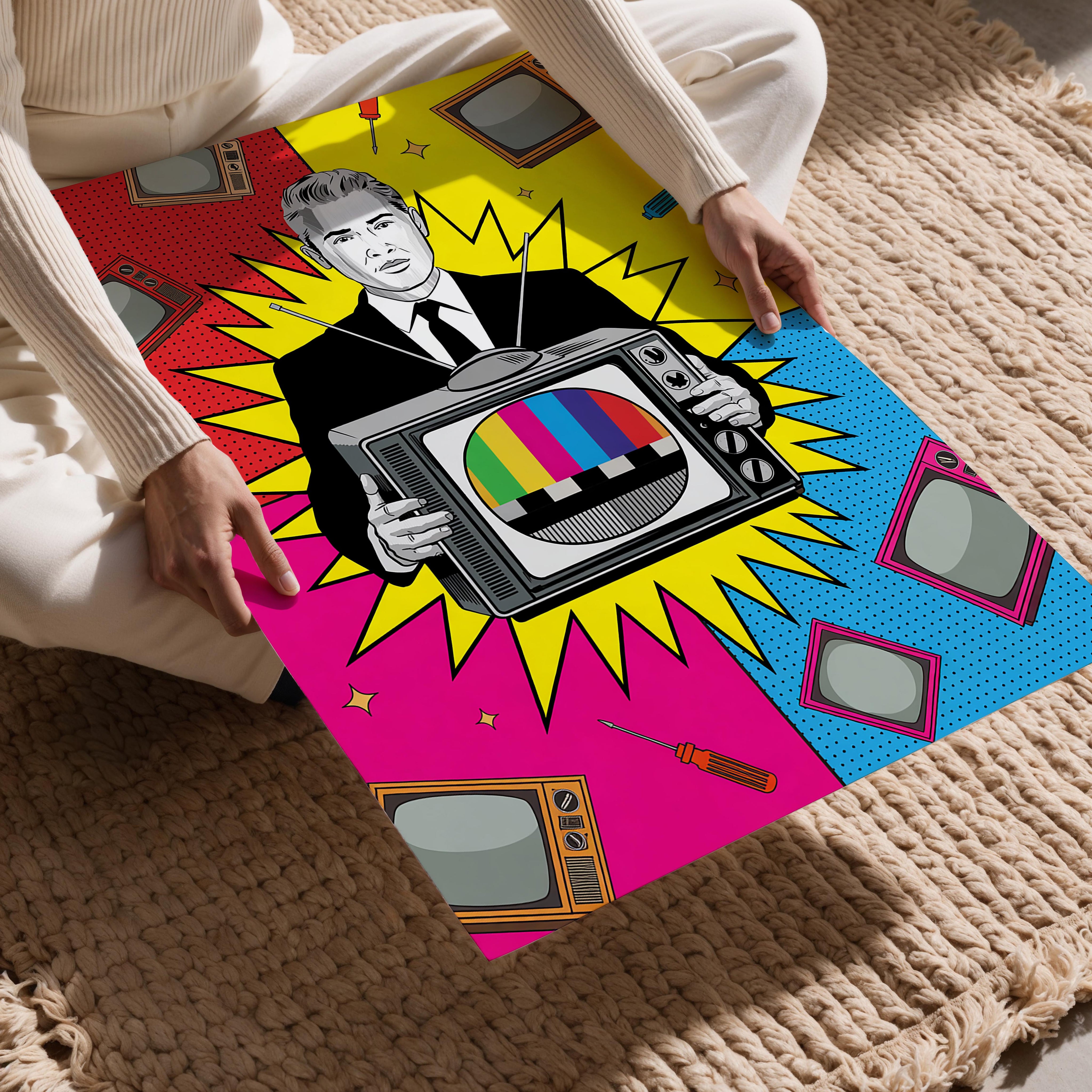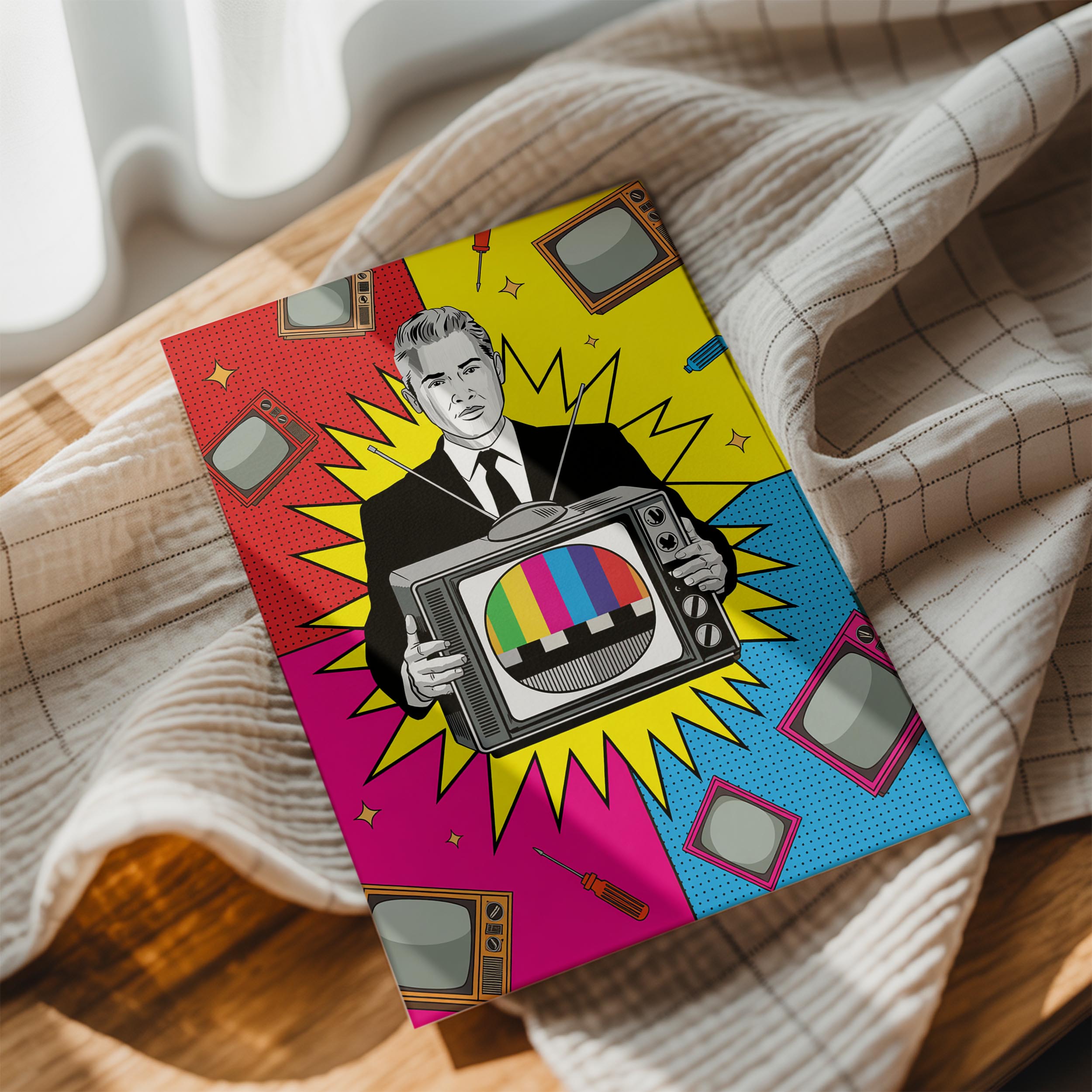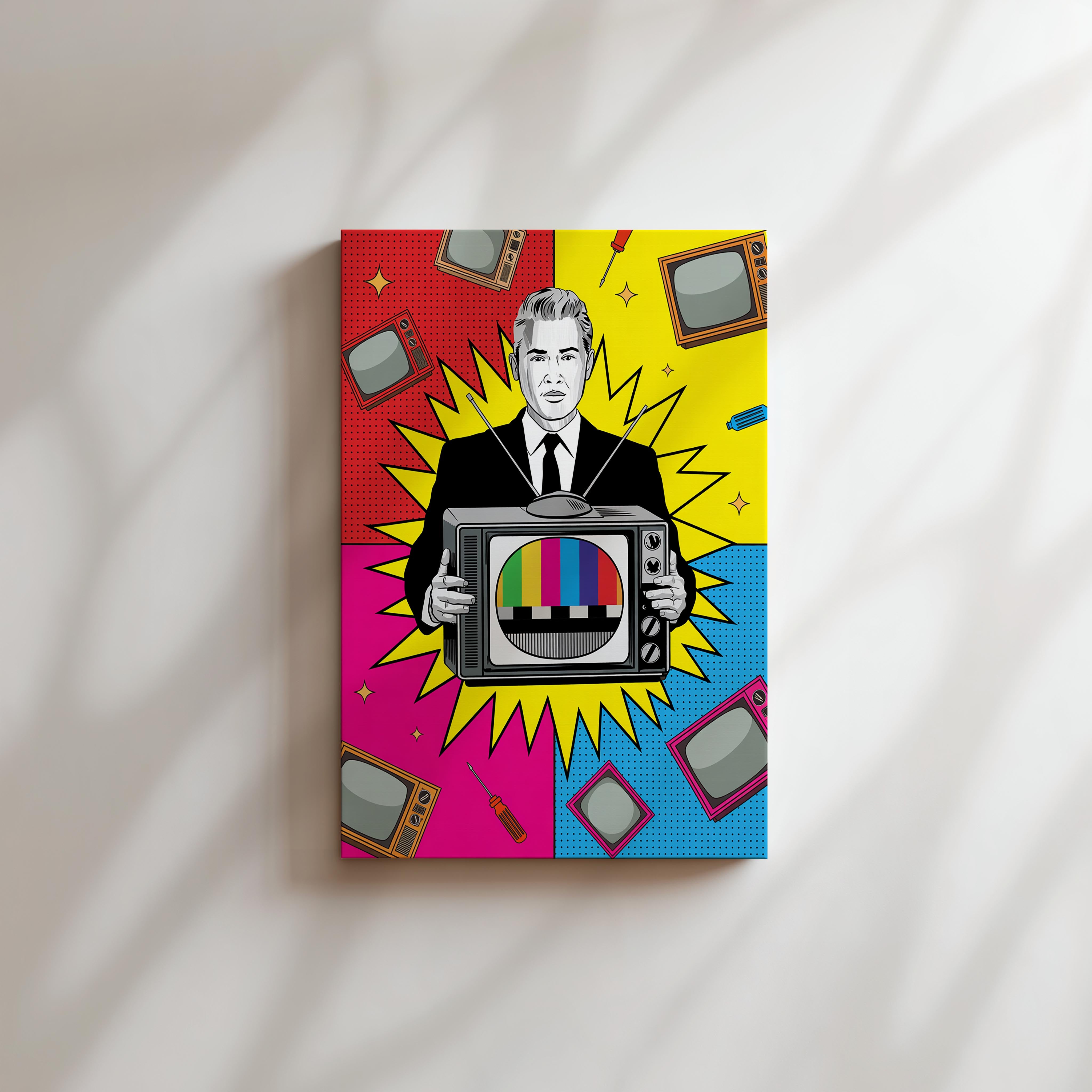 A black-and-white suited man holds a vintage television displaying a color bar test pattern in the center of a bright comic-style explosion. Around him float retro TVs and screwdrivers on a patchwork background of red, yellow, pink, and blue. This pop-art composition blends 20th-century broadcast nostalgia with modern design punch. Ideal for media rooms, home theaters, or creative offices, it resonates with retro tech lovers and design fans. The stark contrast of monochrome figure and colorful background draws the viewer’s focus, celebrating the golden era of analog screens.