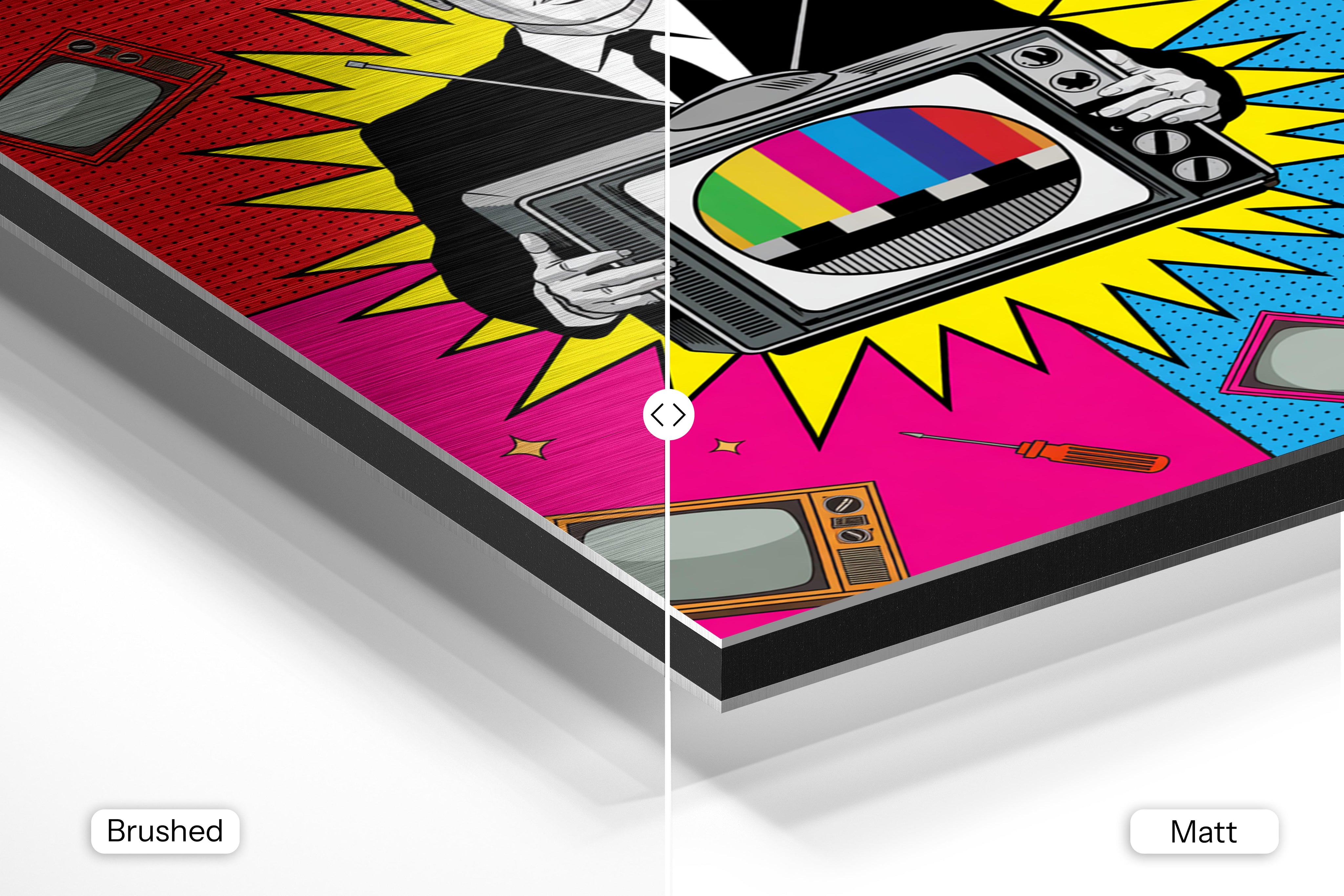 - Matte Aluminum offers a smooth, bright white surface that delivers crisp details and vibrant, true-to-life colors. With its non-reflective finish and subtle silky sheen, it’s perfect for photography, portraits, and colorful artwork—bringing a clean, polished look to any interior.