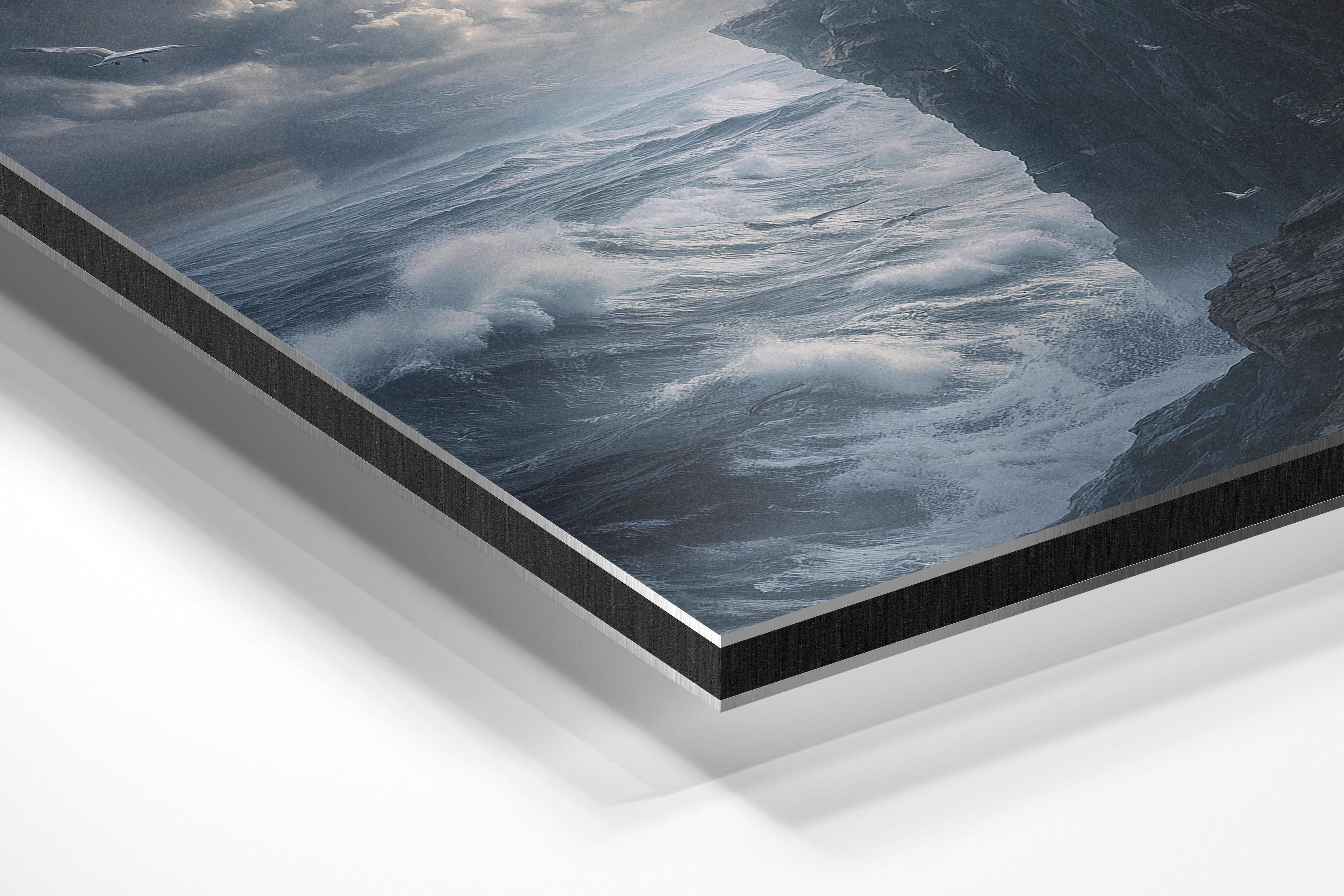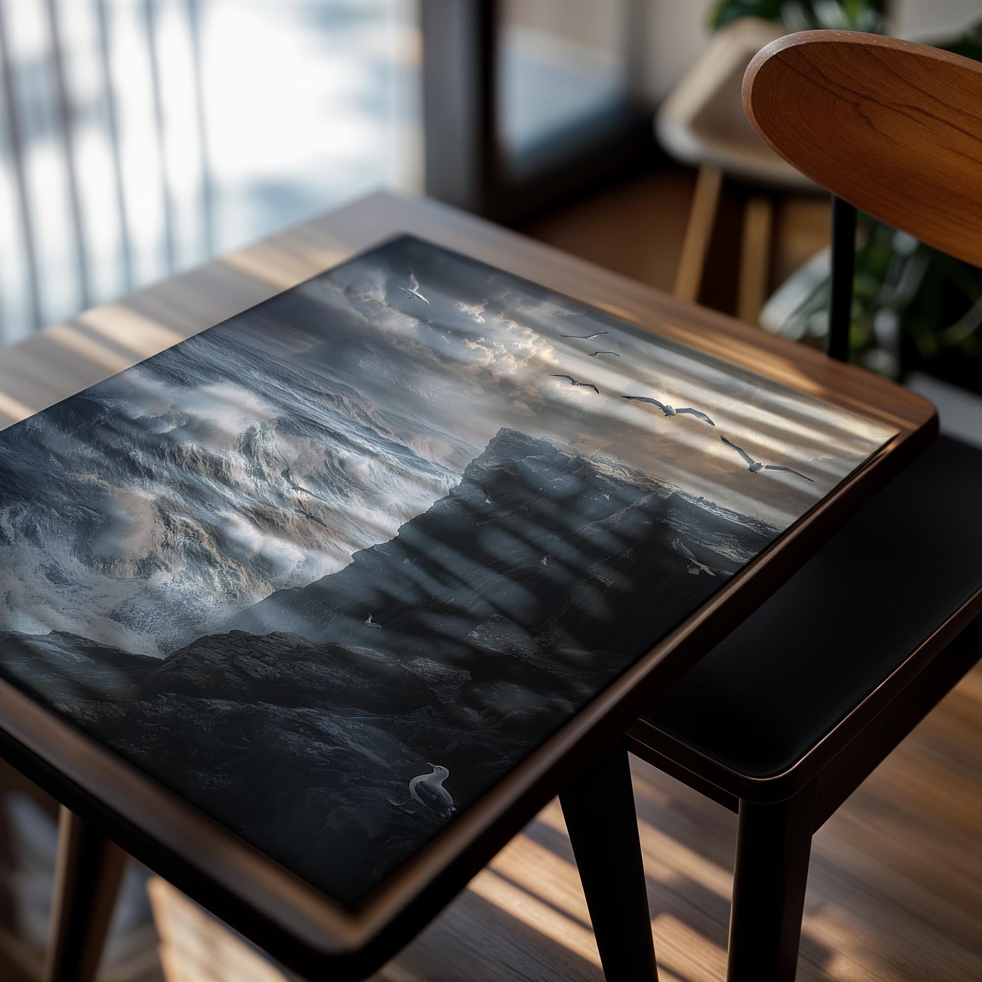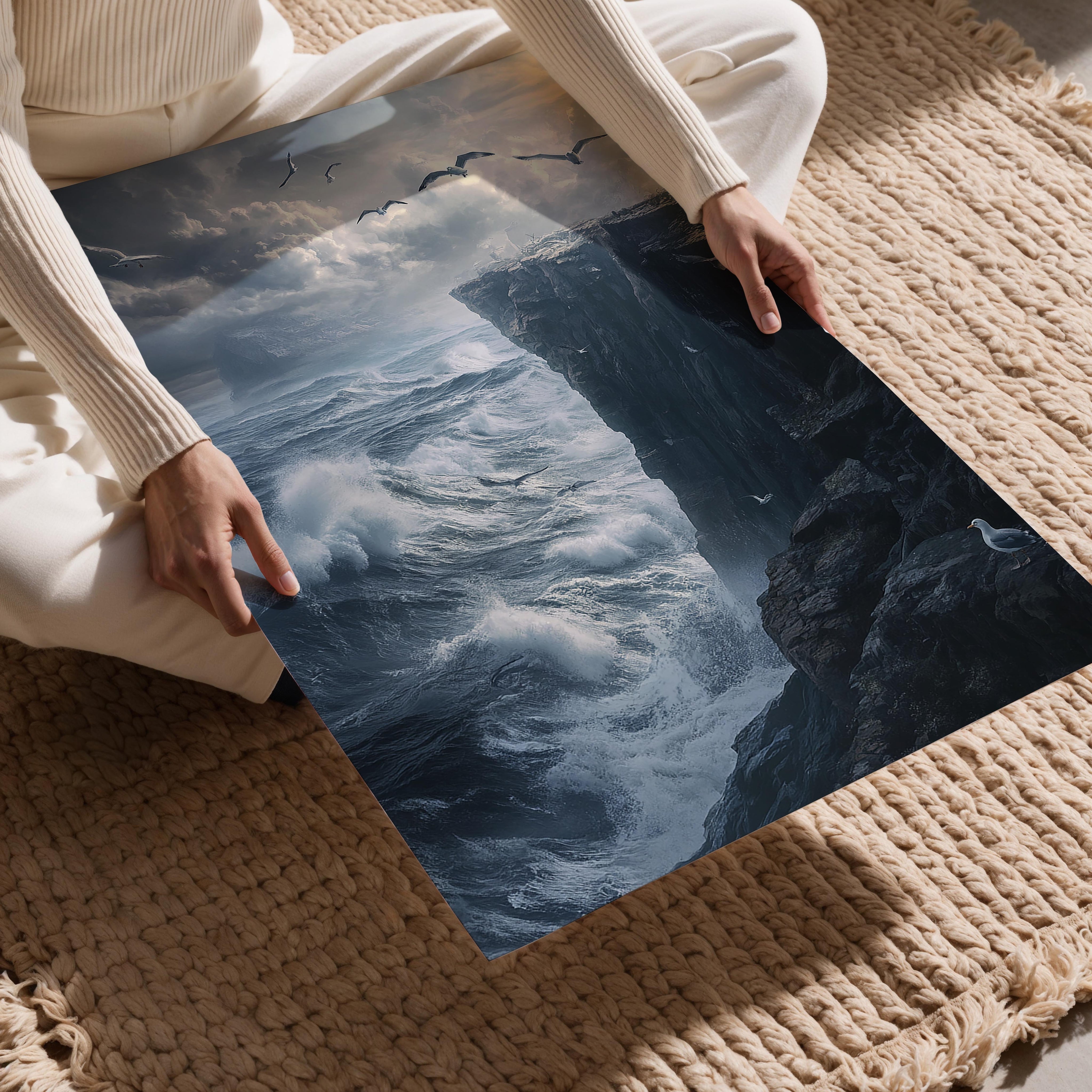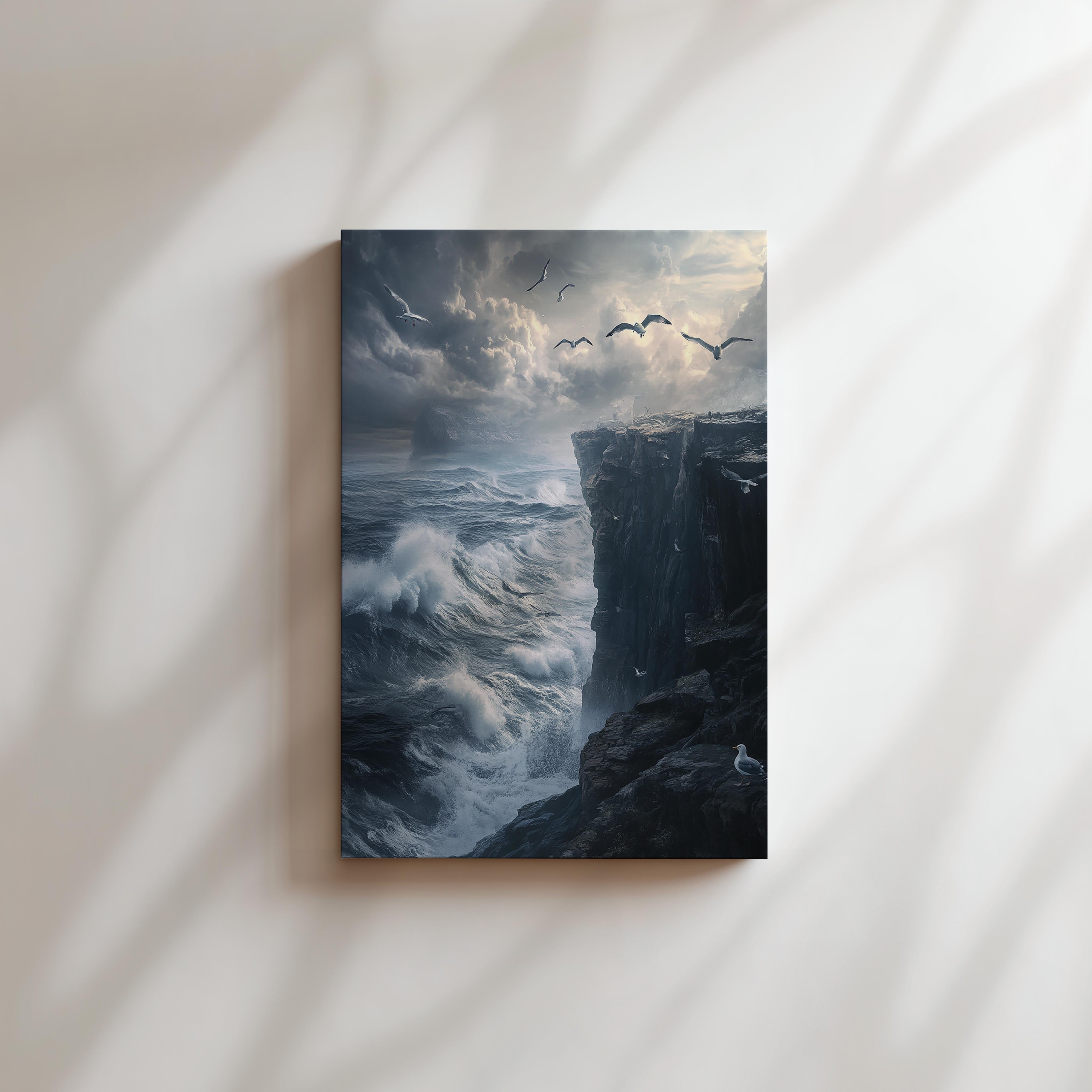 Waves crash against a rugged cliff under stormy skies, creating a dramatic scene of nature’s raw power and beauty. Gulls soar above the tumultuous waters, adding movement to the intense atmosphere. This image captures the untamed elegance of the sea, offering a sense of adventure and awe.