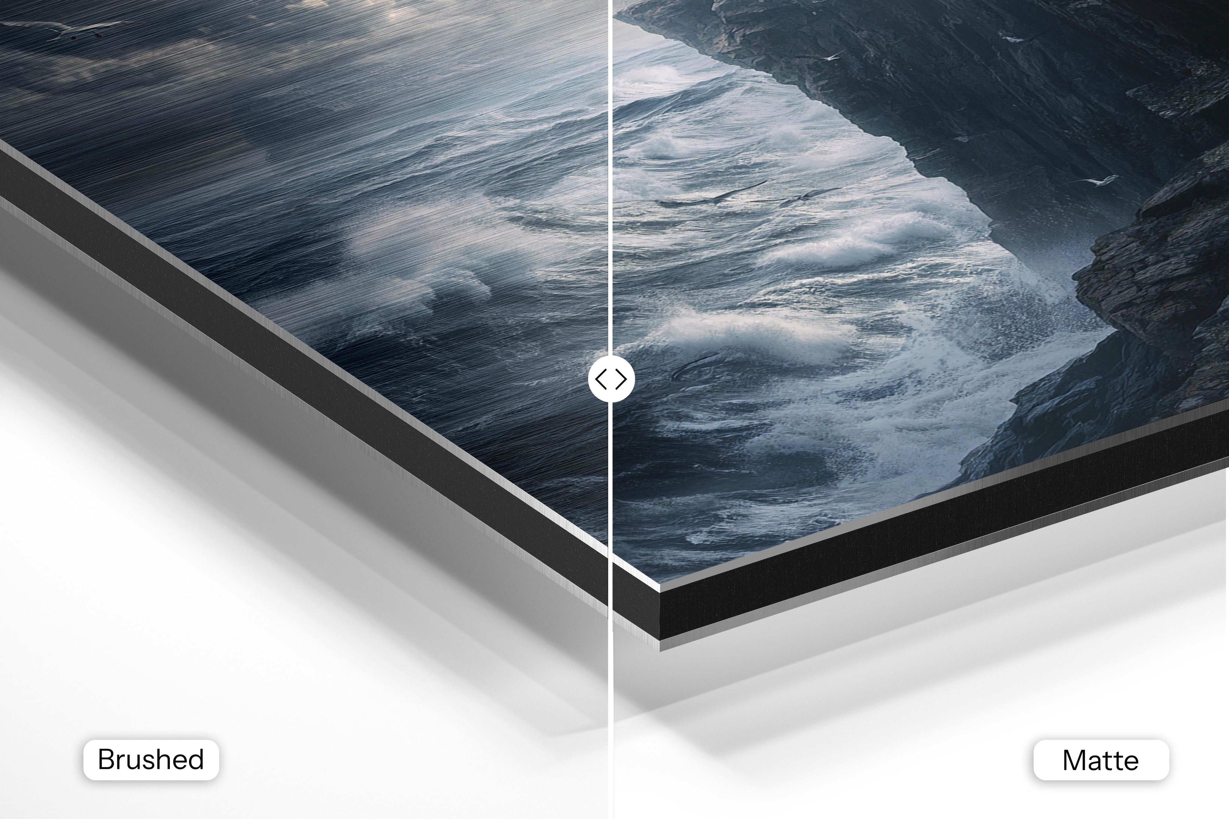 - Brushed Aluminum, on the other hand, features a raw metallic texture with visible brush strokes. Whites and highlights in your image let the silver surface show through, adding a dramatic, shimmering effect. Ideal for black-and-white images, minimalist designs, or abstract art, it creates a bold, industrial vibe with a modern edge.