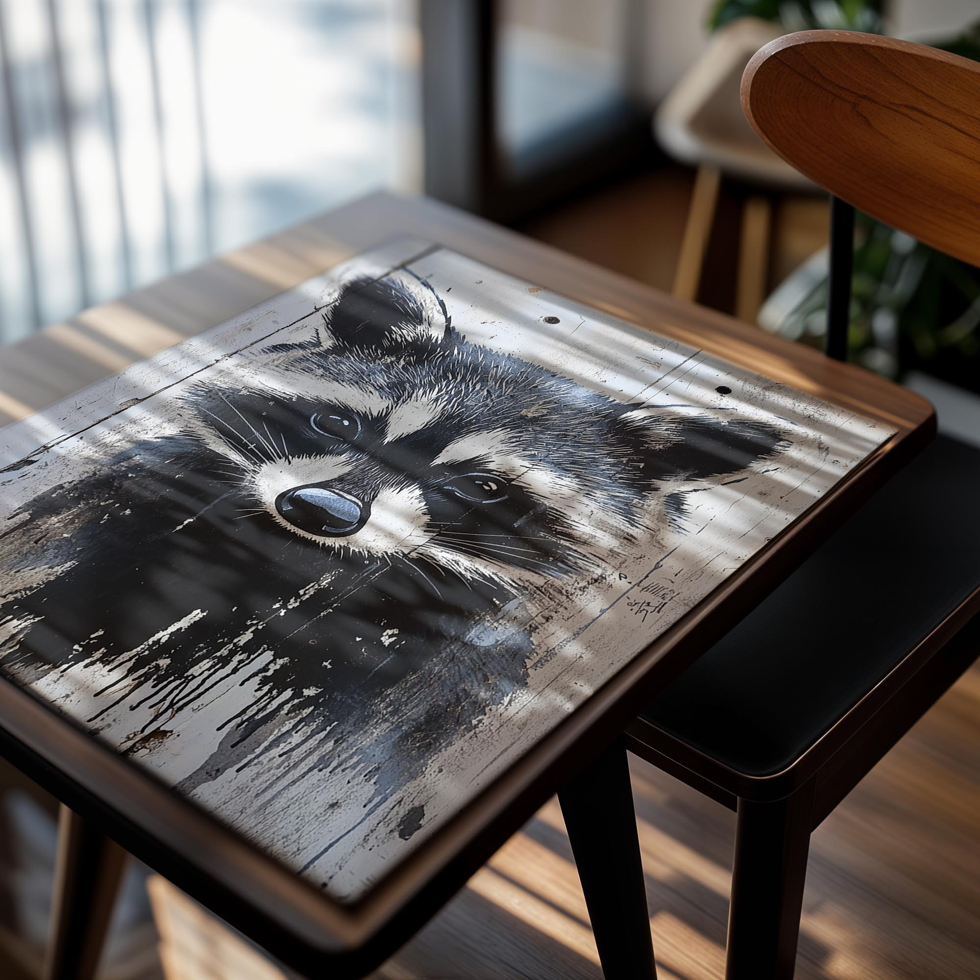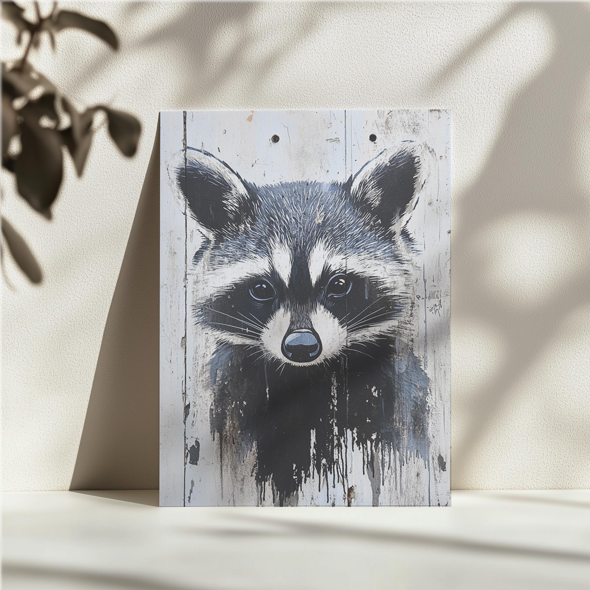 This monochrome urban-style artwork of a raccoon has a graffiti-inspired aesthetic. The expressive eyes and detailed fur are contrasted against a rough, weathered wooden backdrop, giving the piece a street-art edge. The dripping paint effect adds to the grunge appeal, making it ideal for a contemporary or industrial-styled space. Whether displayed in a loft, a creative studio, or an urban-inspired home, this piece brings an edgy yet artistic presence to the environment.