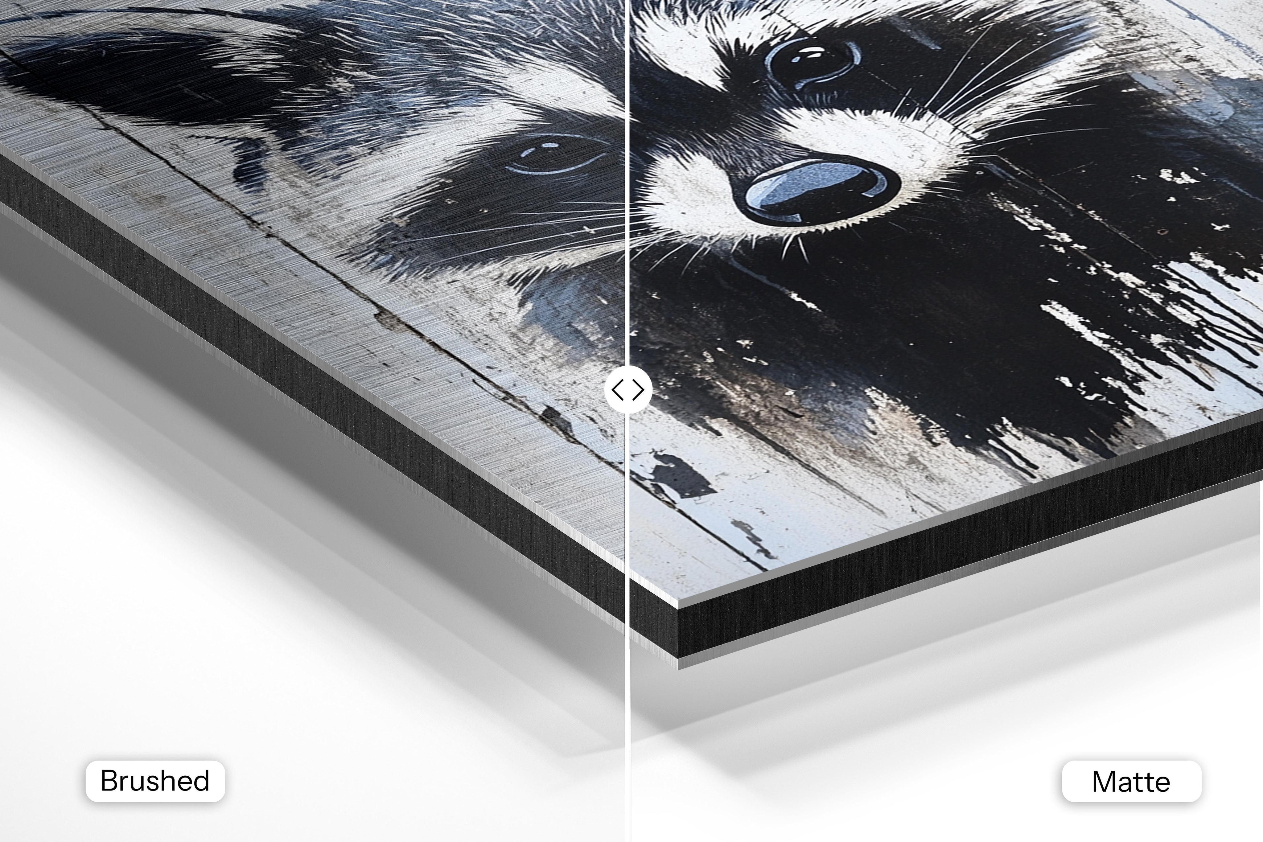 - Brushed Aluminum, on the other hand, features a raw metallic texture with visible brush strokes. Whites and highlights in your image let the silver surface show through, adding a dramatic, shimmering effect. Ideal for black-and-white images, minimalist designs, or abstract art, it creates a bold, industrial vibe with a modern edge.