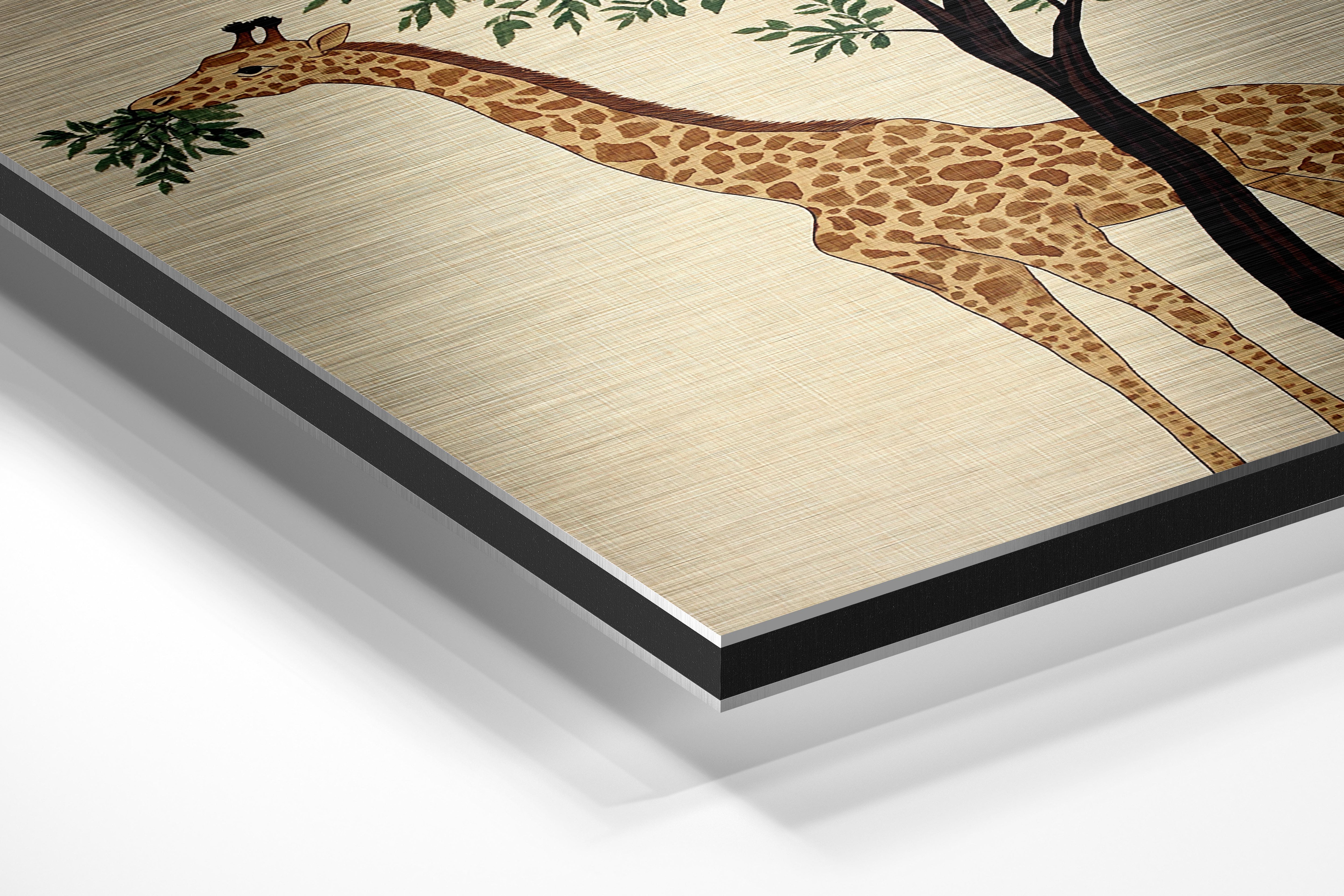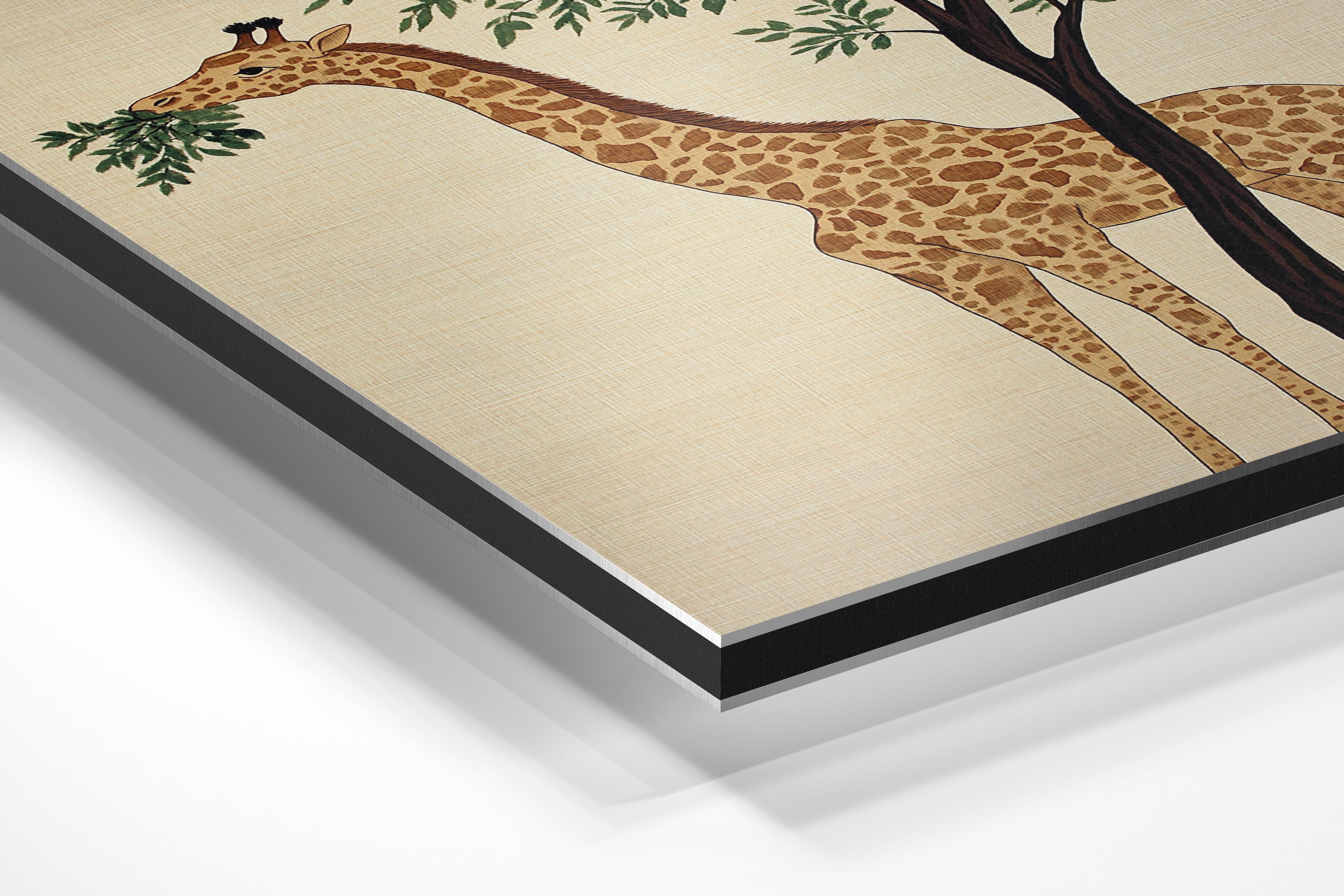 This charming stylized giraffe illustration features the animal standing beside a tree, seamlessly blending natural and geometric elements in an artistic way. The minimalist yet detailed composition makes it an excellent piece for modern, contemporary, or bohemian interiors. The texture and vintage paper-like background add a timeless appeal, ideal for those who appreciate artistic renditions of wildlife.