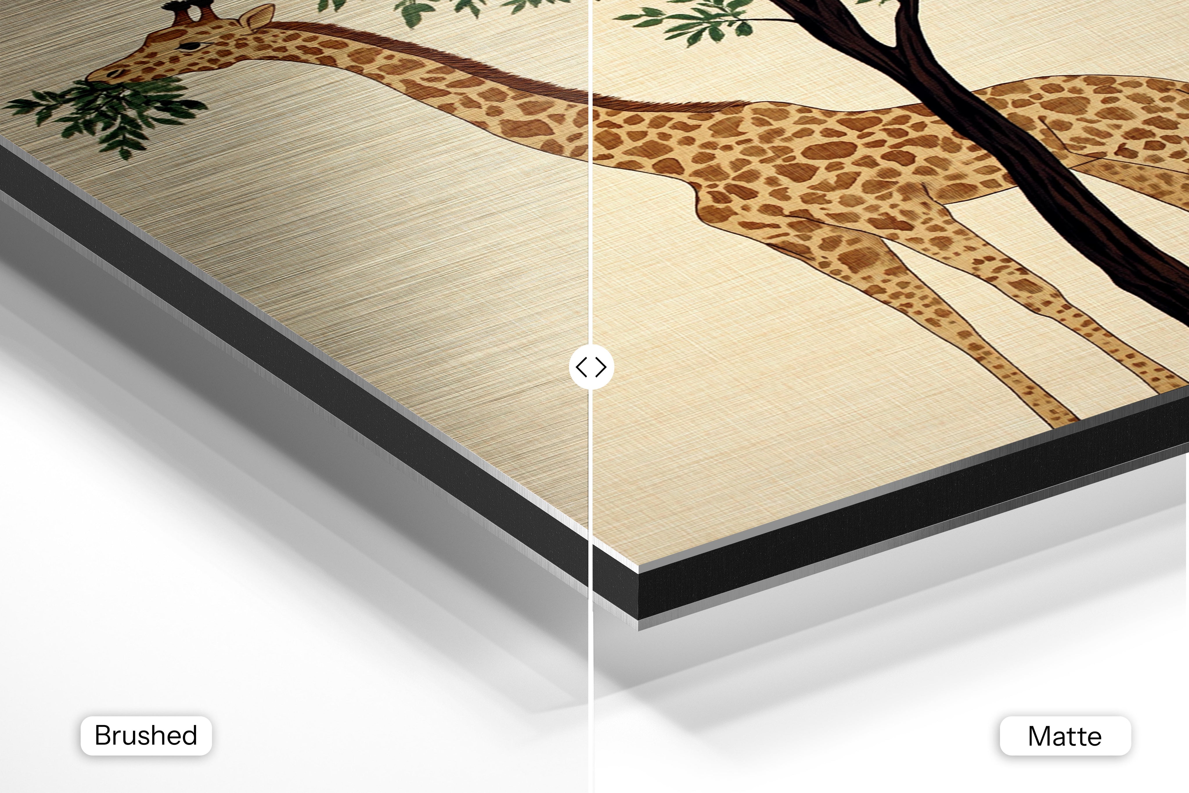 - Brushed Aluminum, on the other hand, features a raw metallic texture with visible brush strokes. Whites and highlights in your image let the silver surface show through, adding a dramatic, shimmering effect. Ideal for black-and-white images, minimalist designs, or abstract art, it creates a bold, industrial vibe with a modern edge.