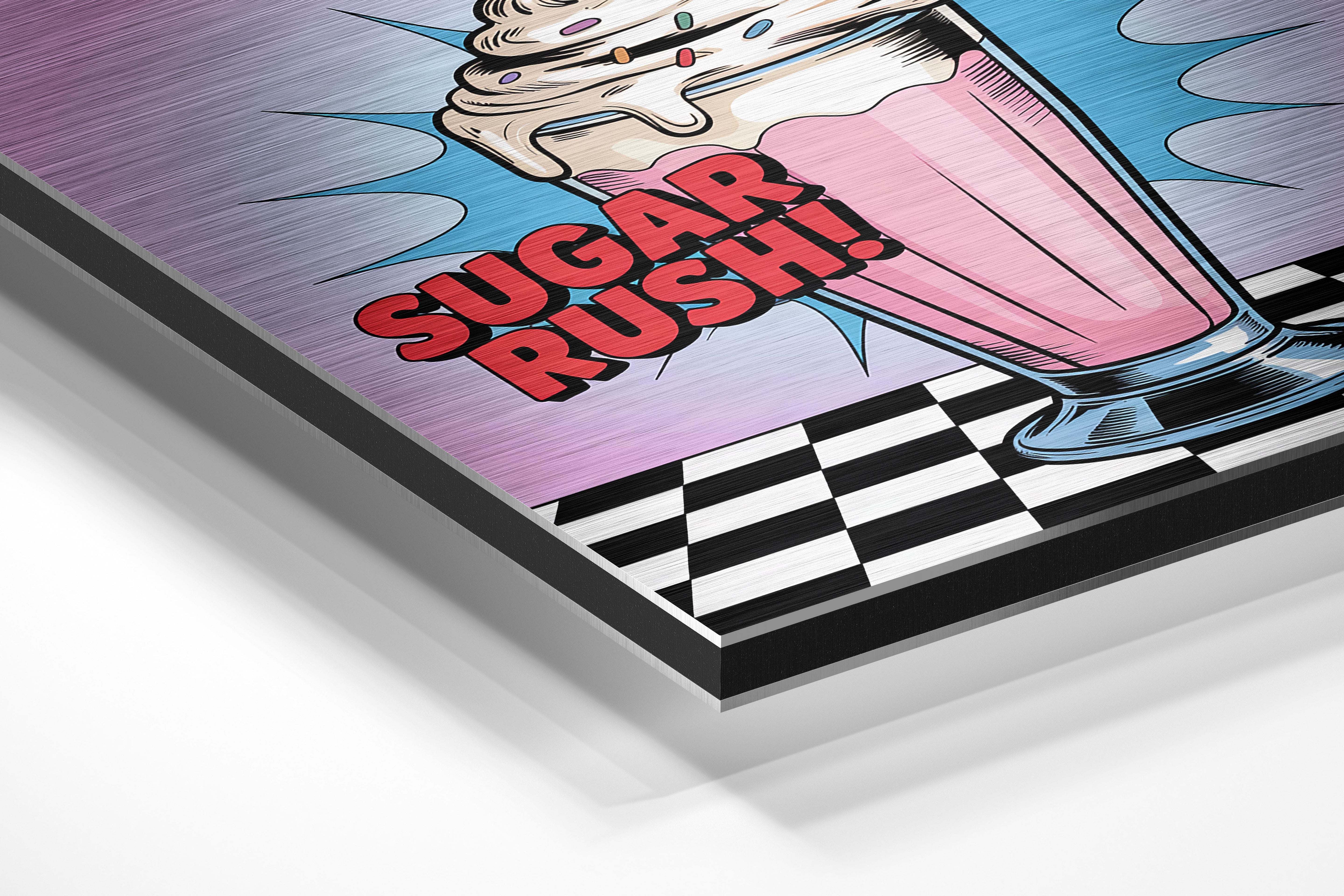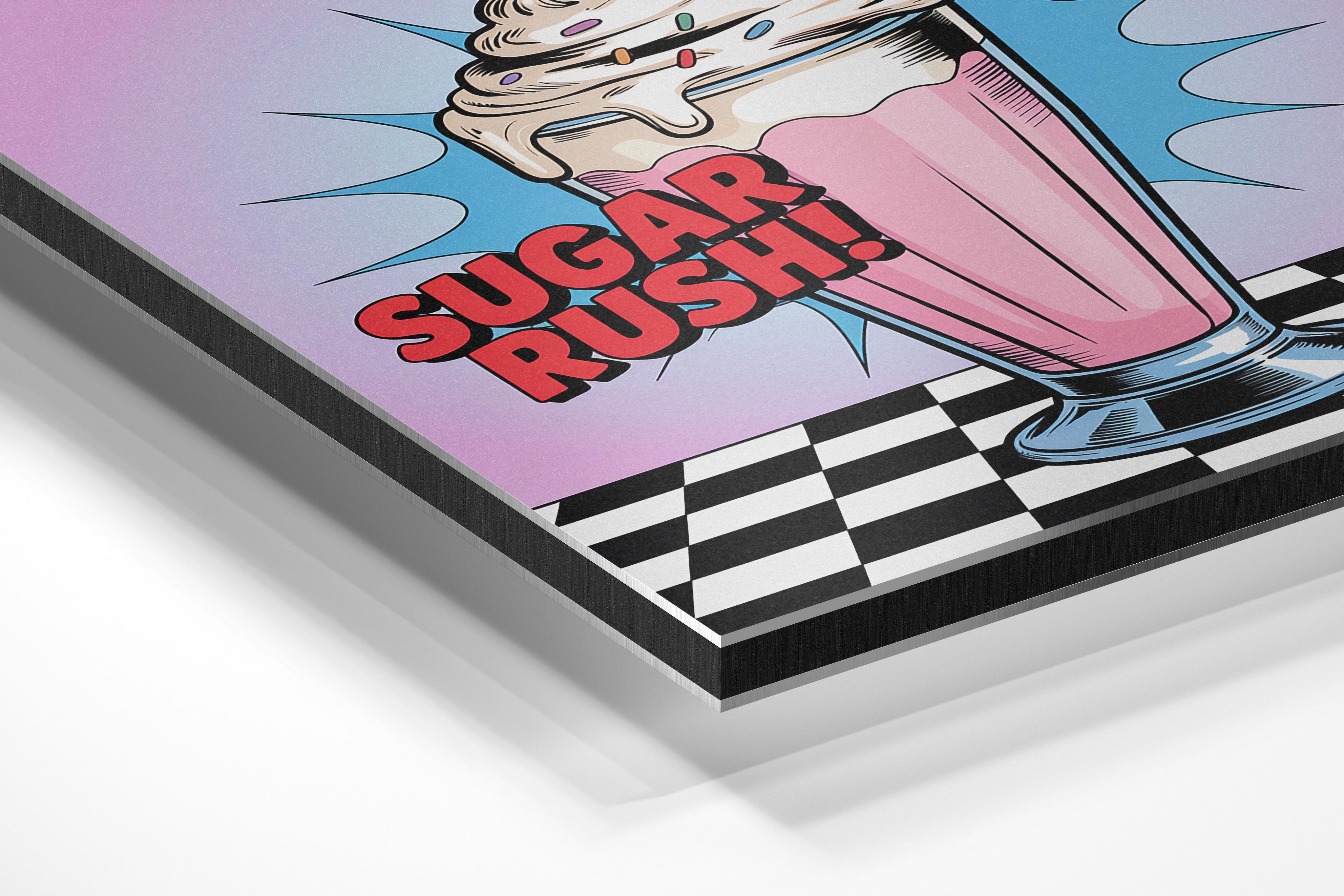 A towering pink milkshake crowned with whipped cream, sprinkles, a cherry, and a straw bursts from a comic-style background. With “SUGAR RUSH!” emblazoned beside it, the artwork turns dessert into a full sensory event. The checkered floor and bold pastels recall vintage diners and soda fountains. Ideal for dessert parlors, retro kitchens, or fans of kitschy Americana, this piece is sweet, nostalgic, and instantly fun. It’s a delicious explosion of flavor and style.
