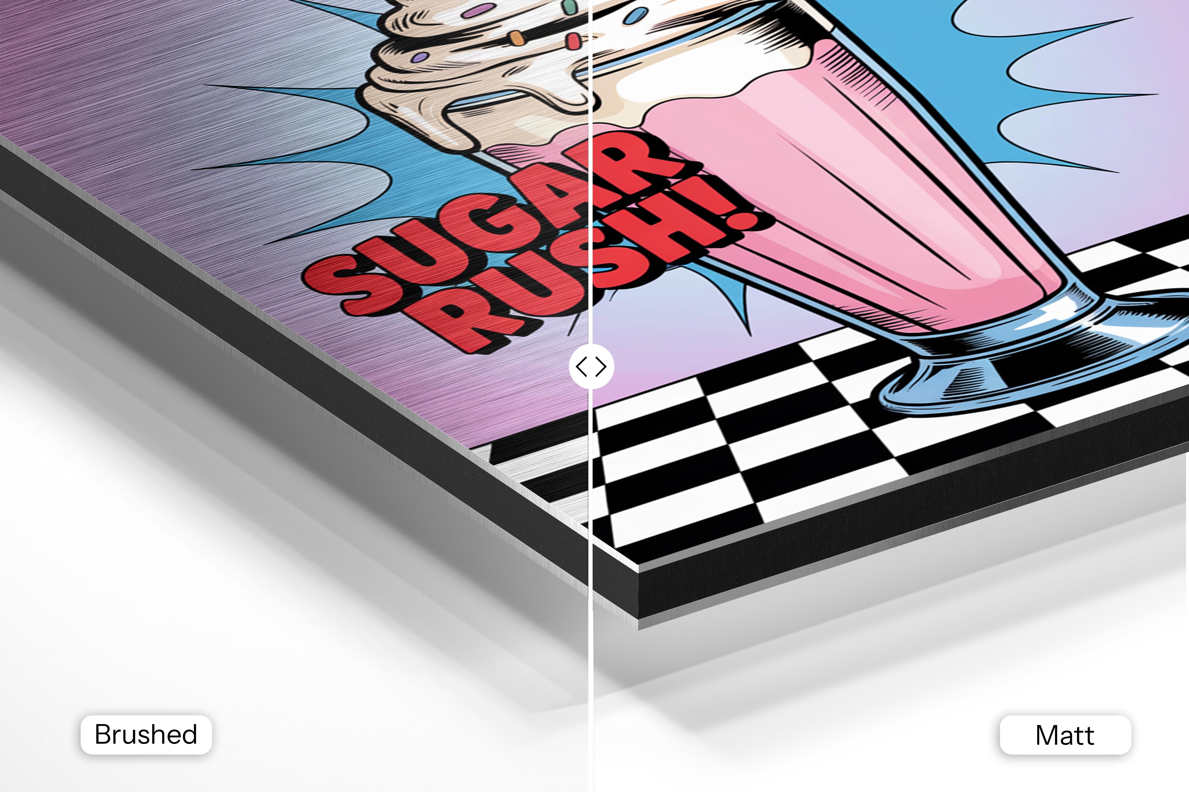 - Brushed Aluminum, on the other hand, features a raw metallic texture with visible brush strokes. Whites and highlights in your image let the silver surface show through, adding a dramatic, shimmering effect. Ideal for black-and-white images, minimalist designs, or abstract art, it creates a bold, industrial vibe with a modern edge.