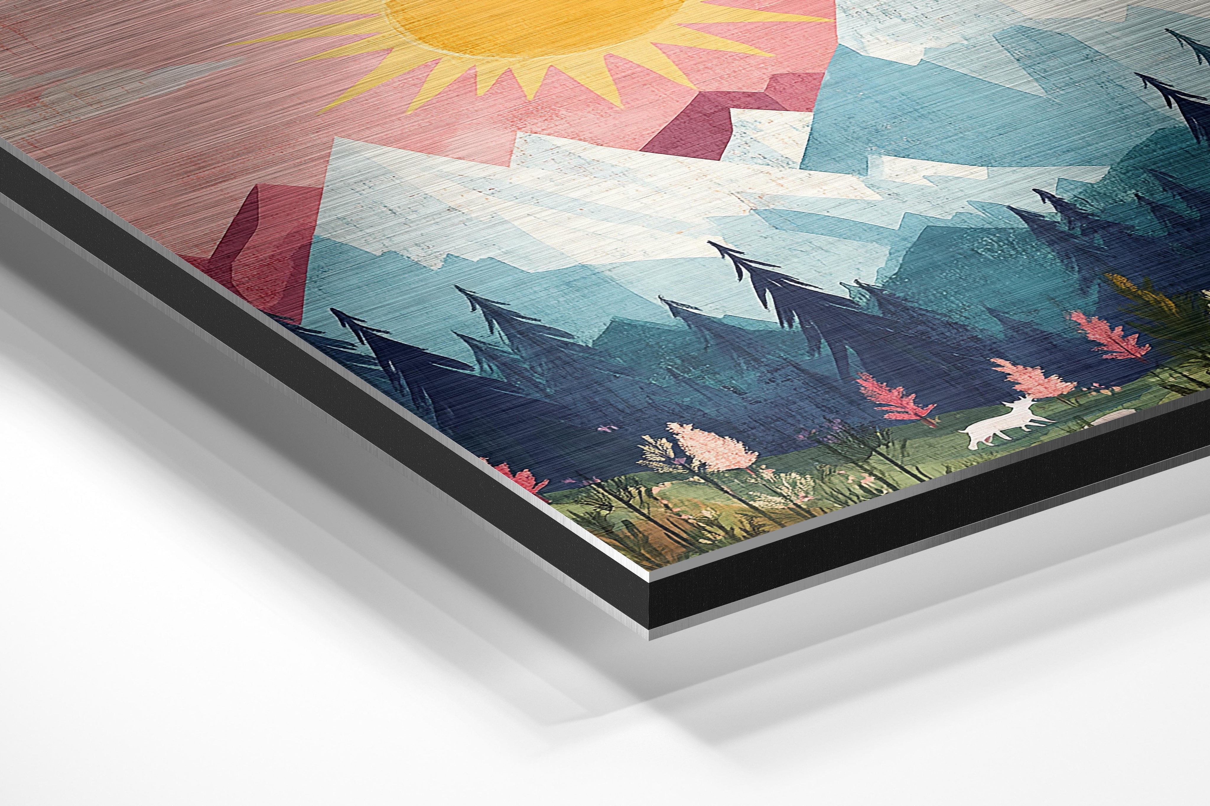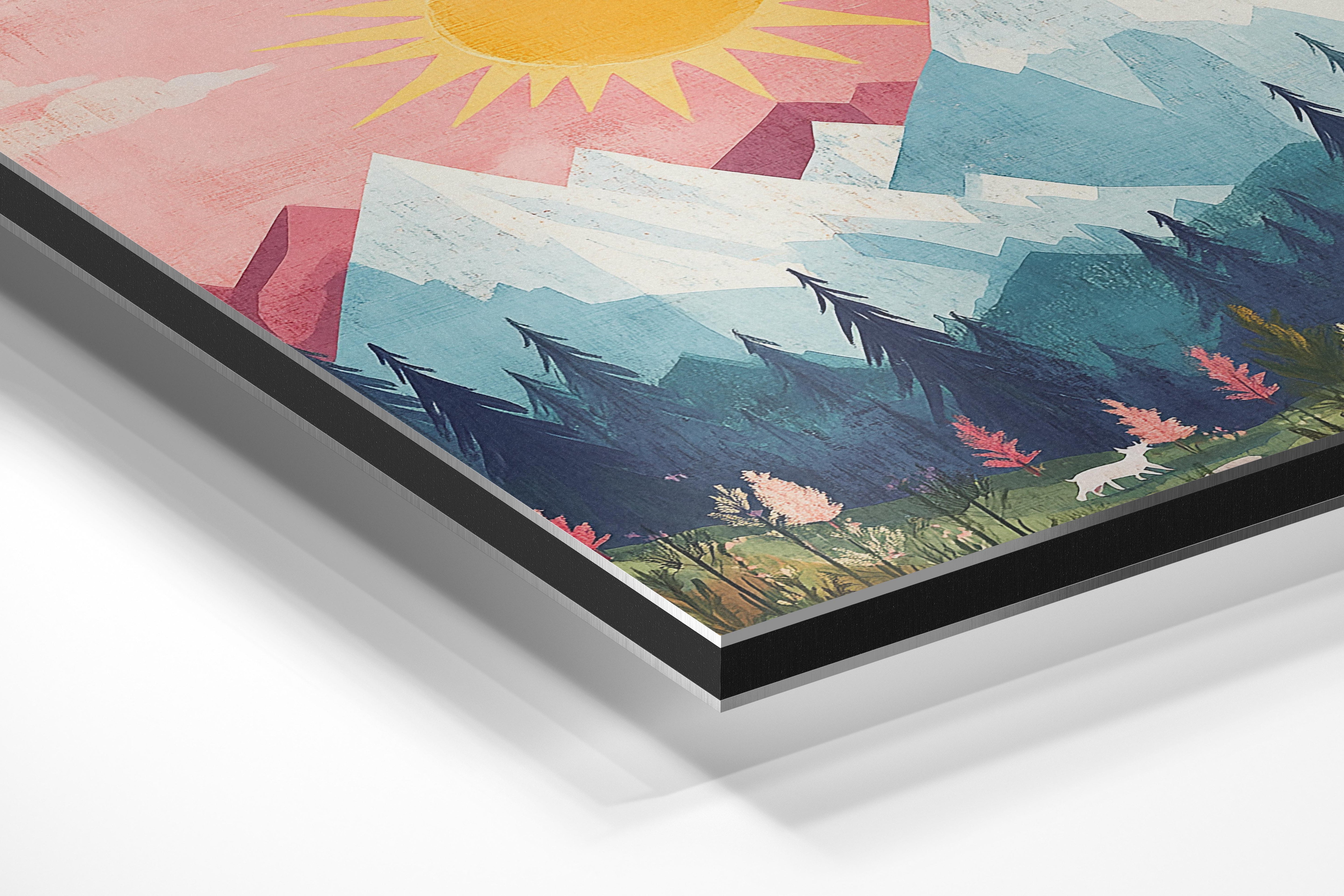 A breathtaking illustration of sunlit mountains rising above a lush forest, with a golden sun casting a warm glow. The serene beauty of this piece makes it a perfect addition to living rooms or offices, evoking peace and inspiration. Its blend of natural elements and vibrant colors creates a visually stunning centerpiece for any space.