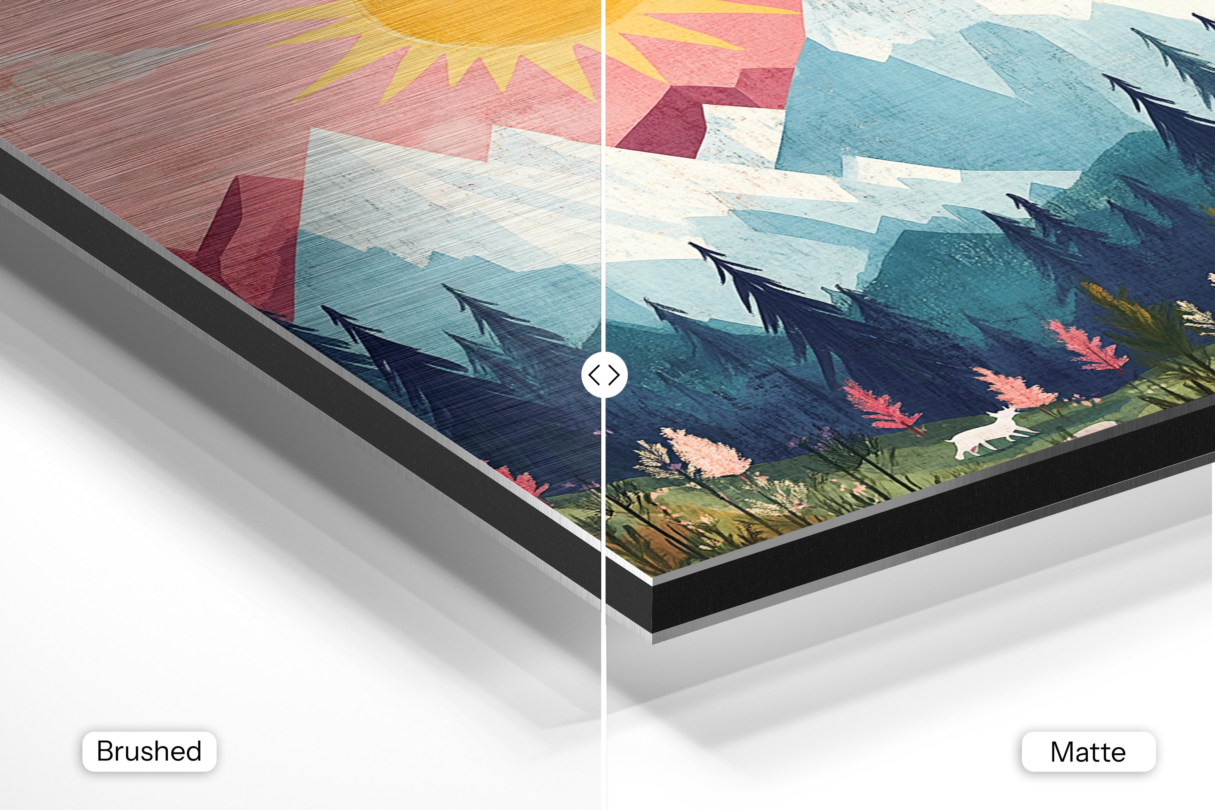 - Matte Aluminum offers a smooth, bright white surface that delivers crisp details and vibrant, true-to-life colors. With its non-reflective finish and subtle silky sheen, it’s perfect for photography, portraits, and colorful artwork—bringing a clean, polished look to any interior.