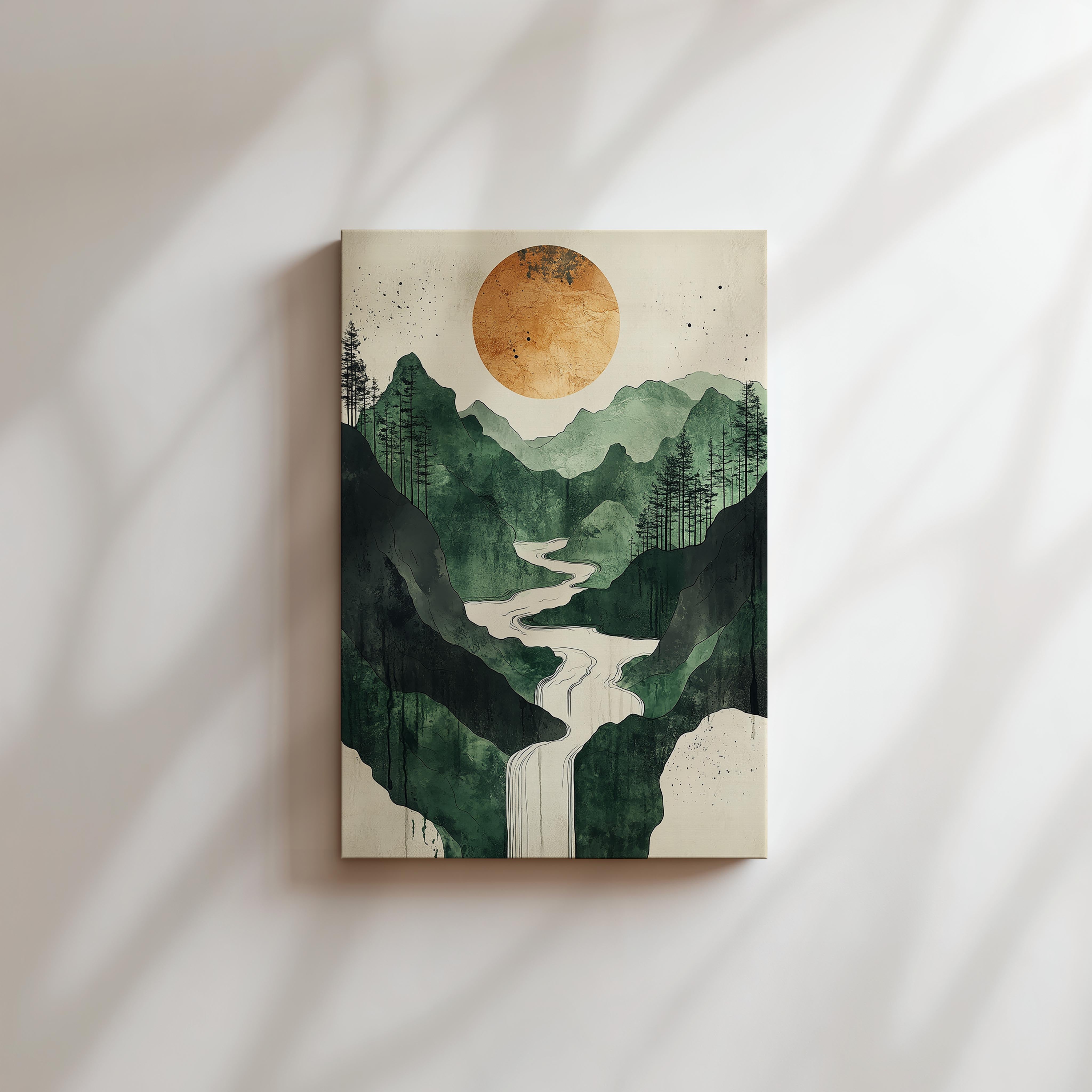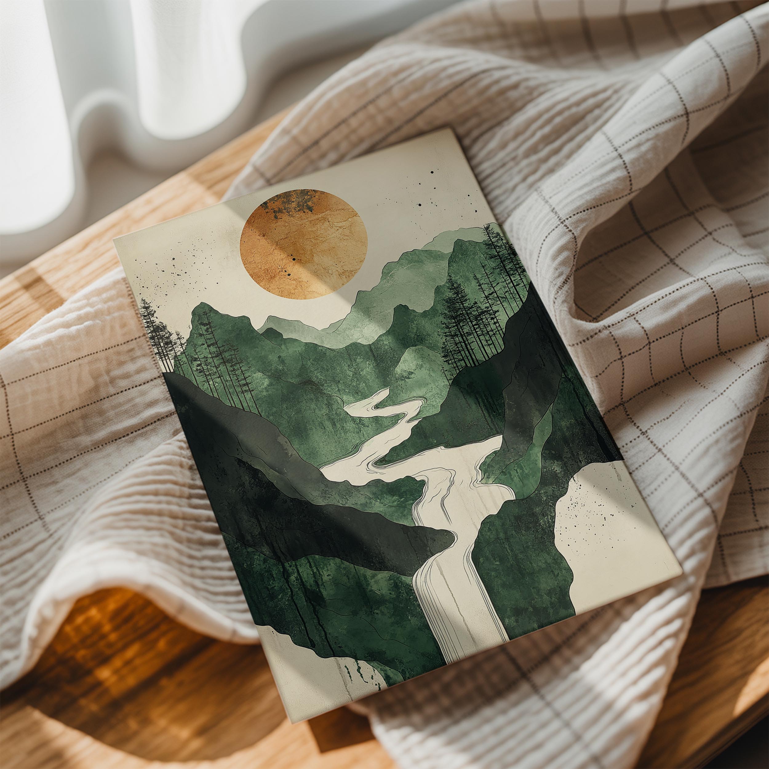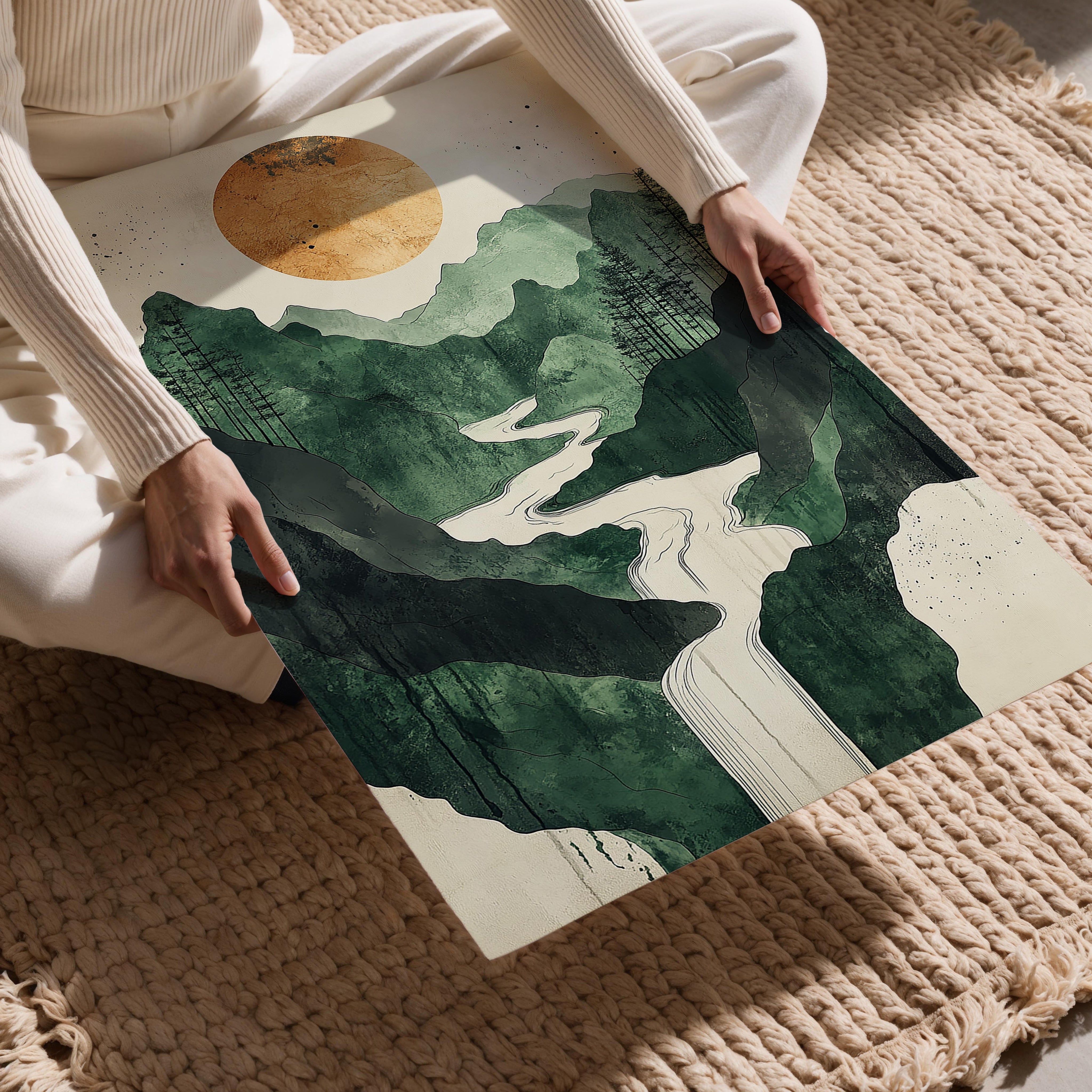 A breathtaking landscape featuring a winding river cutting through lush green valleys under a golden sun. The delicate linework and watercolor-like textures give it an elegant, ethereal quality. This artwork embodies the beauty of nature, making it ideal for nature lovers, hikers, or those who appreciate scenic tranquility. A great addition to eco-friendly spaces, relaxation areas, or mountain lodges, bringing the essence of the great outdoors indoors.