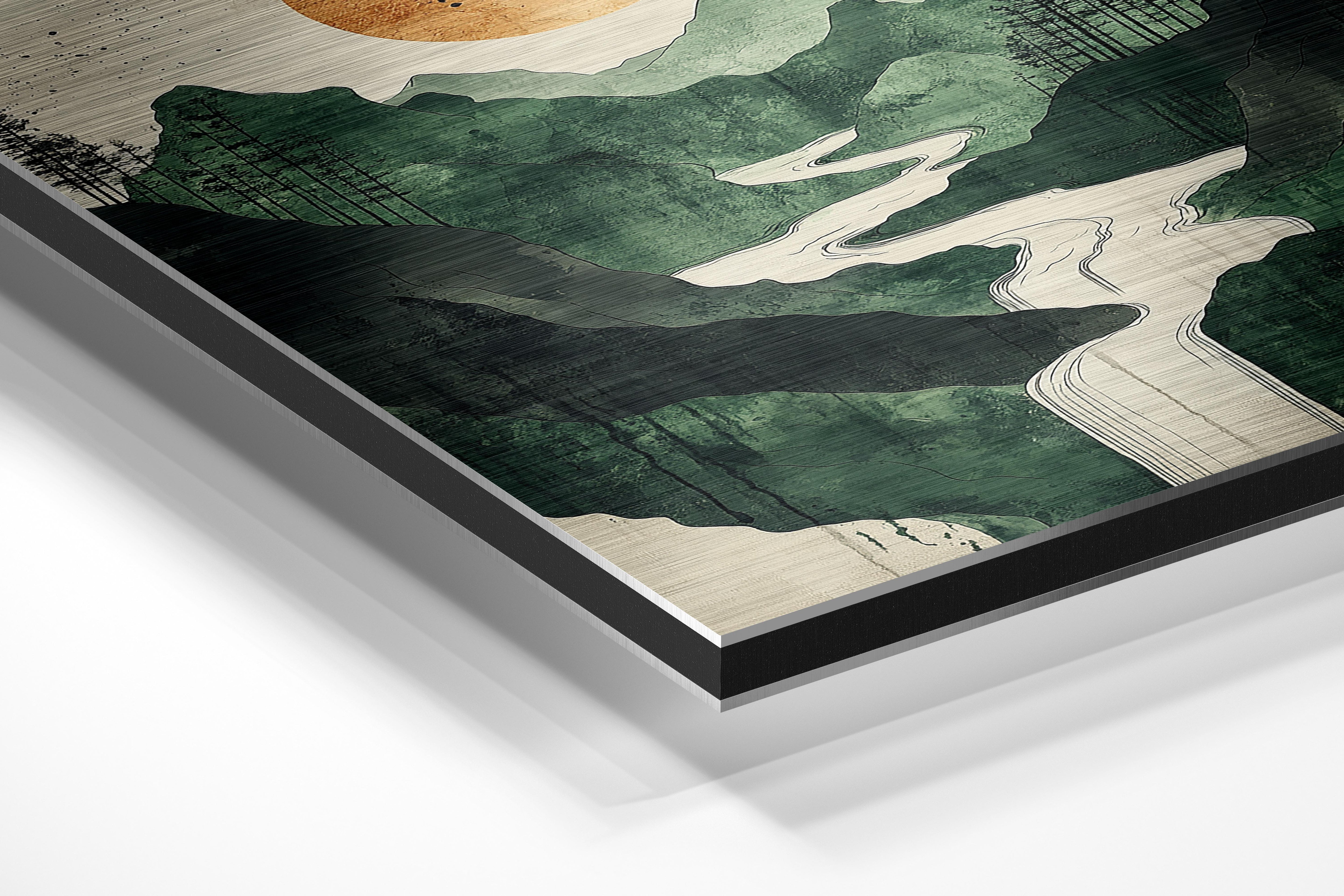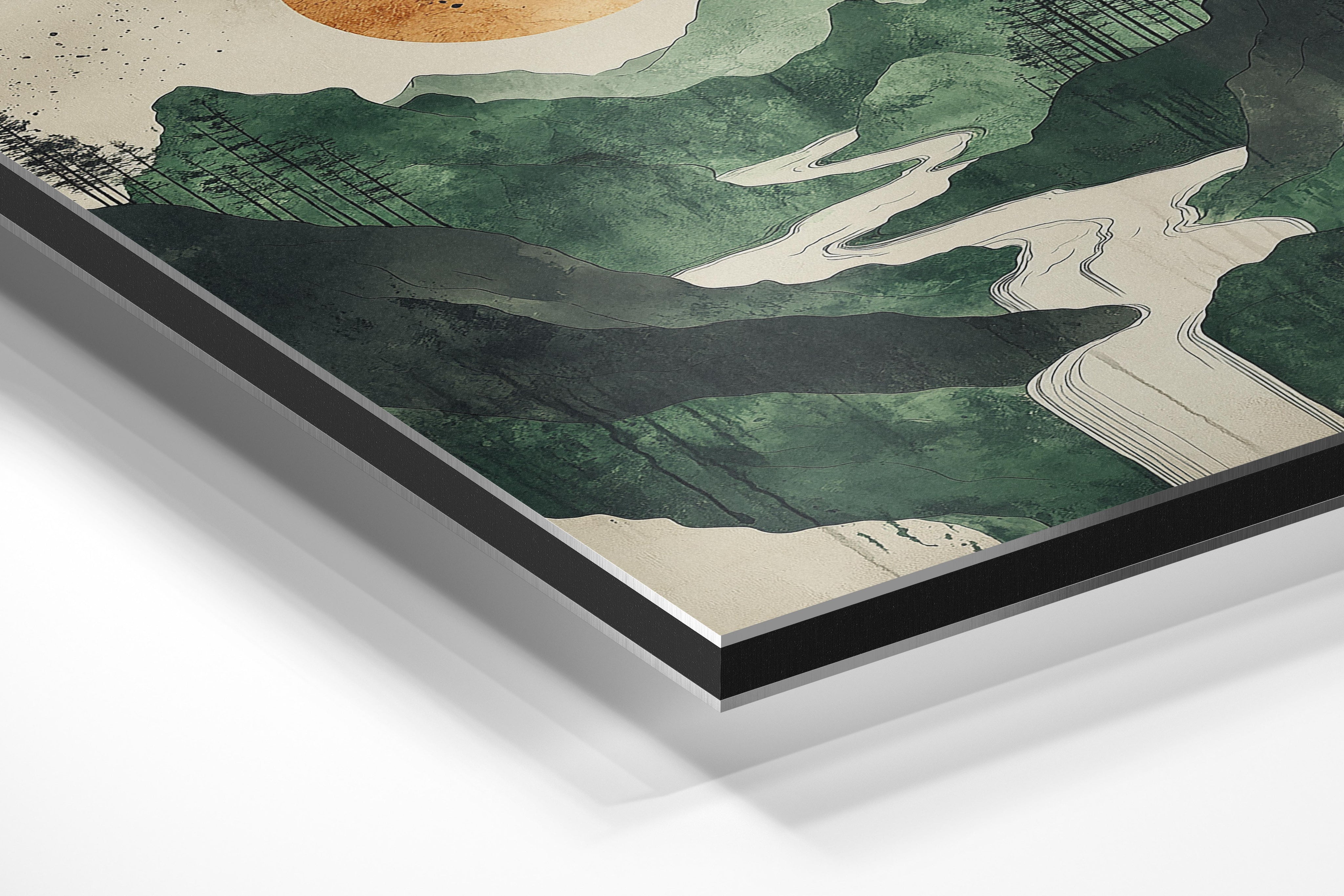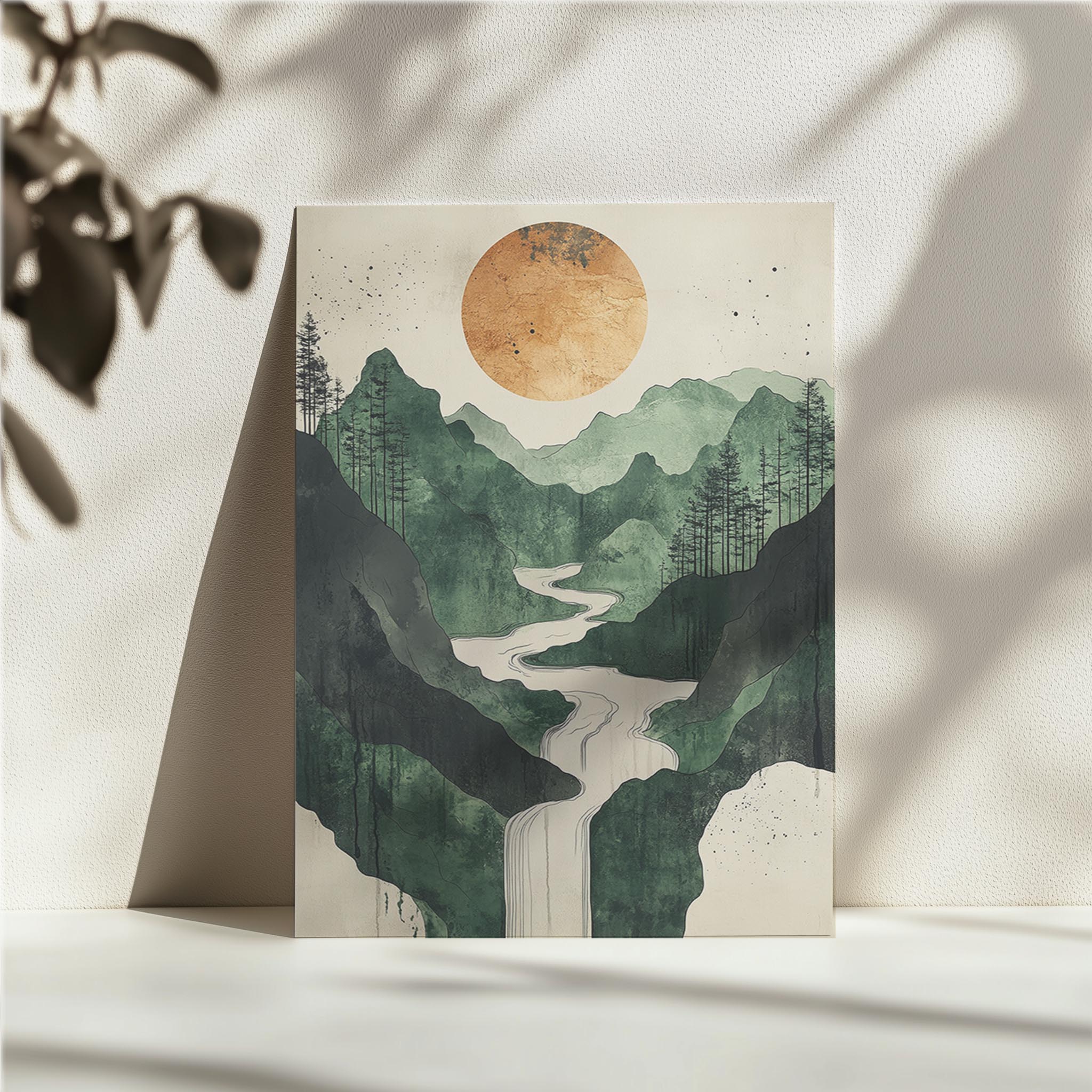 A breathtaking landscape featuring a winding river cutting through lush green valleys under a golden sun. The delicate linework and watercolor-like textures give it an elegant, ethereal quality. This artwork embodies the beauty of nature, making it ideal for nature lovers, hikers, or those who appreciate scenic tranquility. A great addition to eco-friendly spaces, relaxation areas, or mountain lodges, bringing the essence of the great outdoors indoors.