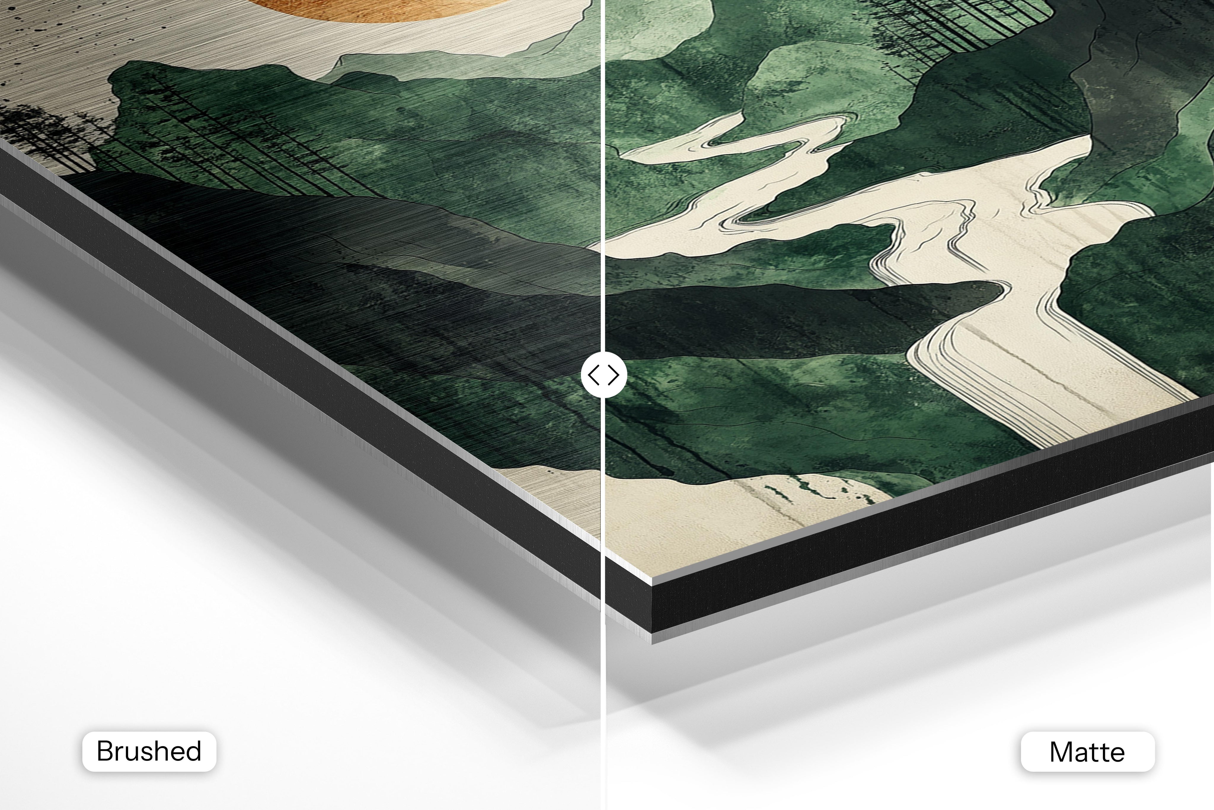 - Matte Aluminum offers a smooth, bright white surface that delivers crisp details and vibrant, true-to-life colors. With its non-reflective finish and subtle silky sheen, it’s perfect for photography, portraits, and colorful artwork—bringing a clean, polished look to any interior.