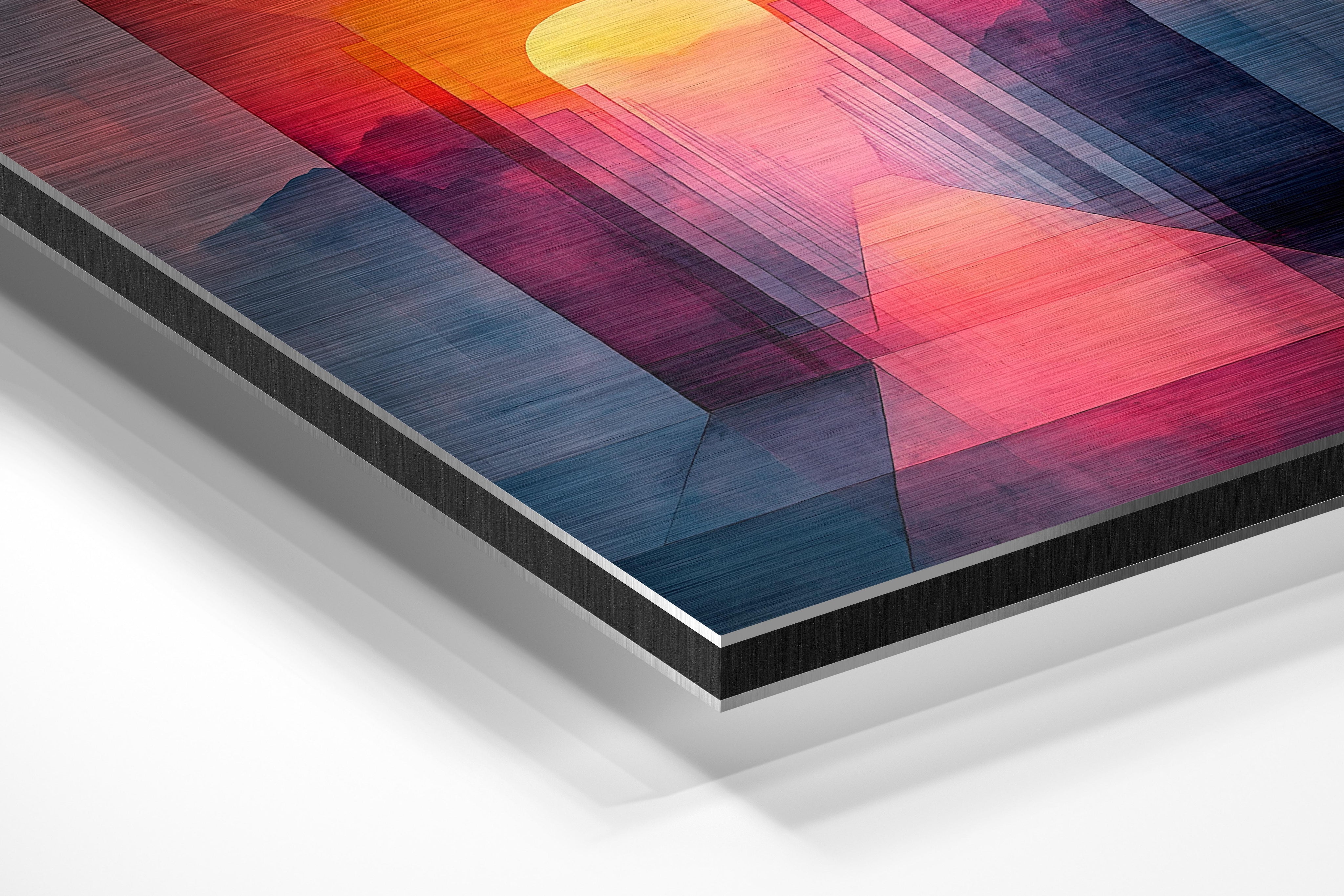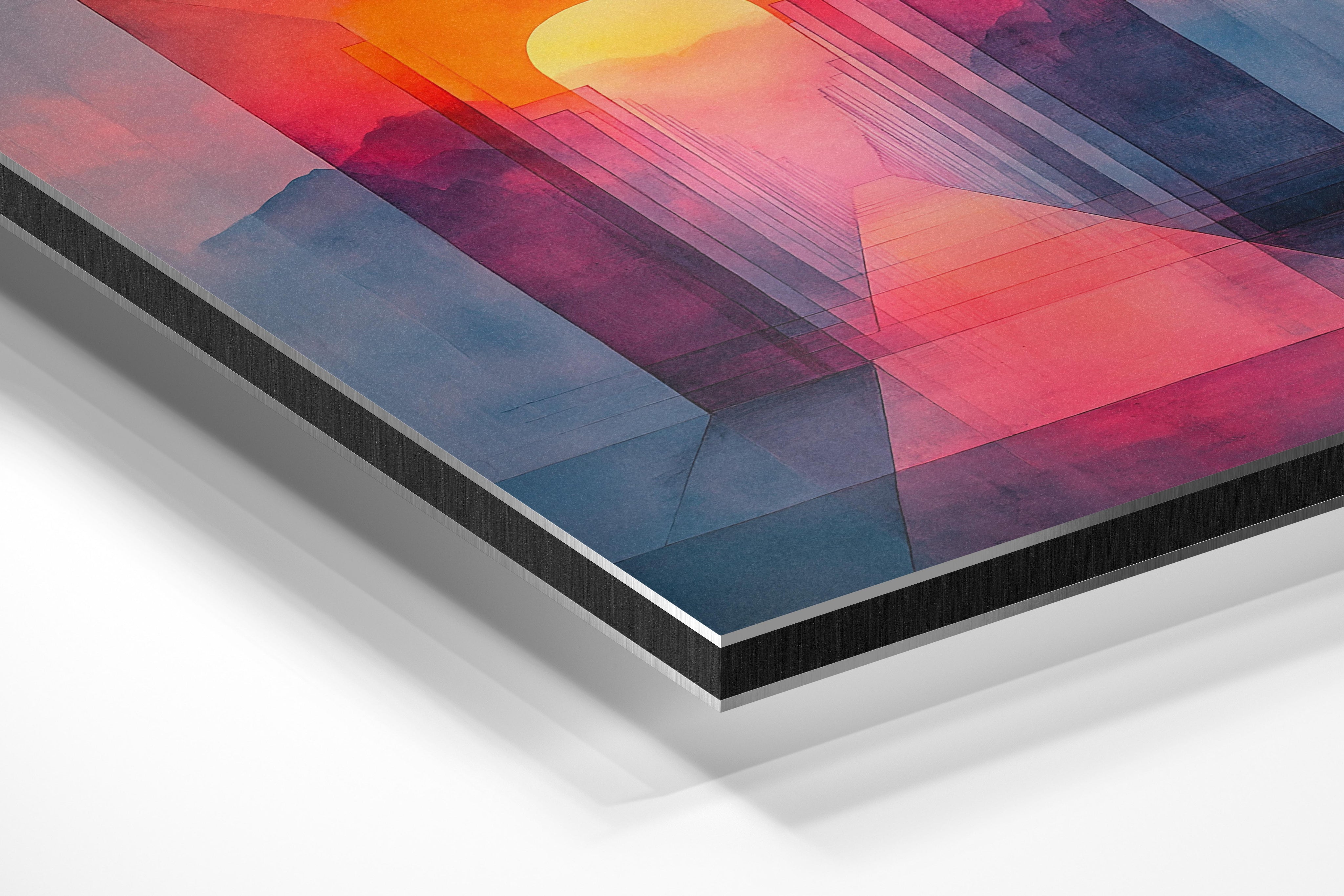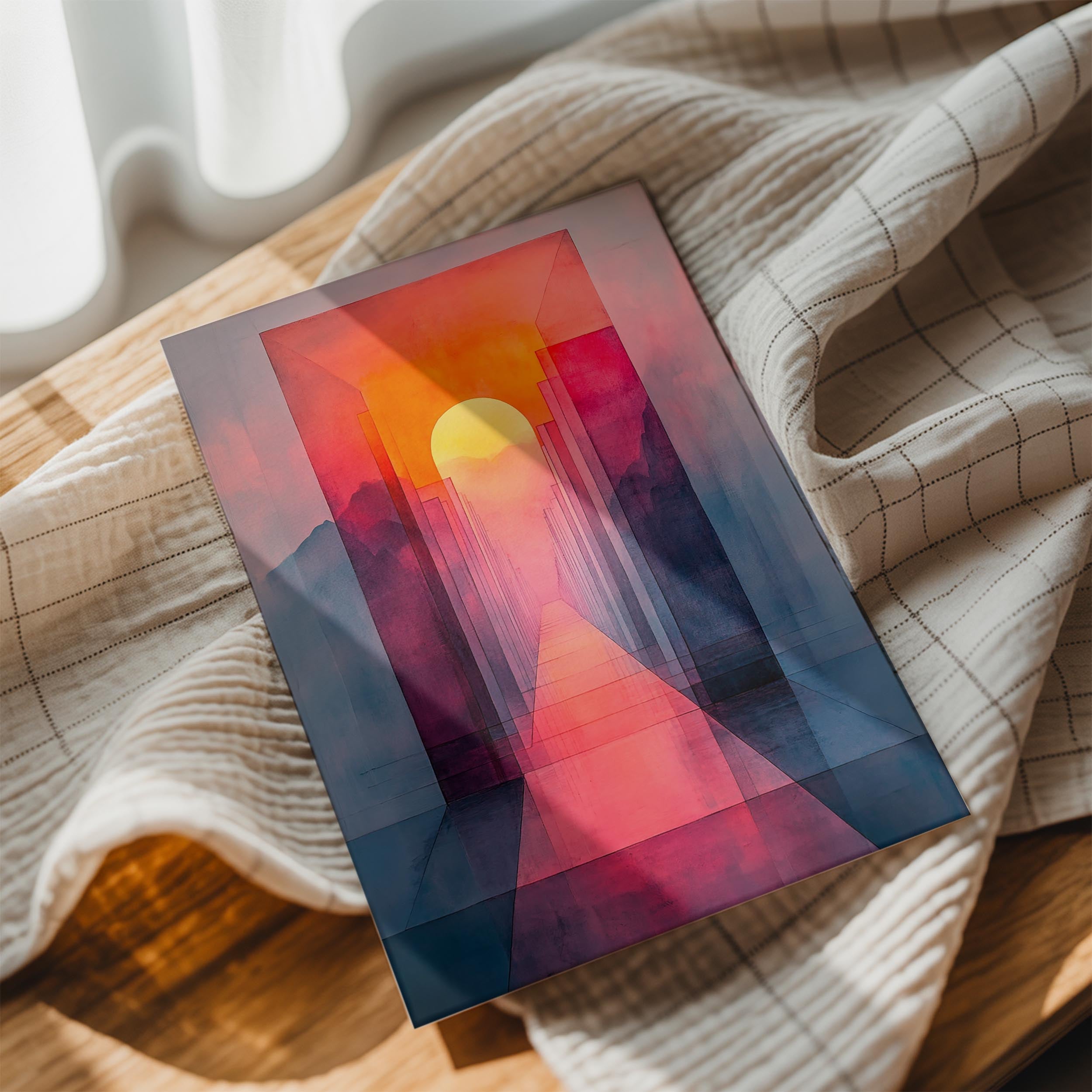 A radiant portal of warm and cool hues leads to a glowing horizon, blending architectural symmetry with natural beauty. The colors transition from deep reds to light oranges, evoking a sense of hope and journey. This artwork is a great addition to spaces seeking a balance of structure and inspiration, such as hallways, offices, or libraries.