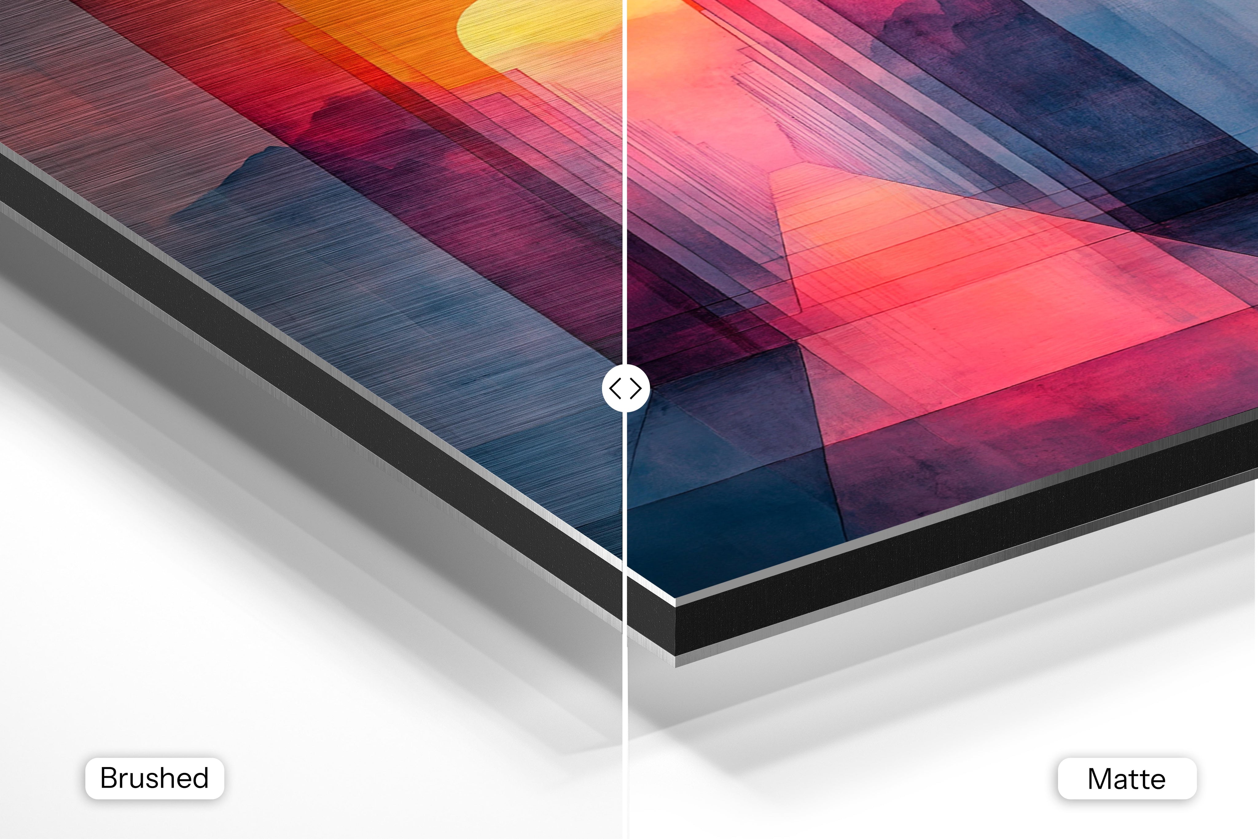 - Brushed Aluminum, on the other hand, features a raw metallic texture with visible brush strokes. Whites and highlights in your image let the silver surface show through, adding a dramatic, shimmering effect. Ideal for black-and-white images, minimalist designs, or abstract art, it creates a bold, industrial vibe with a modern edge.