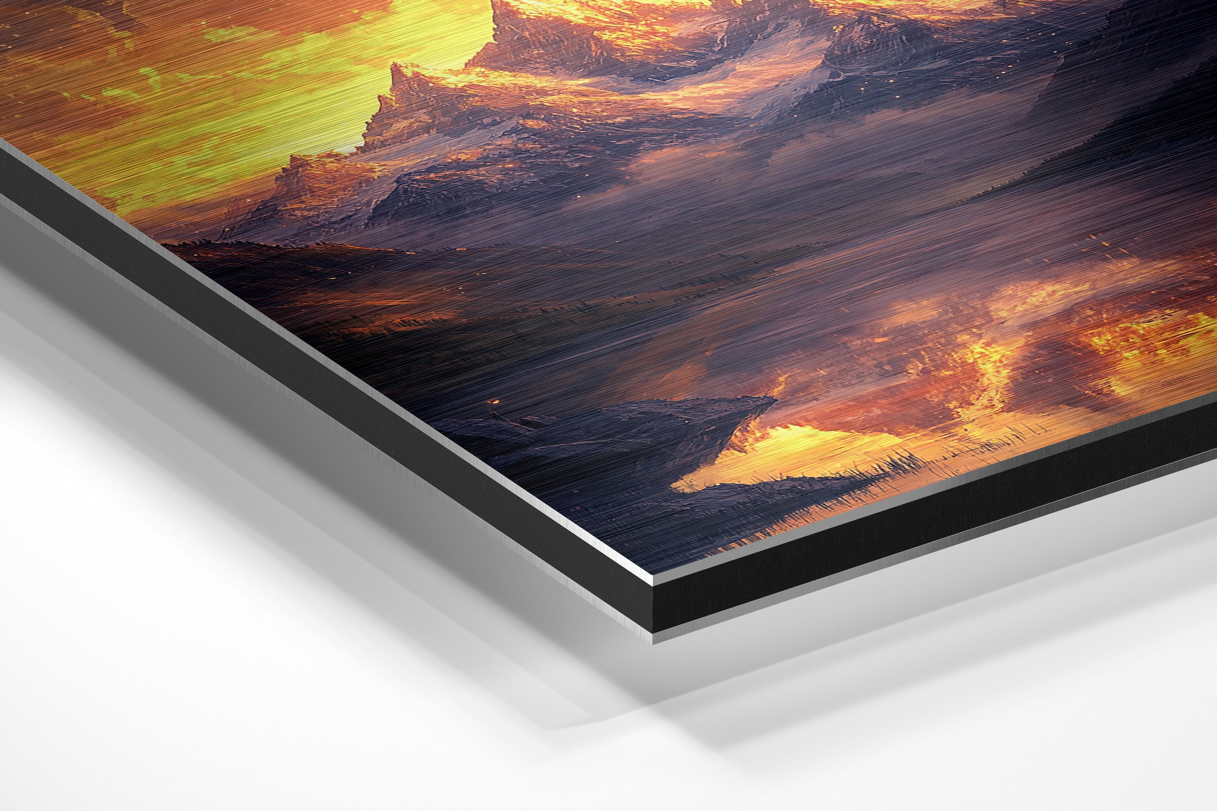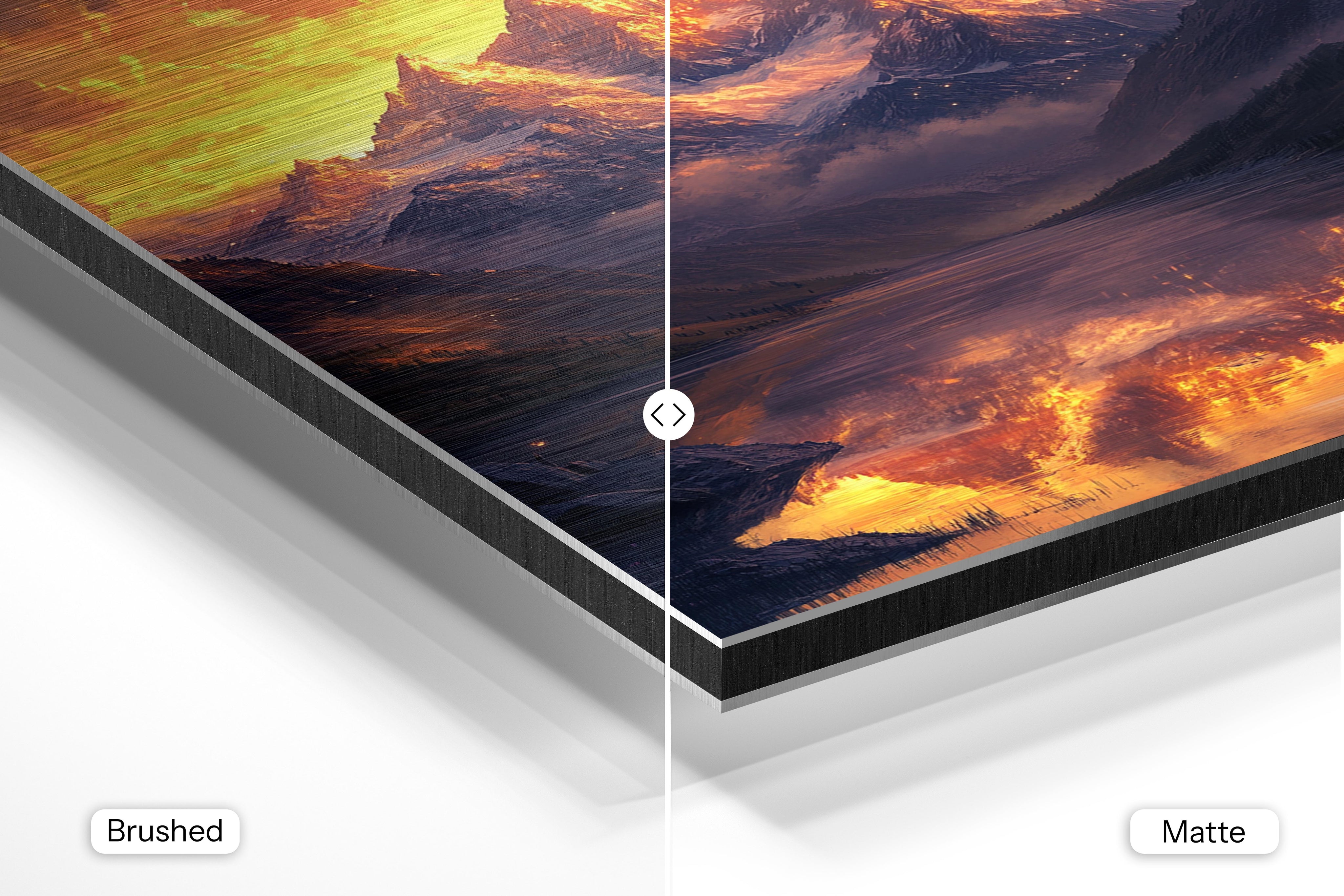 - Brushed Aluminum, on the other hand, features a raw metallic texture with visible brush strokes. Whites and highlights in your image let the silver surface show through, adding a dramatic, shimmering effect. Ideal for black-and-white images, minimalist designs, or abstract art, it creates a bold, industrial vibe with a modern edge.
