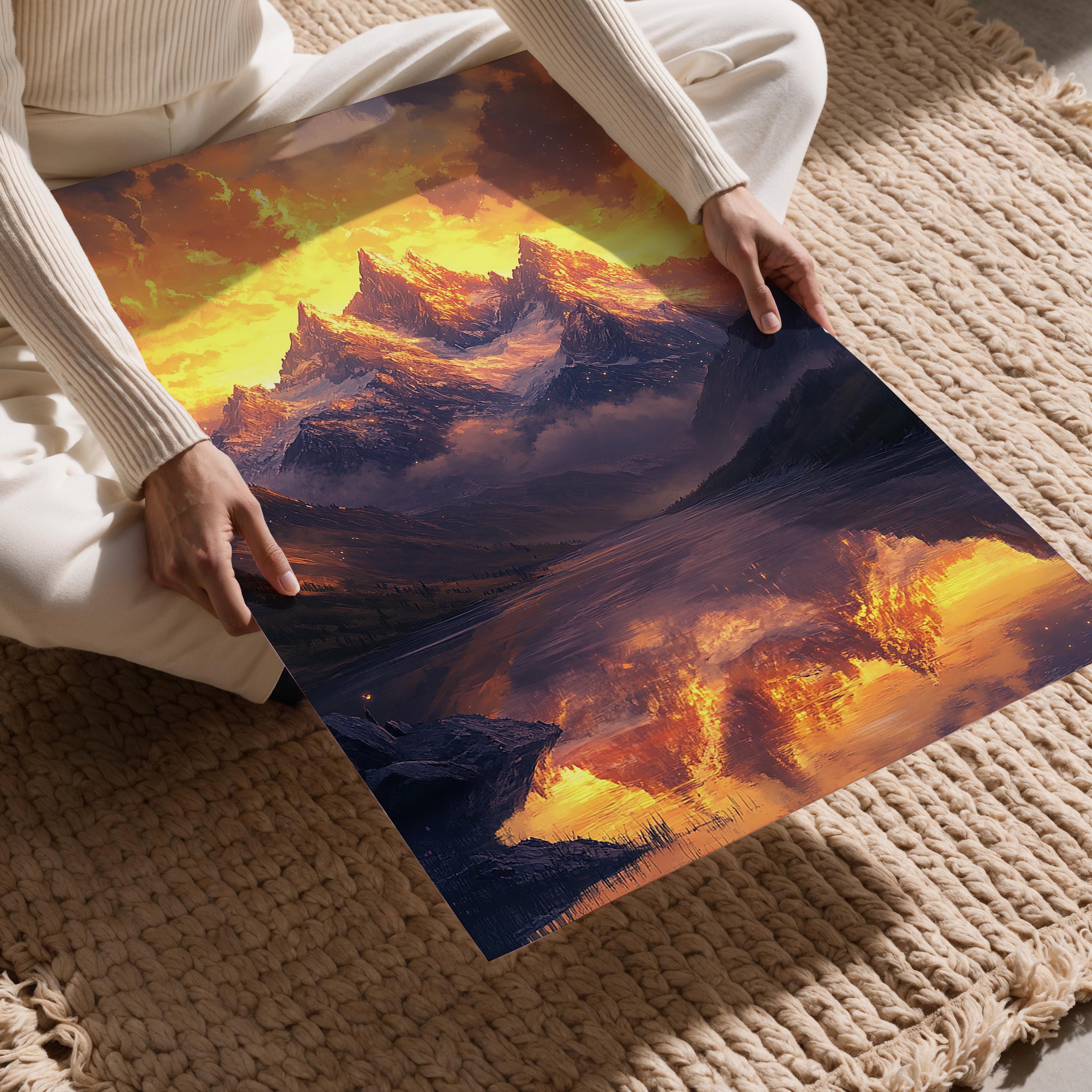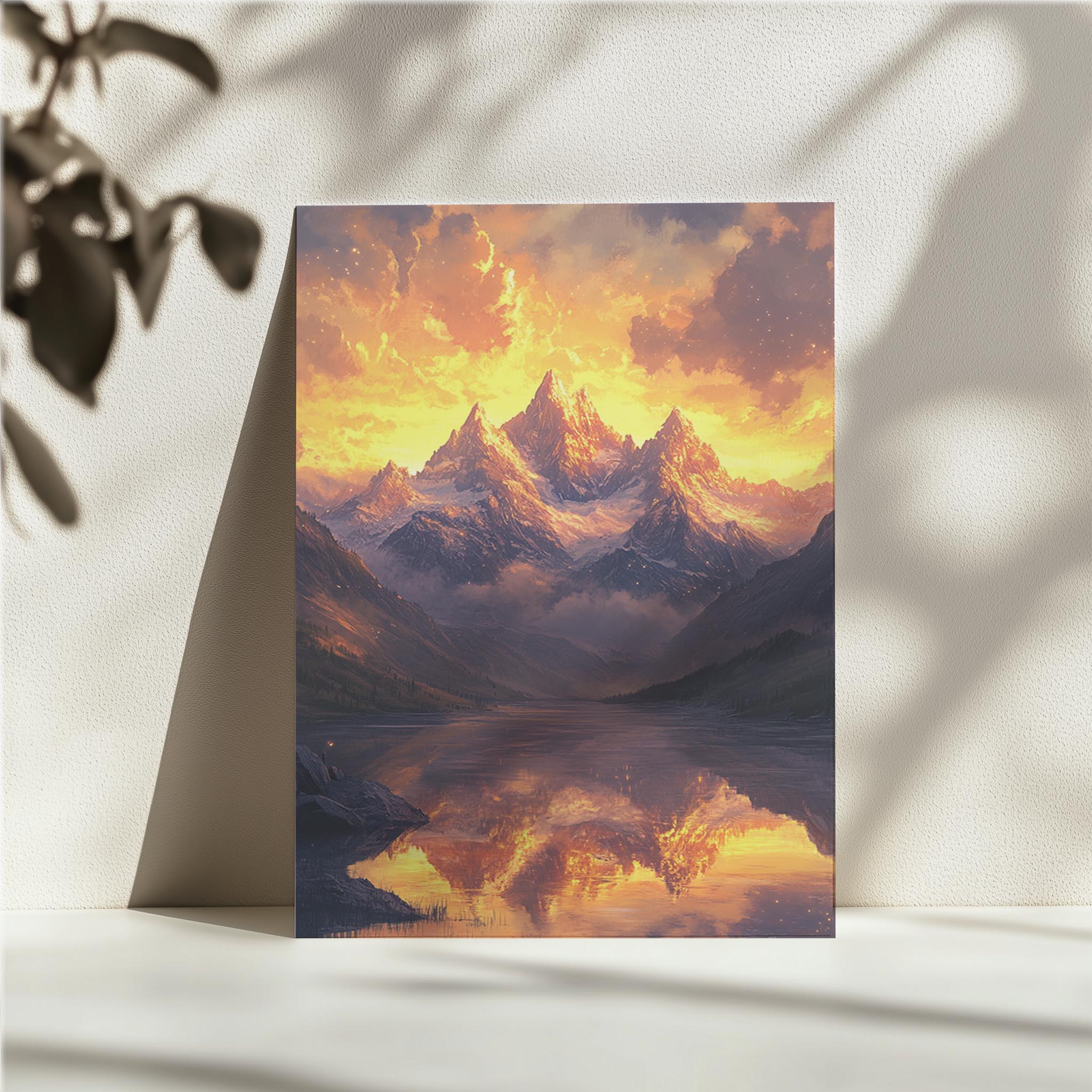 A dramatic sunrise over snow-capped peaks, bathing the landscape in golden light. The soft glow enhances the rugged beauty of the mountains while creating a striking contrast with the shadows below. This image embodies the power and majesty of nature’s grandest moments, inspiring awe and reverence. Perfect for highlighting the dramatic transitions of dawn in high-altitude regions, it is a stunning depiction of nature’s ability to captivate and uplift. A timeless moment of beauty for all to admire.