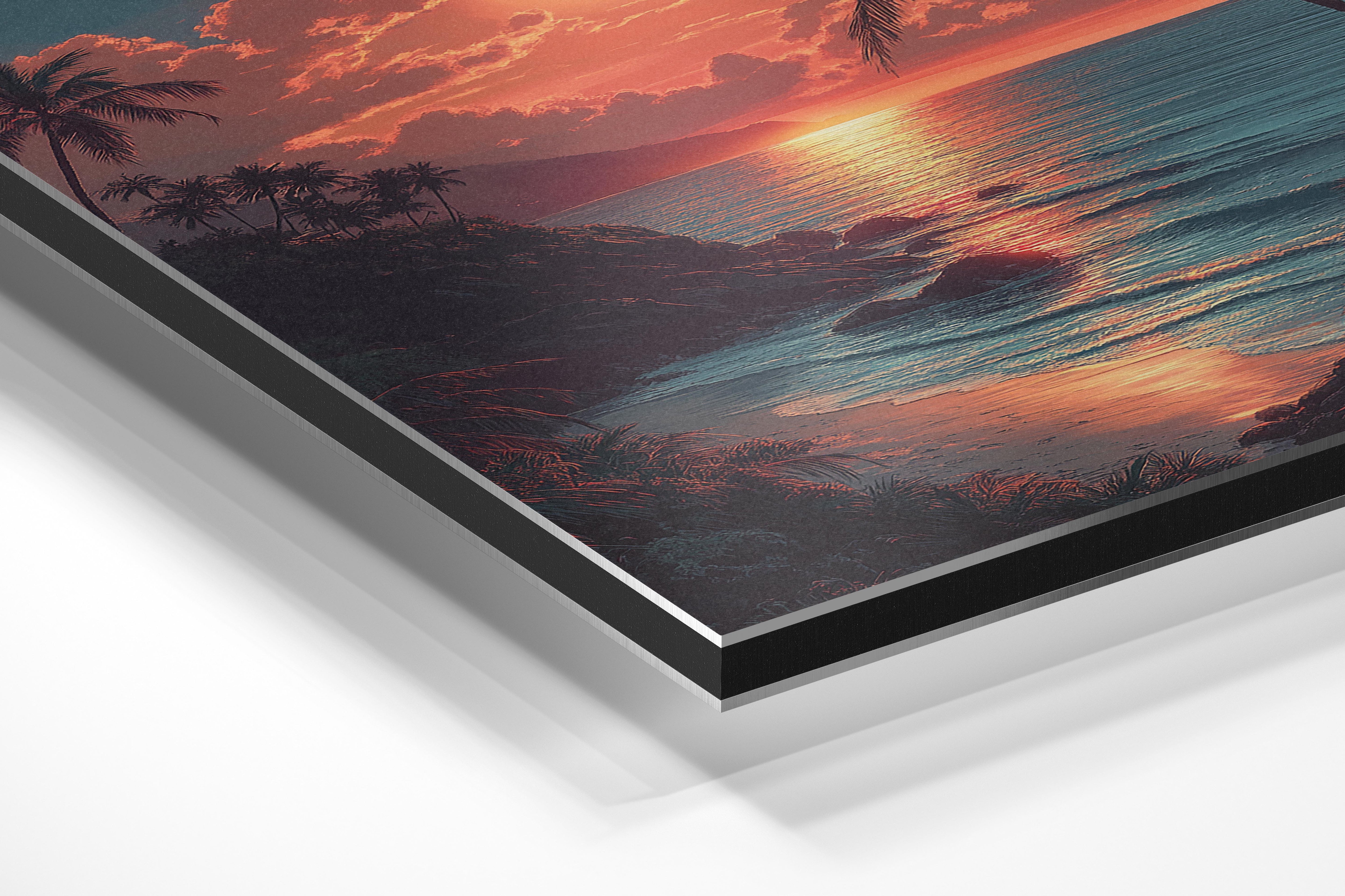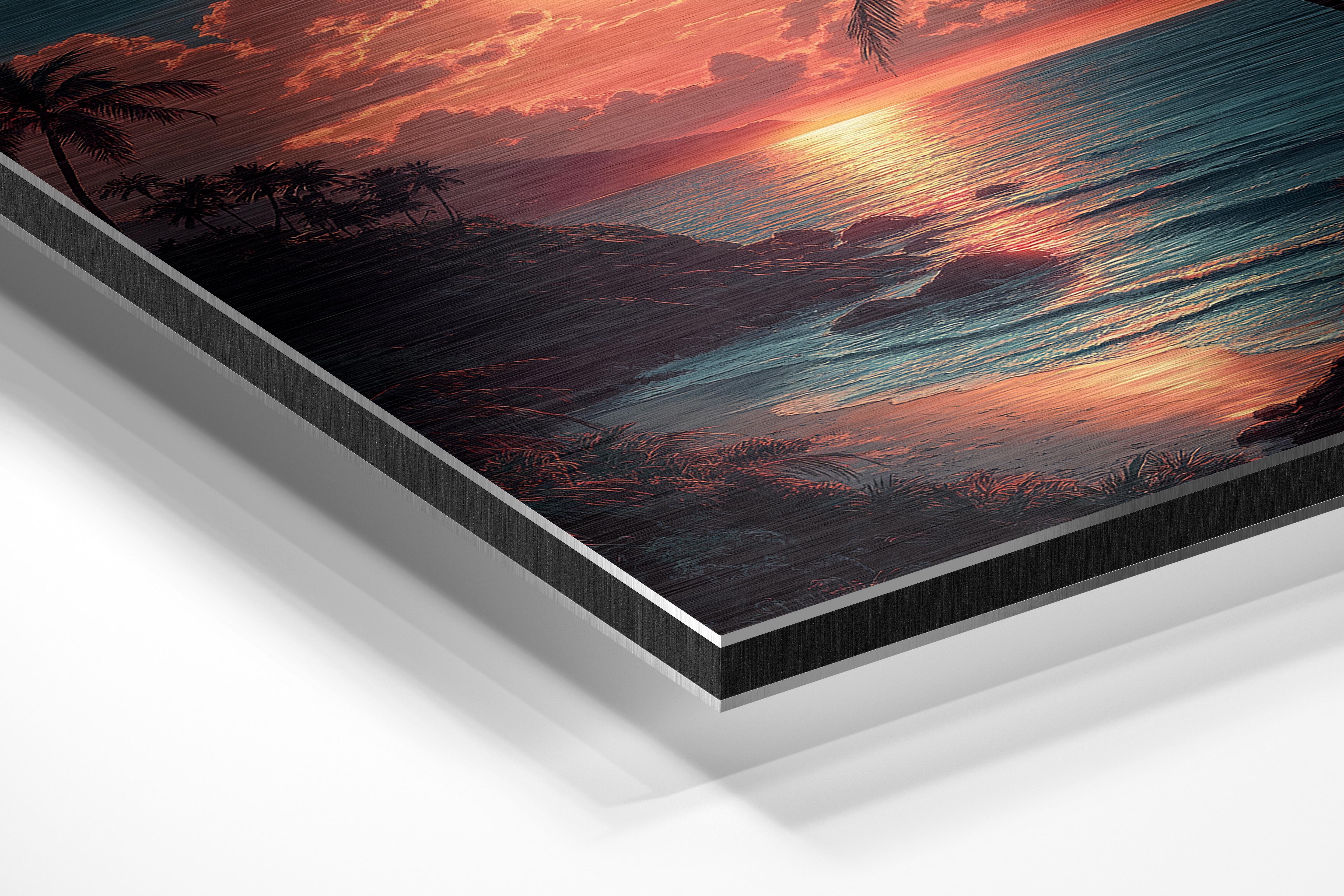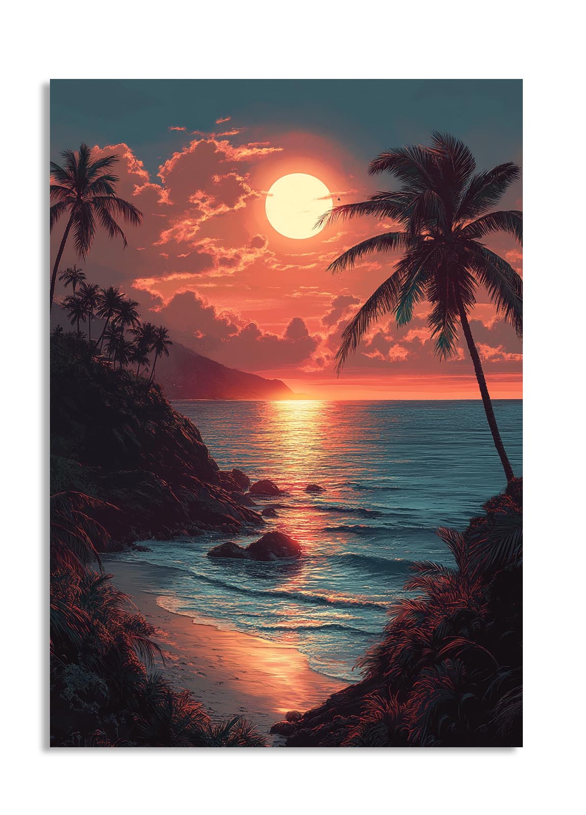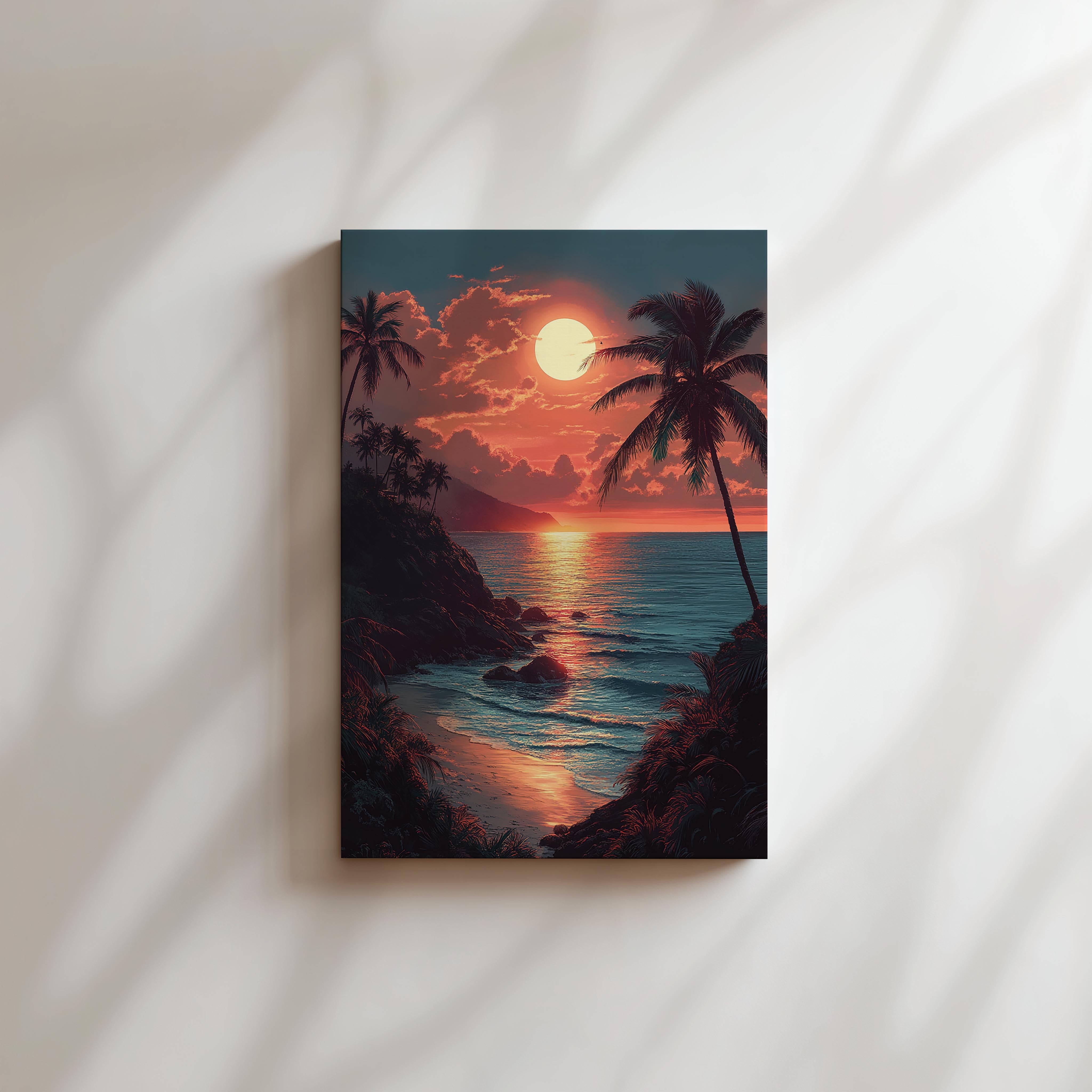 A stunning depiction of a serene tropical beach bathed in the warm hues of a setting sun. The vibrant sky is filled with hues of orange and pink, reflecting on the gentle waves that kiss the sandy shore. Palm trees frame the scene, adding a touch of exotic tranquility. This image is perfect for anyone looking to bring a sense of relaxation and wanderlust to their walls. Ideal for living rooms or office spaces, it serves as a constant reminder of the beauty of nature.