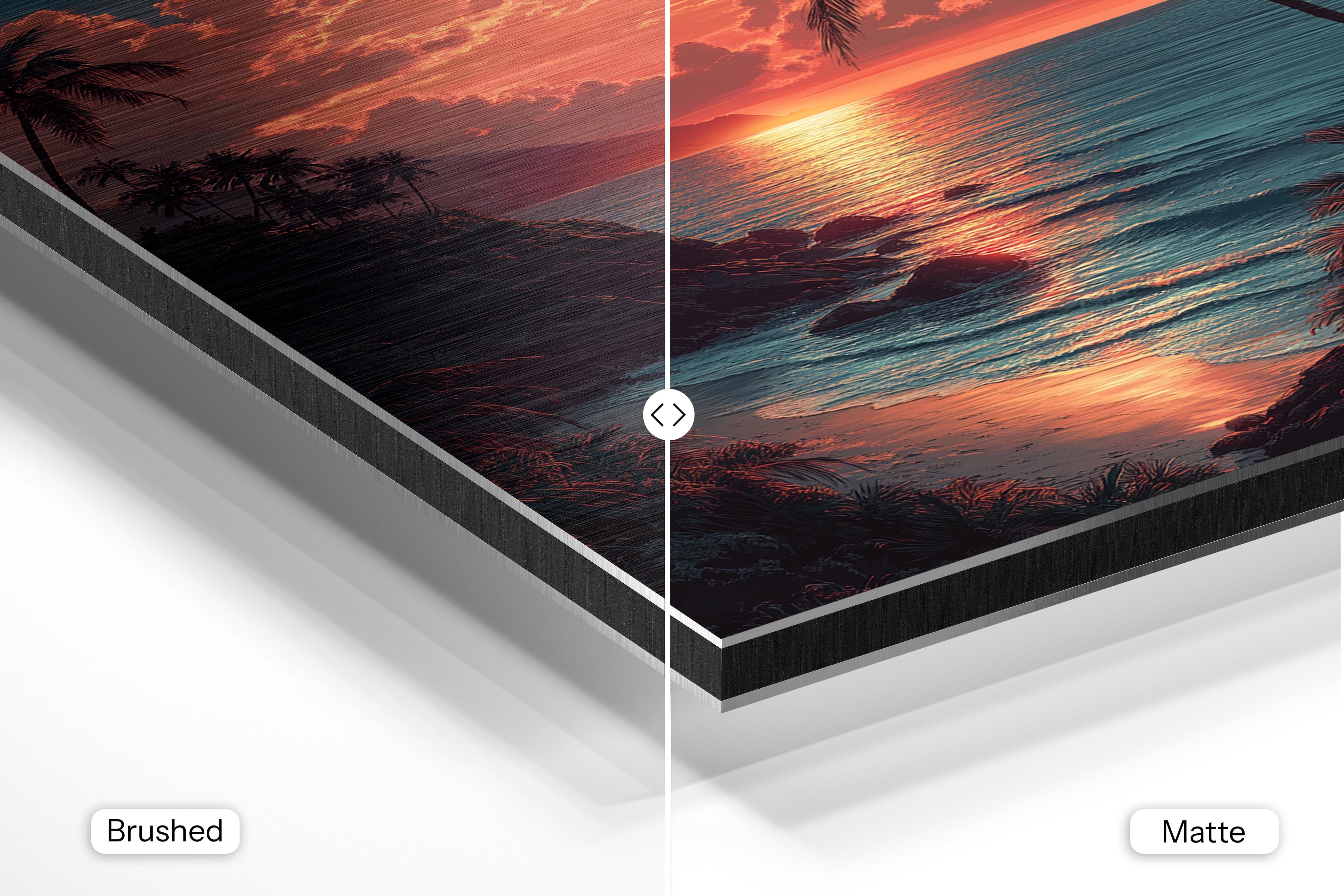 - Brushed Aluminum, on the other hand, features a raw metallic texture with visible brush strokes. Whites and highlights in your image let the silver surface show through, adding a dramatic, shimmering effect. Ideal for black-and-white images, minimalist designs, or abstract art, it creates a bold, industrial vibe with a modern edge.