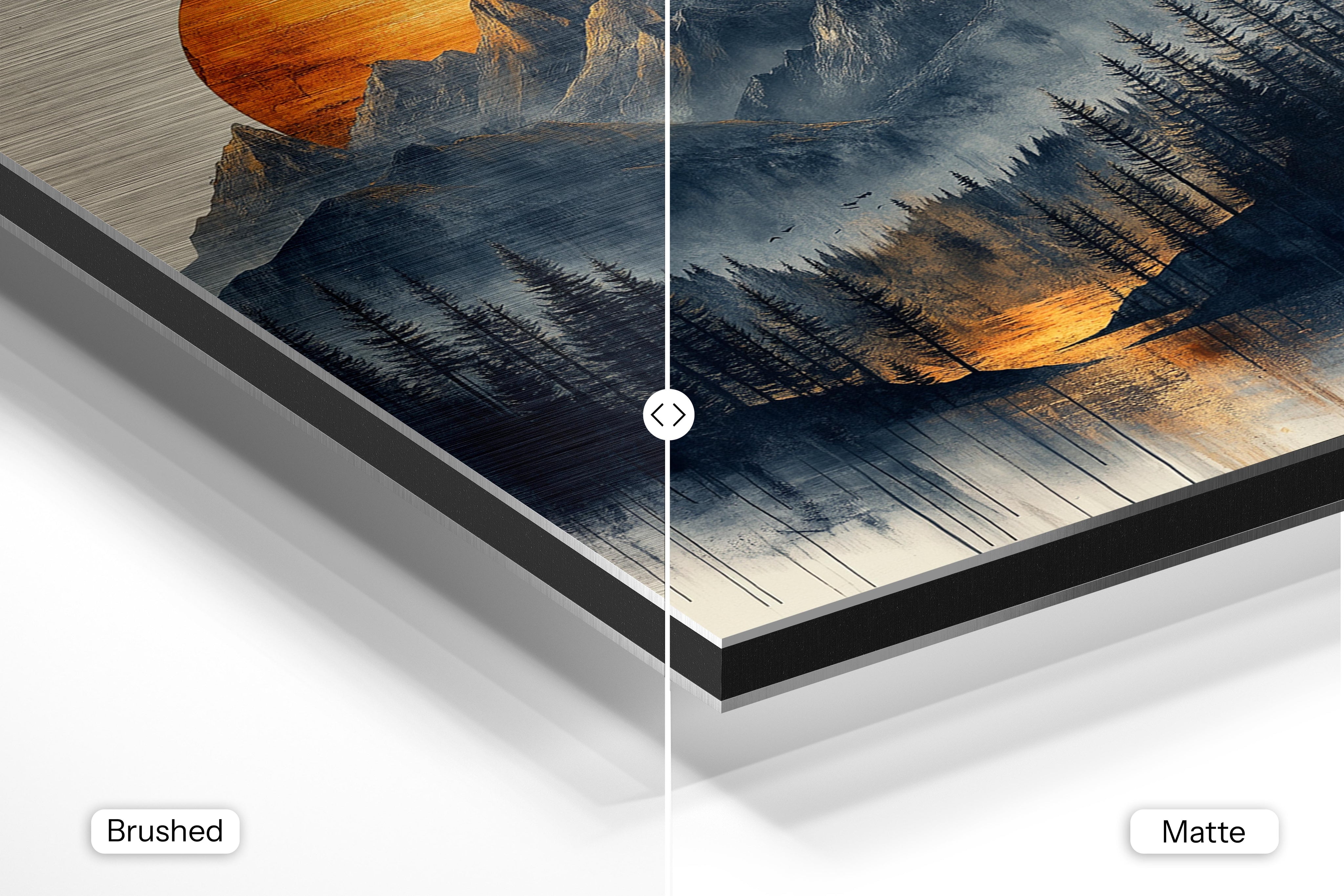 - Brushed Aluminum, on the other hand, features a raw metallic texture with visible brush strokes. Whites and highlights in your image let the silver surface show through, adding a dramatic, shimmering effect. Ideal for black-and-white images, minimalist designs, or abstract art, it creates a bold, industrial vibe with a modern edge.