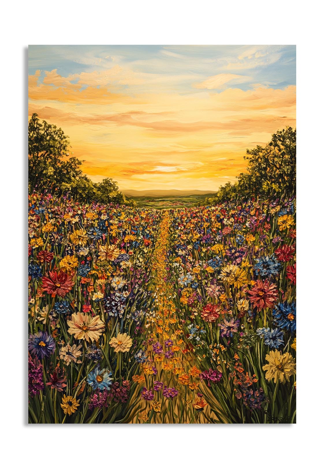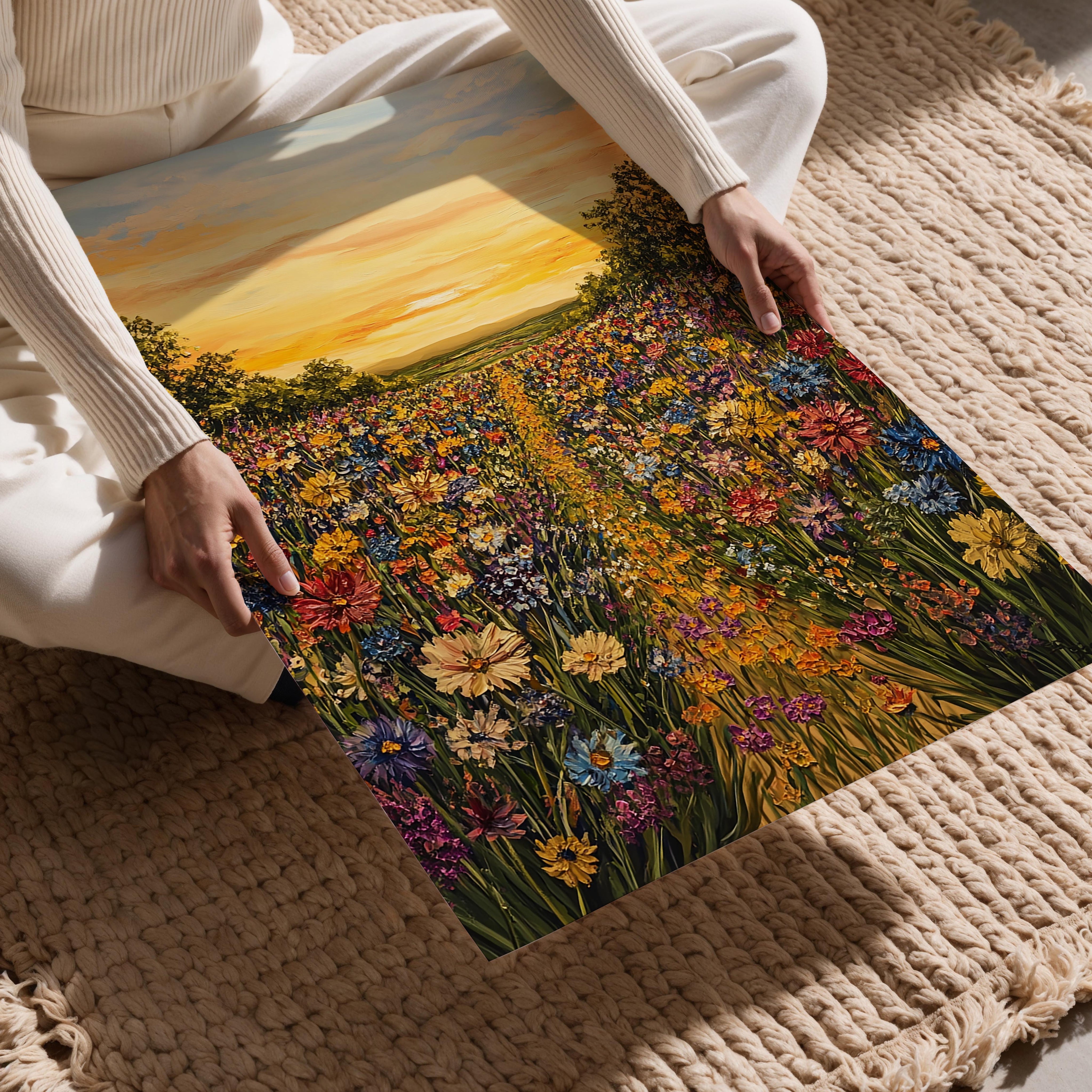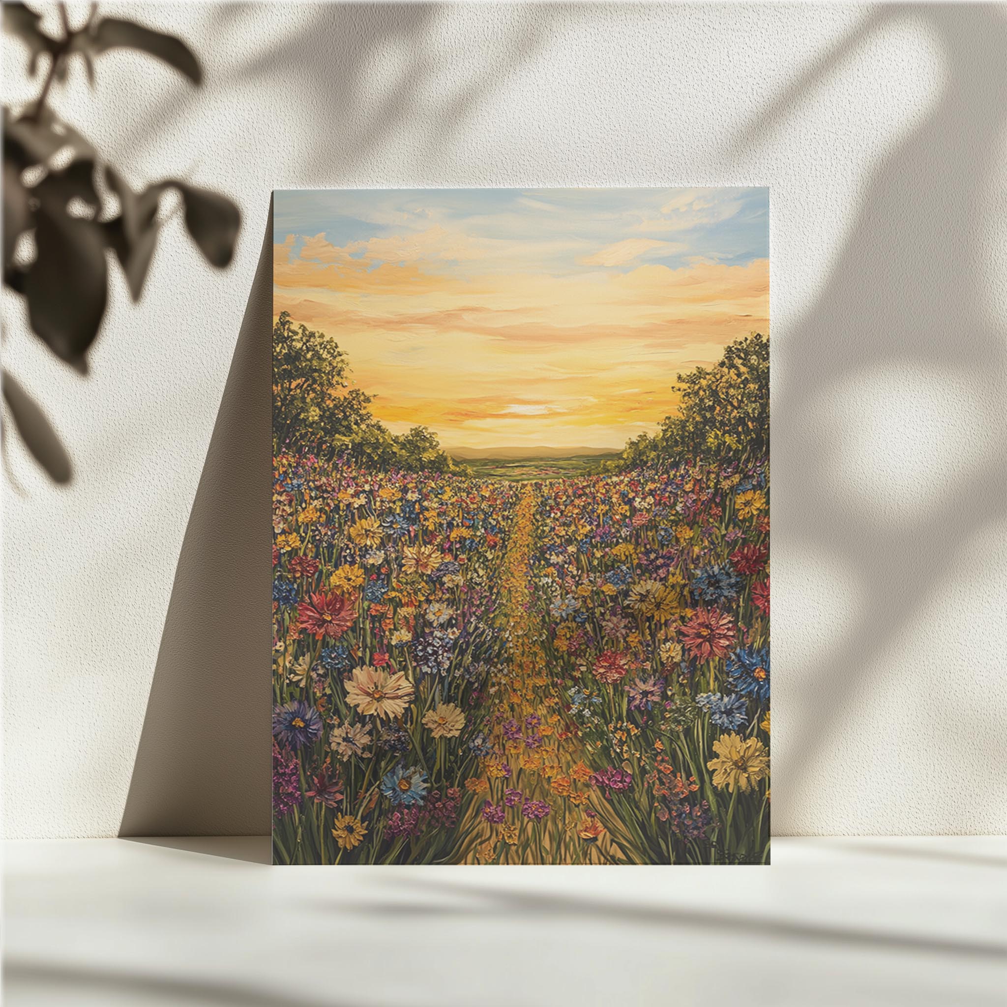 A vibrant meadow brimming with colorful wildflowers basking in the golden glow of sunset. This captivating scene embodies harmony, peace, and the vibrant life that nature offers. The vivid colors of the flowers against the warm hues of the setting sun create a stunning contrast that inspires feelings of joy and serenity. Perfect for marketing campaigns targeting nature enthusiasts, eco-tourism, or outdoor photography lovers.