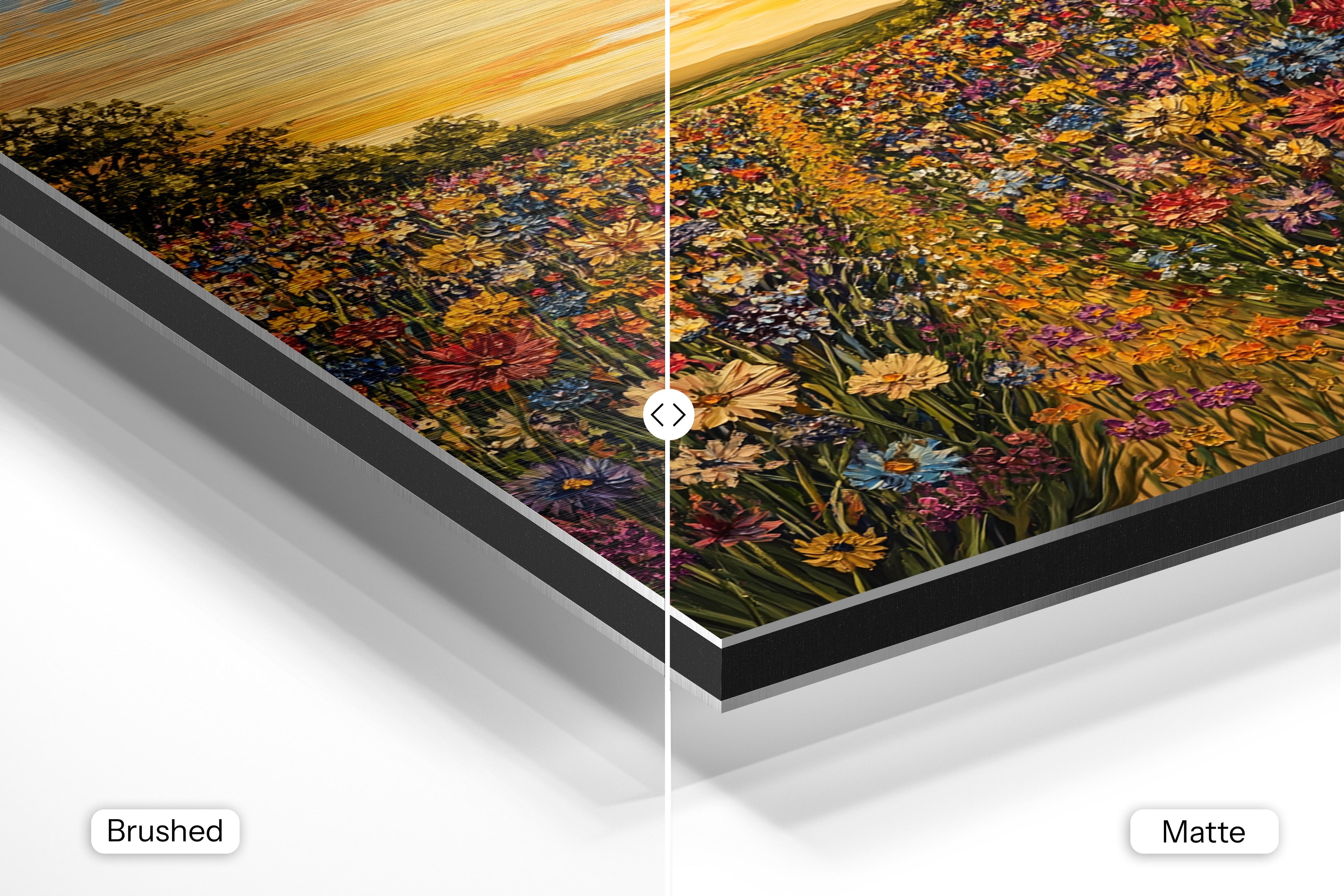 - Matte Aluminum offers a smooth, bright white surface that delivers crisp details and vibrant, true-to-life colors. With its non-reflective finish and subtle silky sheen, it’s perfect for photography, portraits, and colorful artwork—bringing a clean, polished look to any interior.