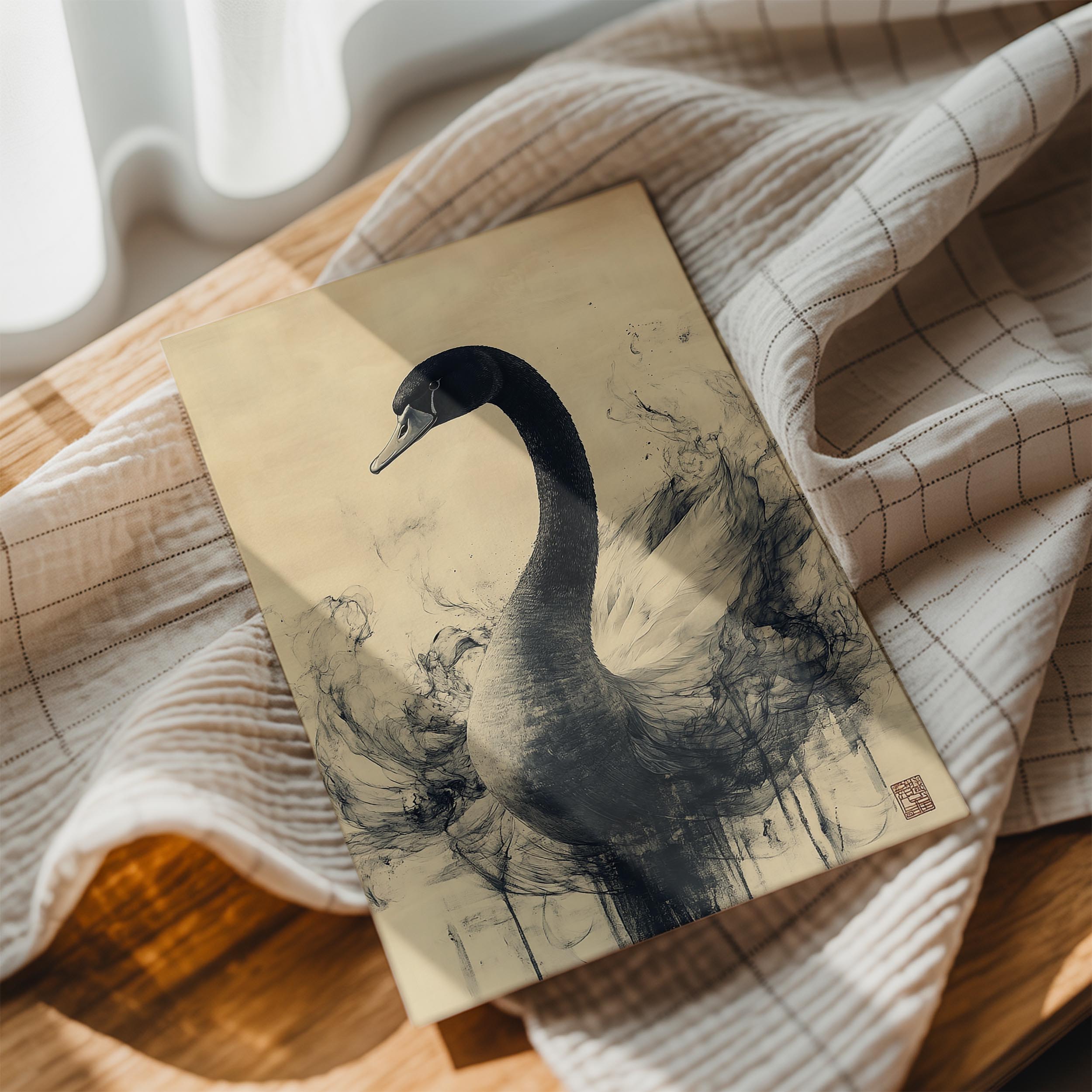 An abstract artistic representation of a swan, created with dynamic motion strokes that mimic flowing water and mist. The elegant posture and soft detailing give this piece a dreamlike quality, making it a beautiful addition to a tranquil space or a modern gallery wall.