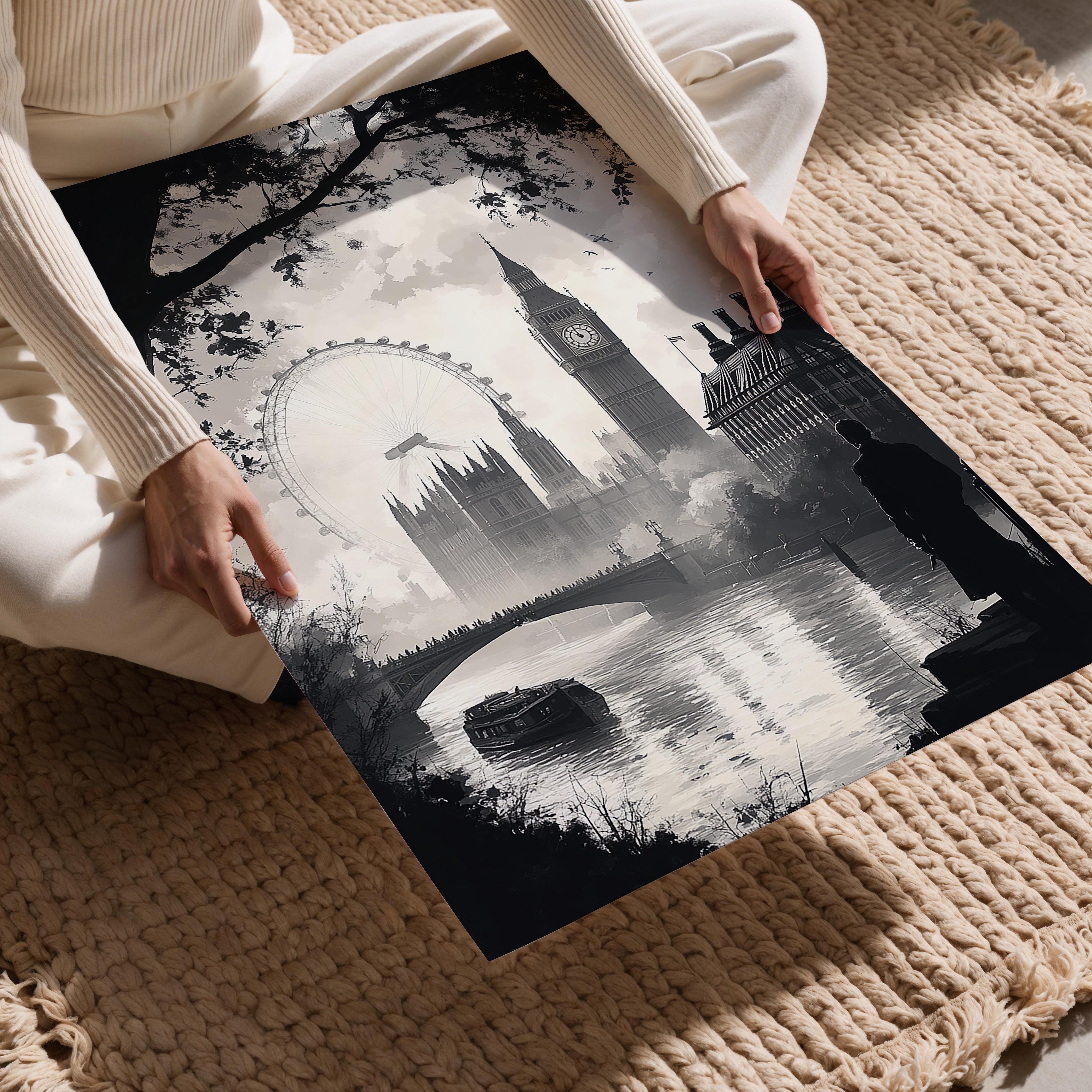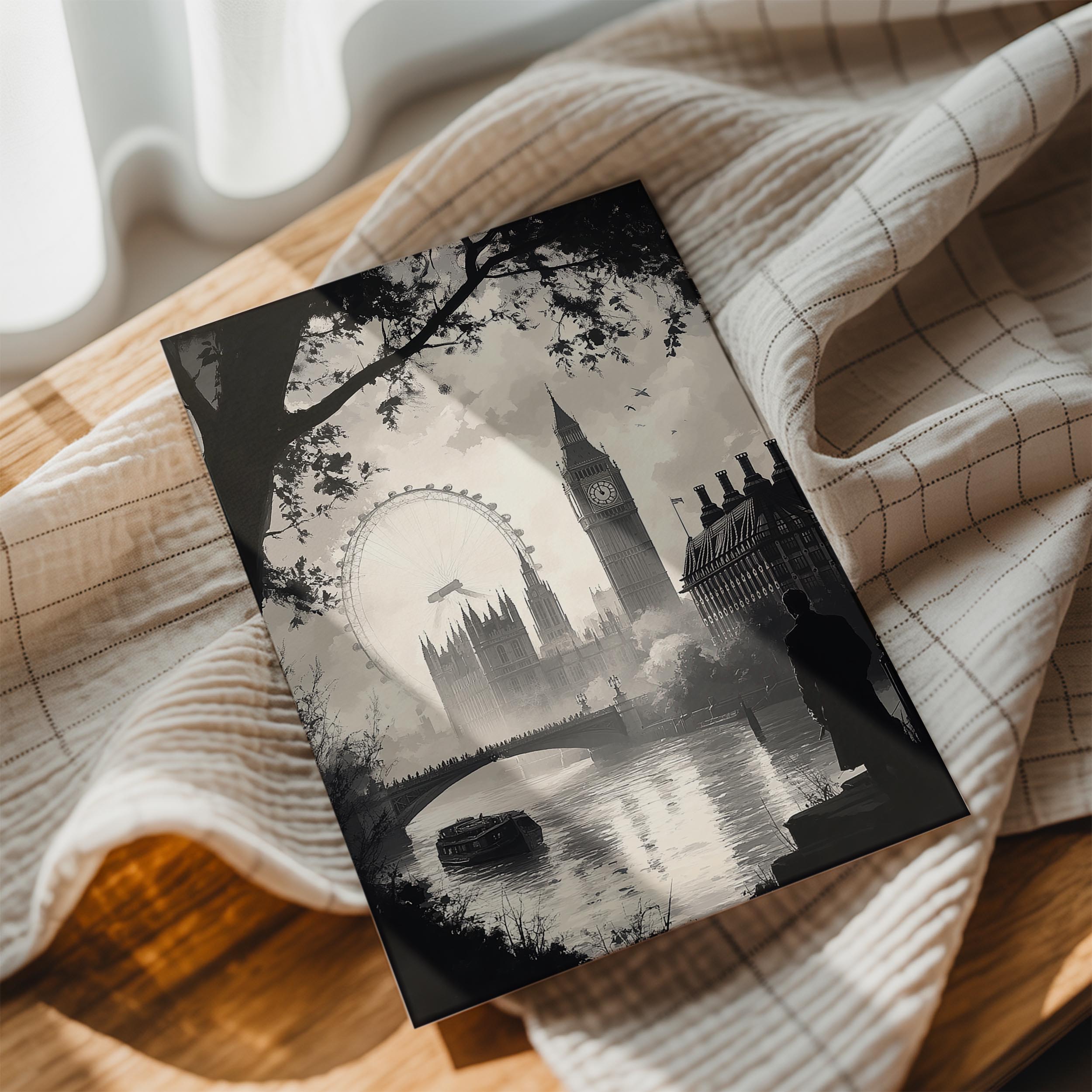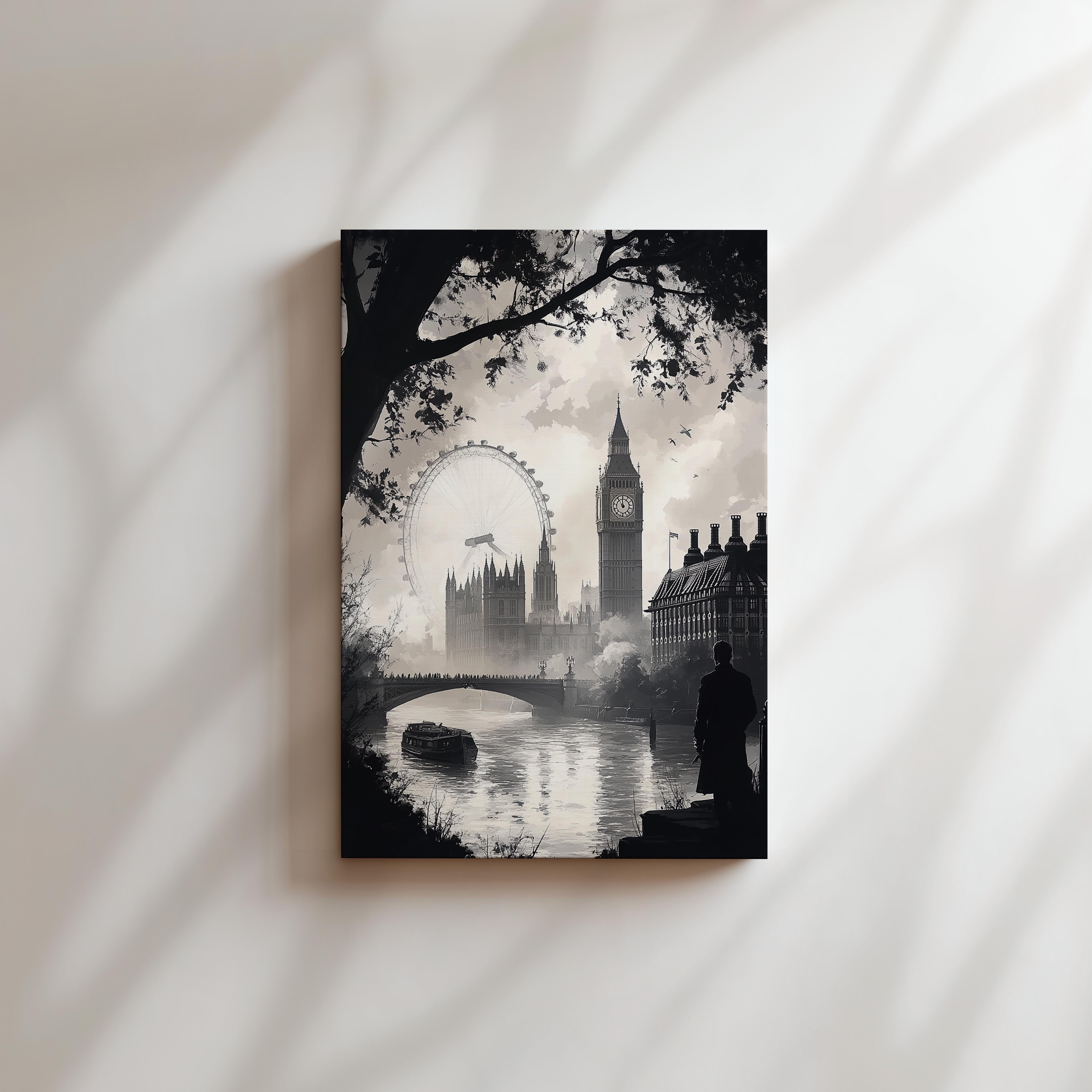A captivating image of the Thames River and iconic London landmarks enveloped in a soft fog. The moody lighting and misty atmosphere create a sense of mystery and charm, perfect for romantic or historical settings. The interplay of light and shadow highlights the city’s beauty, making this piece ideal for art lovers and admirers of London’s cultural history. Its elegance and depth make it suitable for both modern and classic interiors.