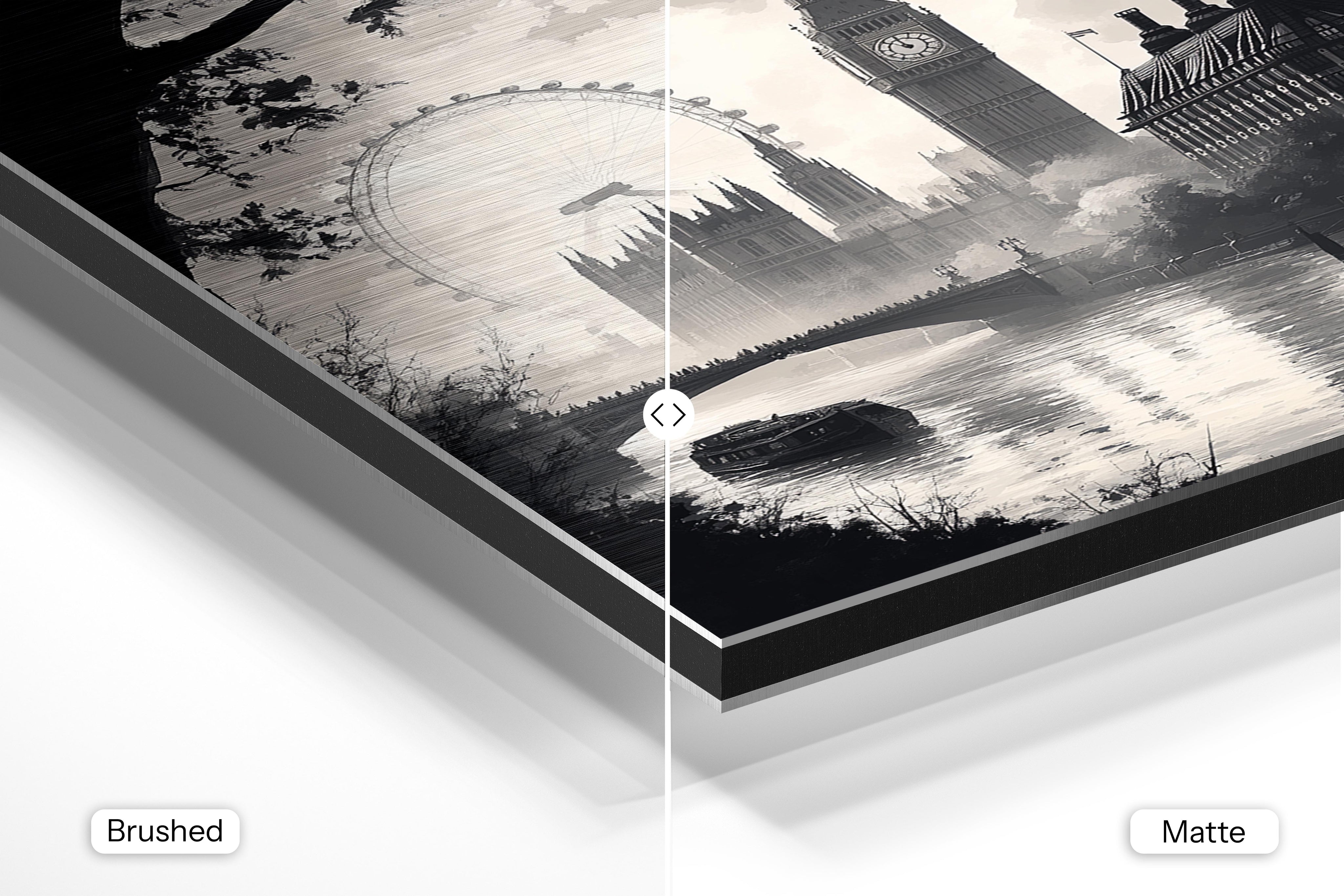 - Brushed Aluminum, on the other hand, features a raw metallic texture with visible brush strokes. Whites and highlights in your image let the silver surface show through, adding a dramatic, shimmering effect. Ideal for black-and-white images, minimalist designs, or abstract art, it creates a bold, industrial vibe with a modern edge.