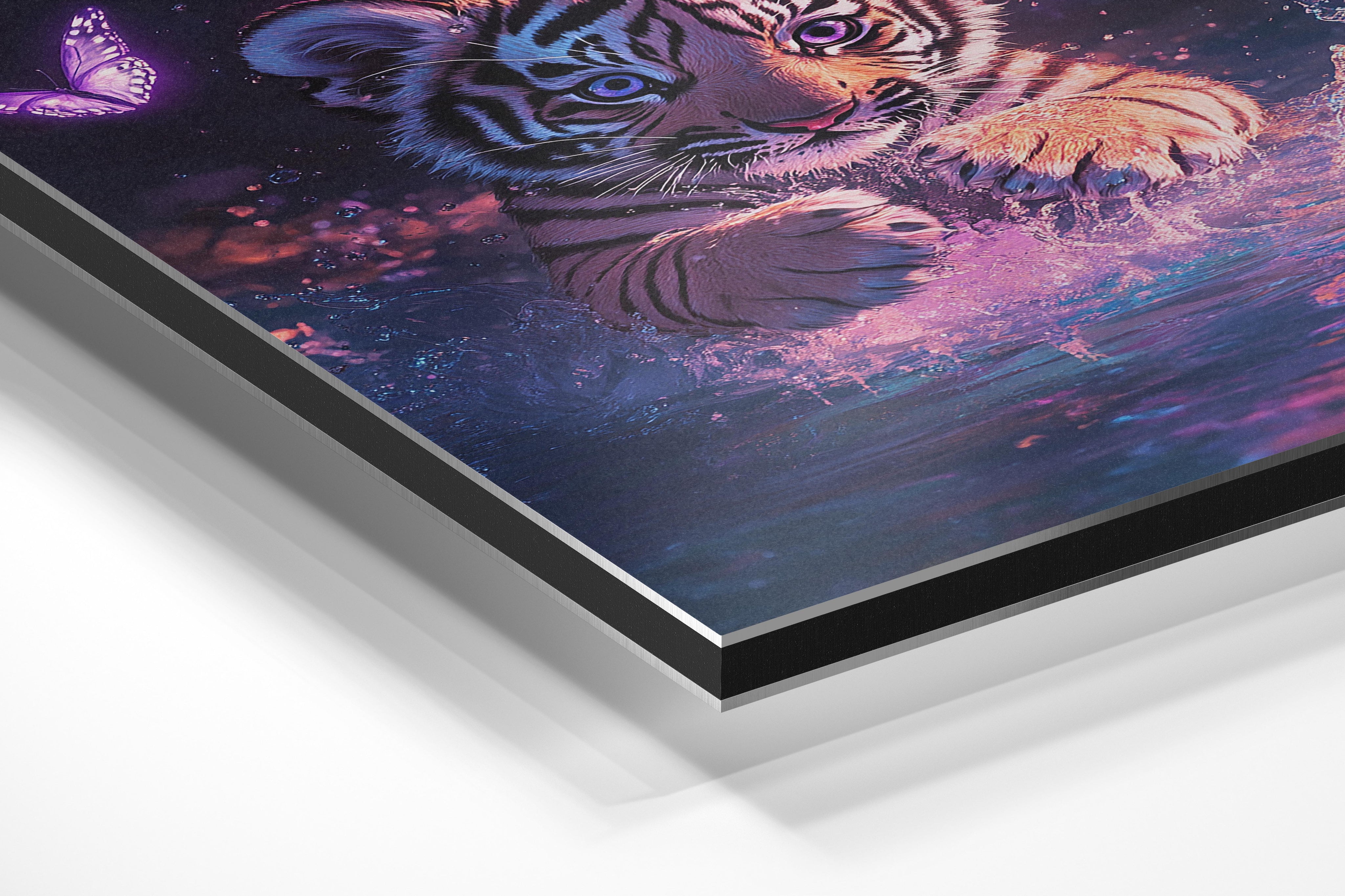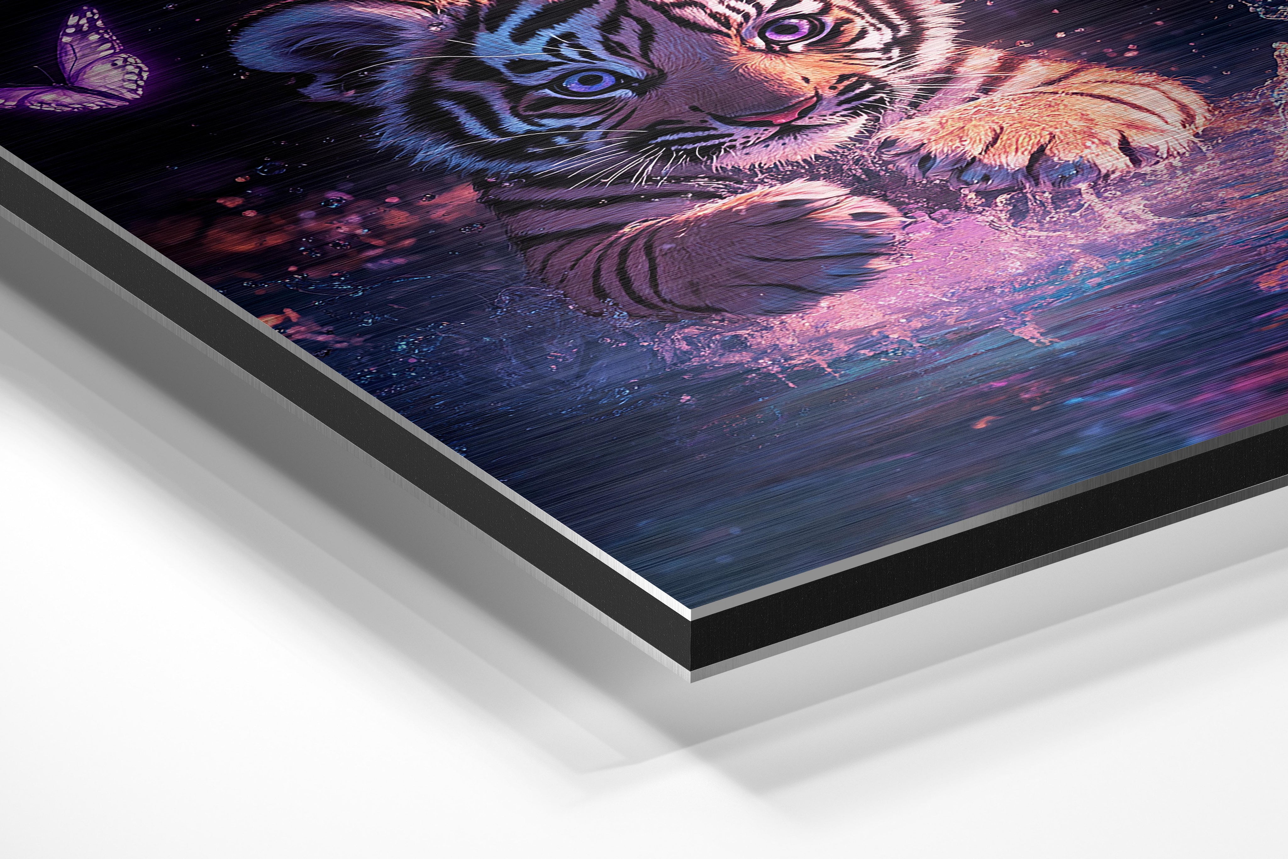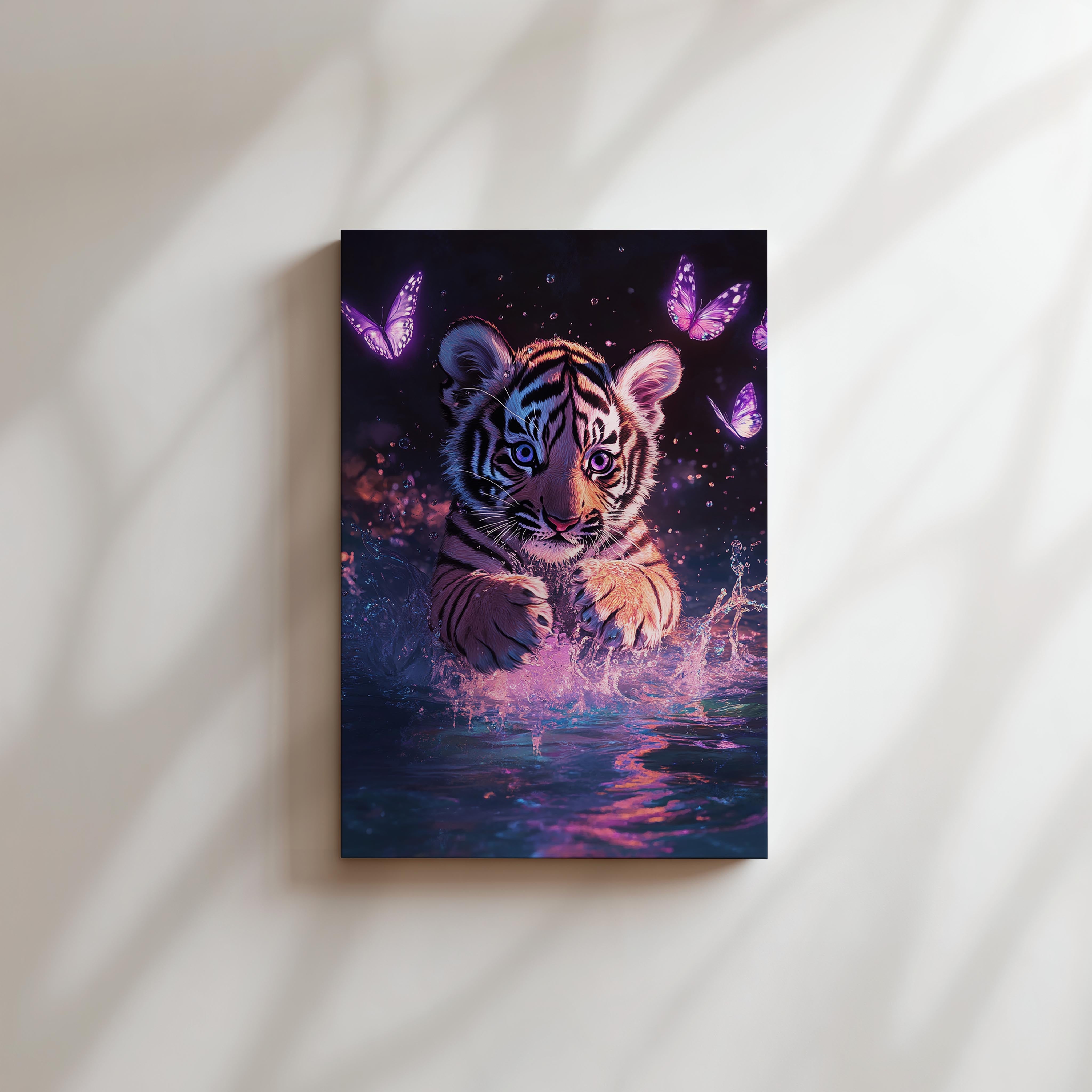 A playful tiger cub splashes in glowing water under the soft illumination of fluttering violet butterflies. The lighting in this image creates a dreamlike effect, with vibrant reflections on the water adding energy and movement. The cub’s curious expression and the delicate butterflies symbolize innocence and wonder, making this piece a perfect fit for a child’s room or a nature-lover’s collection. Its vibrant color palette and serene yet dynamic composition capture a moment of pure joy and fantasy.