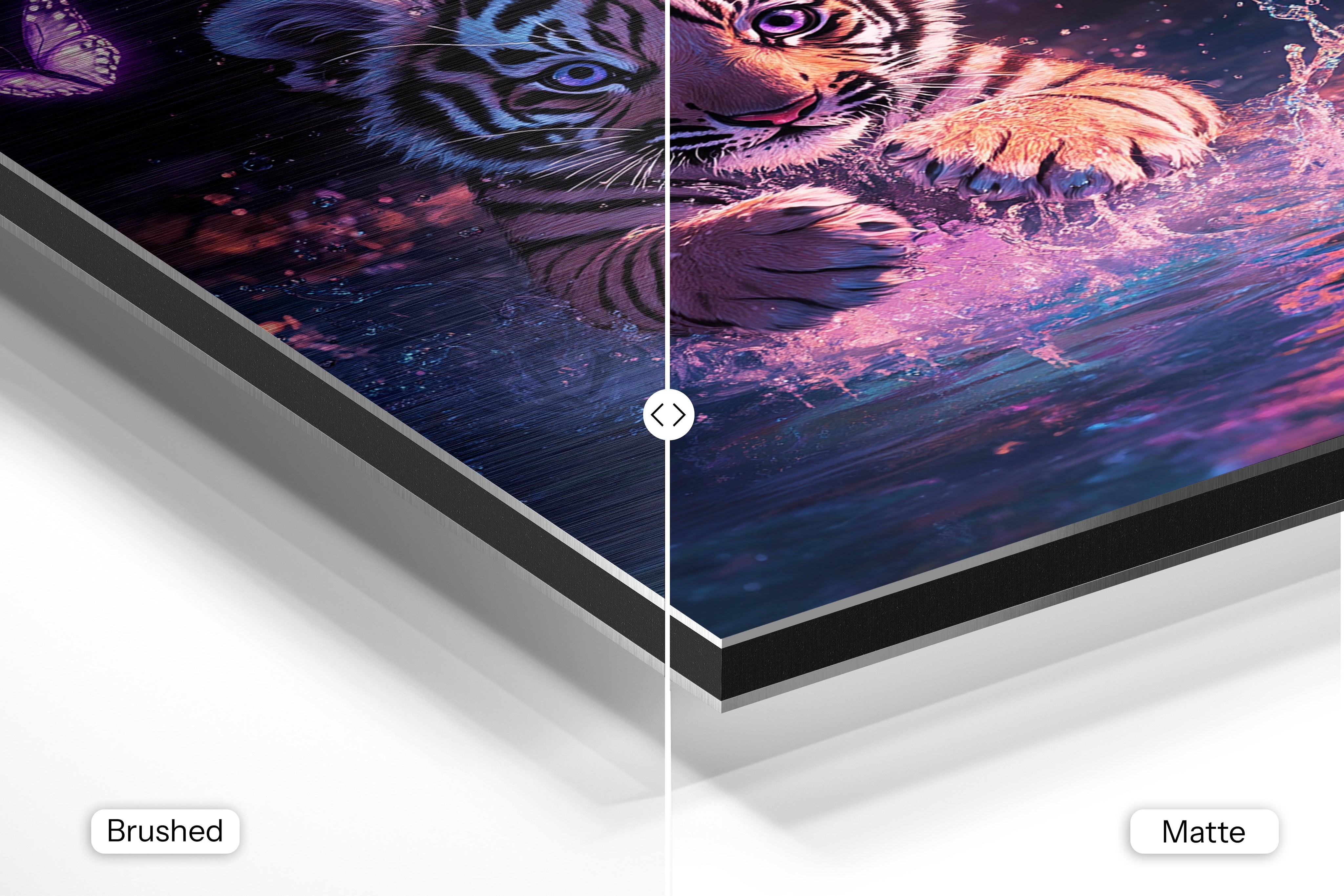 - Brushed Aluminum, on the other hand, features a raw metallic texture with visible brush strokes. Whites and highlights in your image let the silver surface show through, adding a dramatic, shimmering effect. Ideal for black-and-white images, minimalist designs, or abstract art, it creates a bold, industrial vibe with a modern edge.
