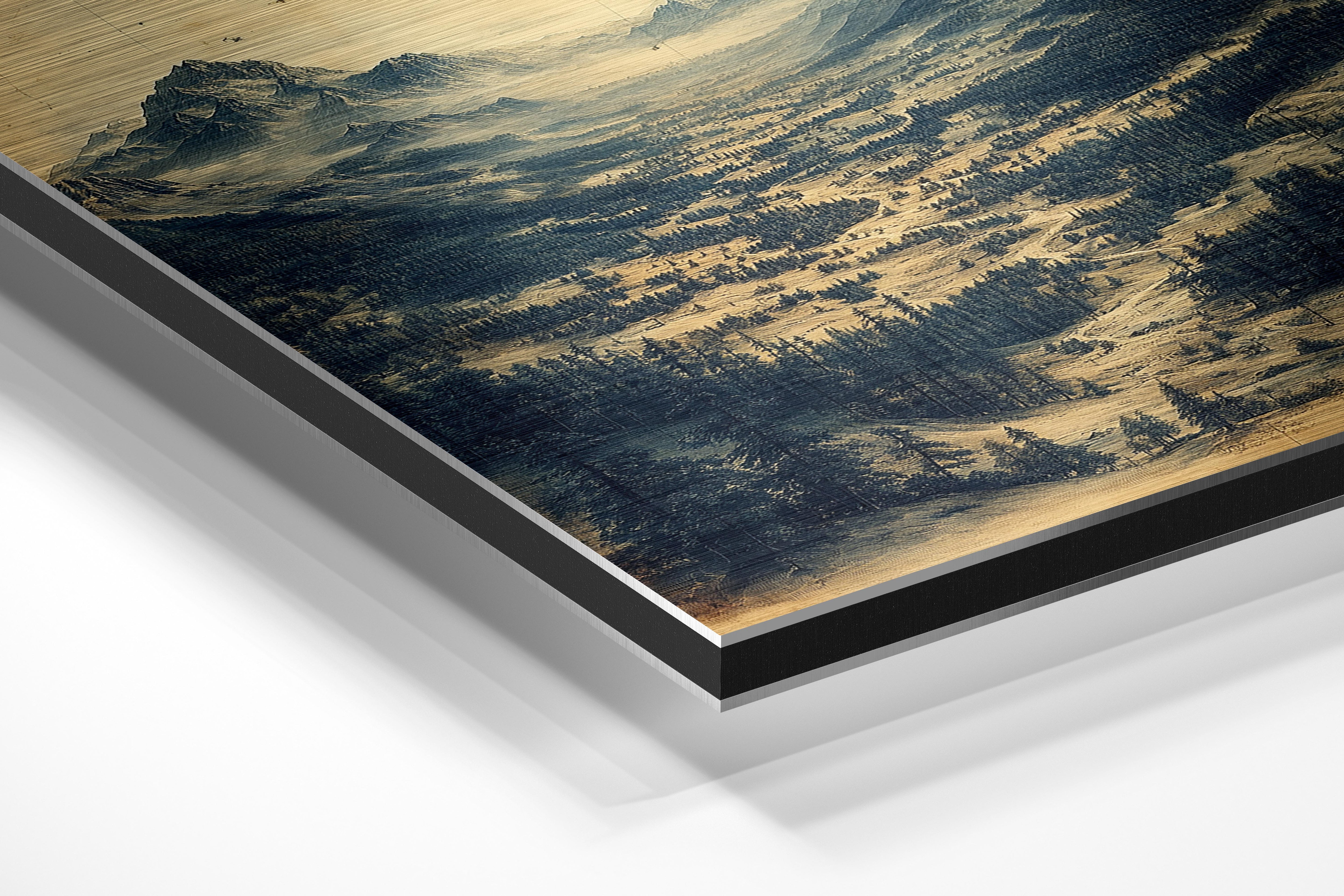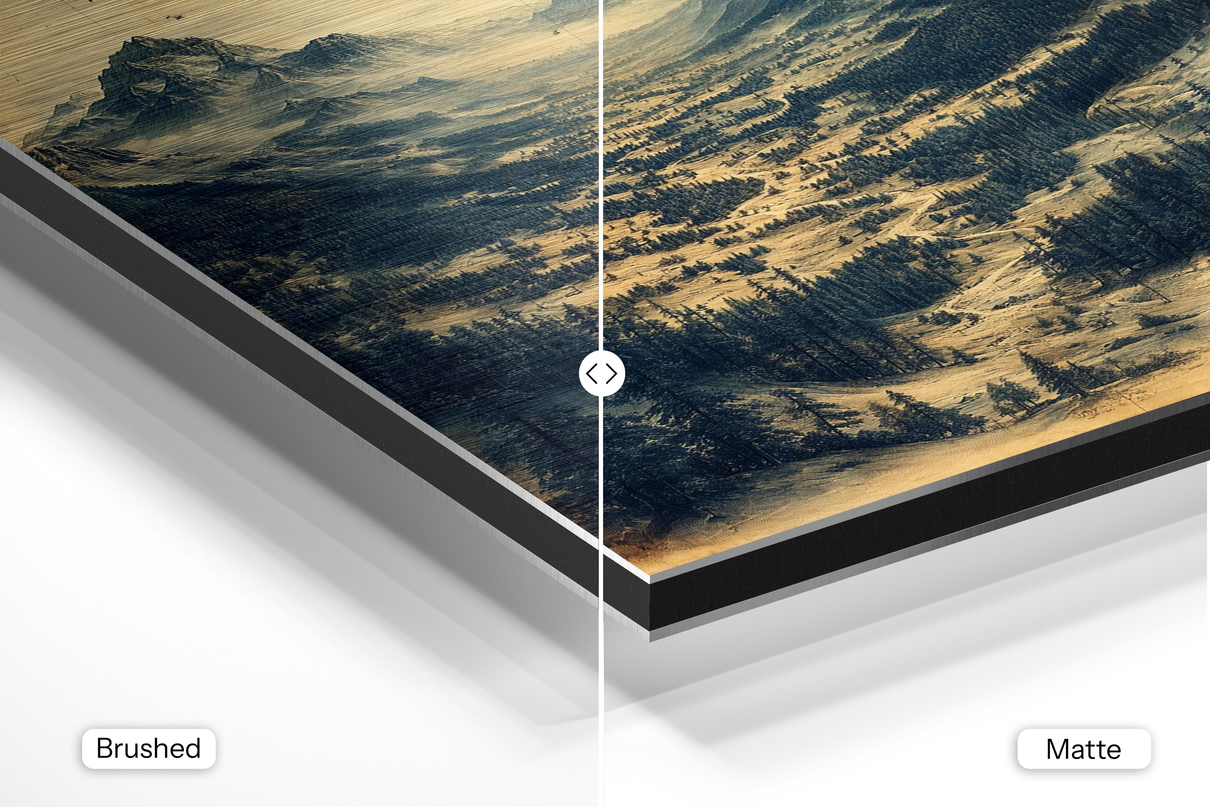 - Brushed Aluminum, on the other hand, features a raw metallic texture with visible brush strokes. Whites and highlights in your image let the silver surface show through, adding a dramatic, shimmering effect. Ideal for black-and-white images, minimalist designs, or abstract art, it creates a bold, industrial vibe with a modern edge.