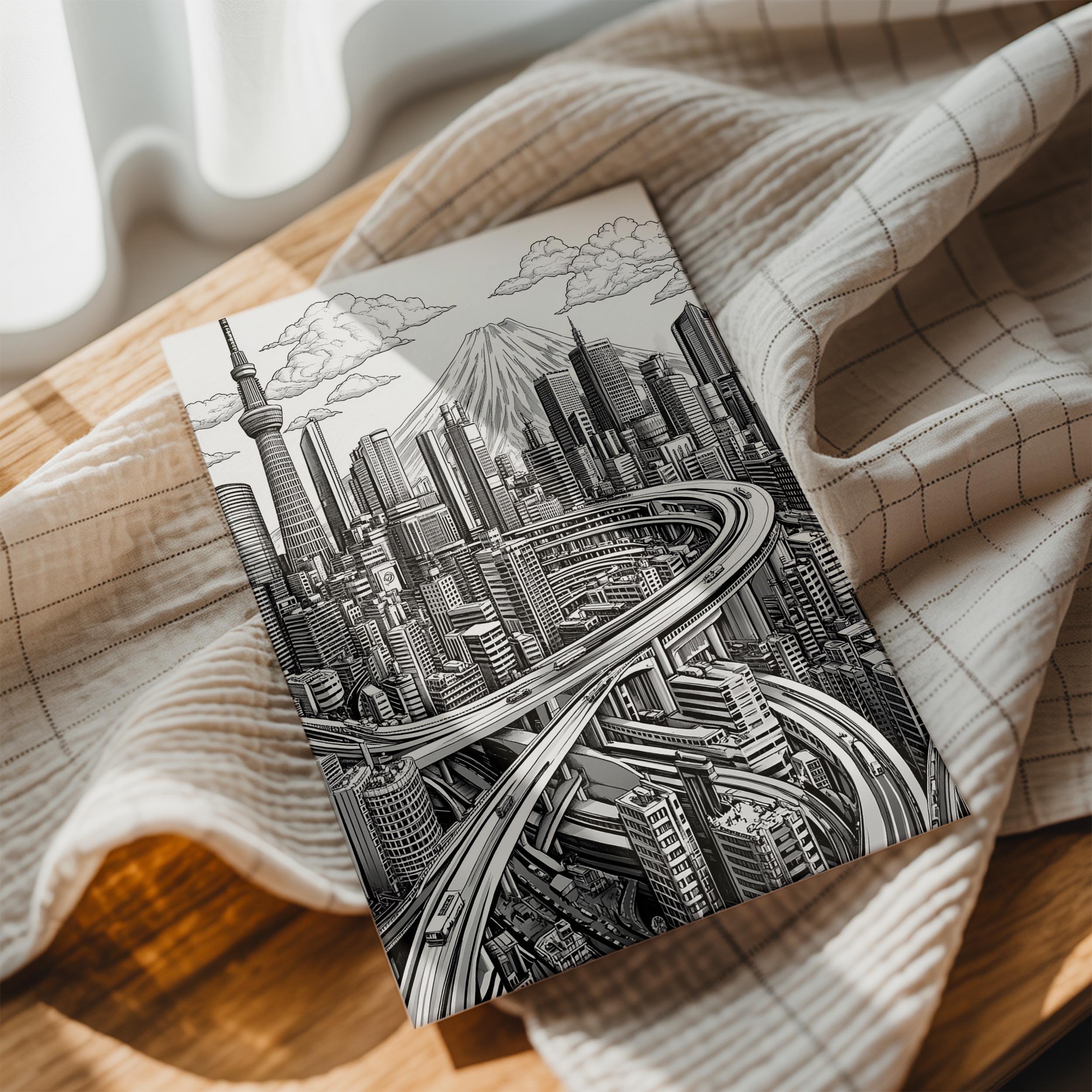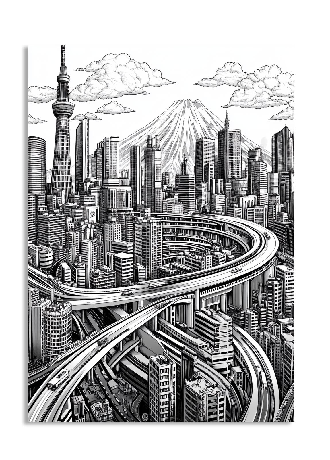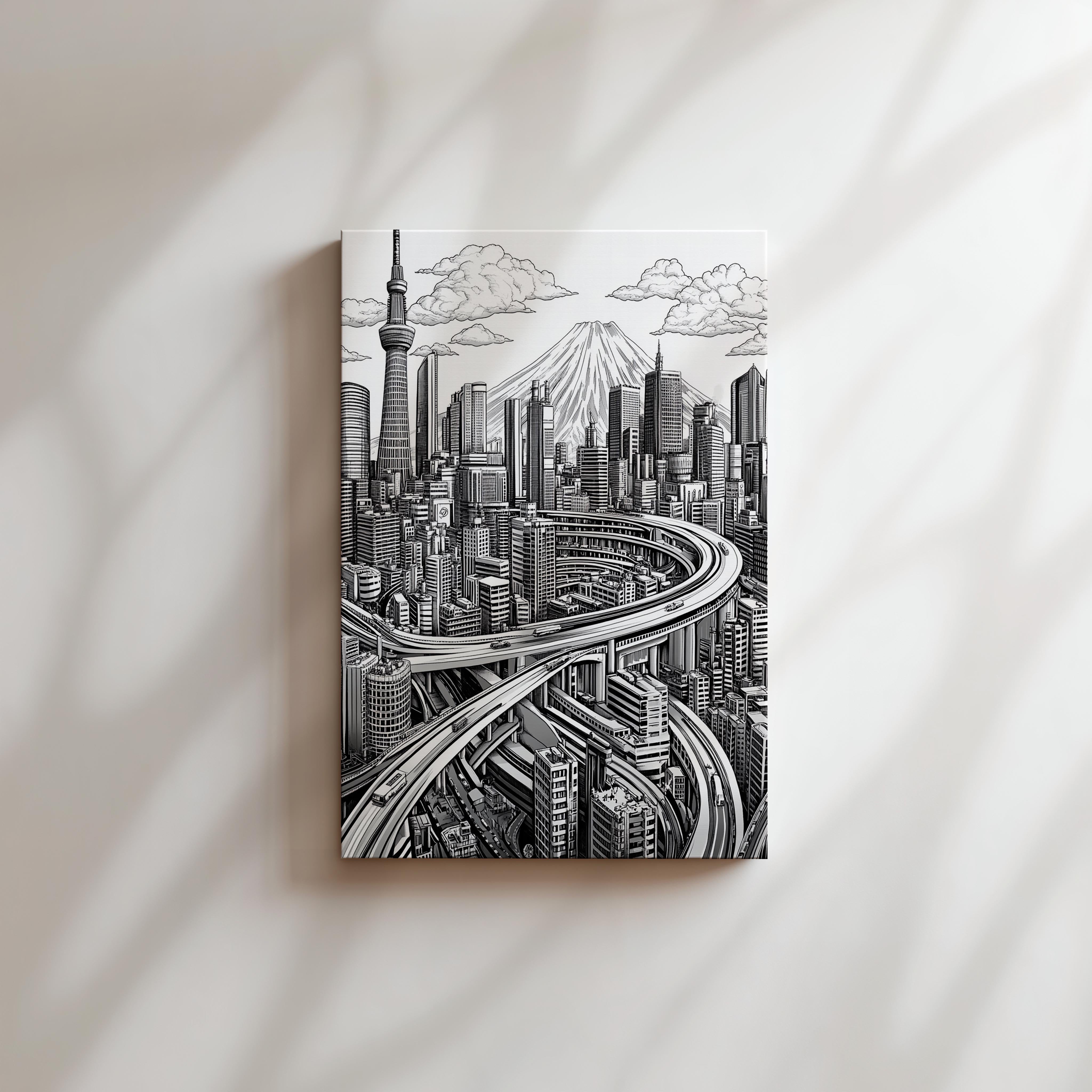 A detailed black-and-white illustration of Tokyo’s skyline with Mount Fuji towering in the background. The intricate highways and tall skyscrapers contrast with the natural majesty of the mountain. This artwork captures the coexistence of modernity and tradition, making it a fantastic addition to offices, study areas, or homes with a love for Japanese culture.