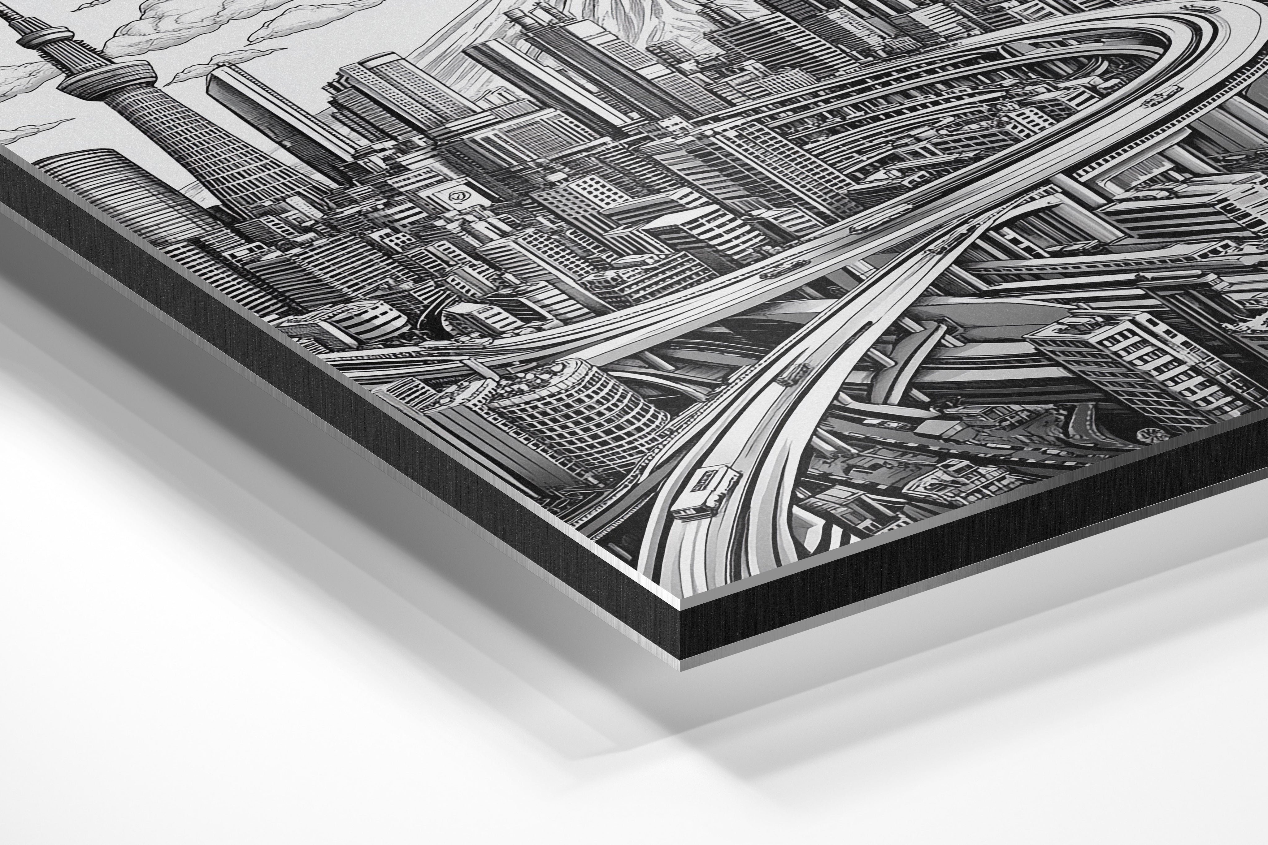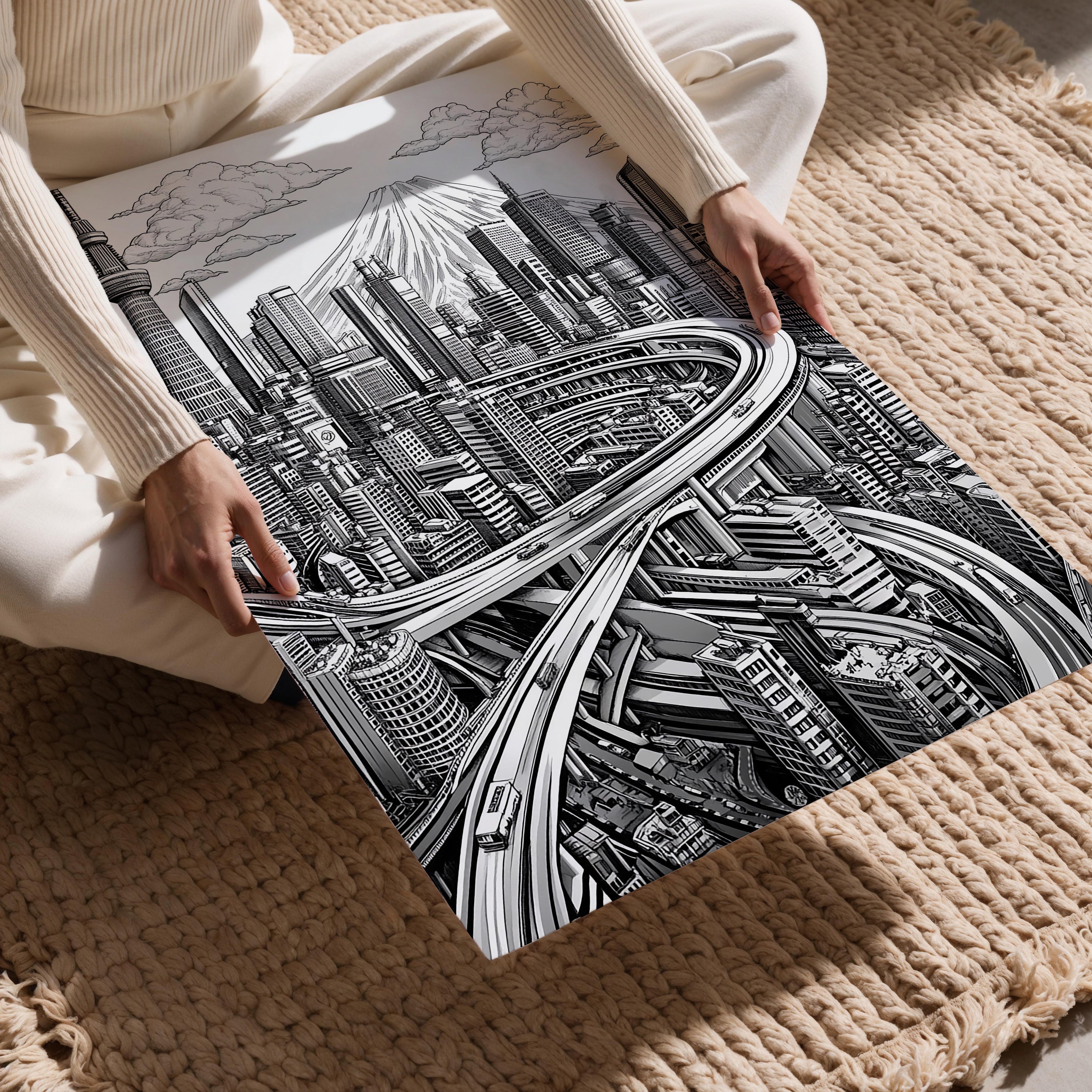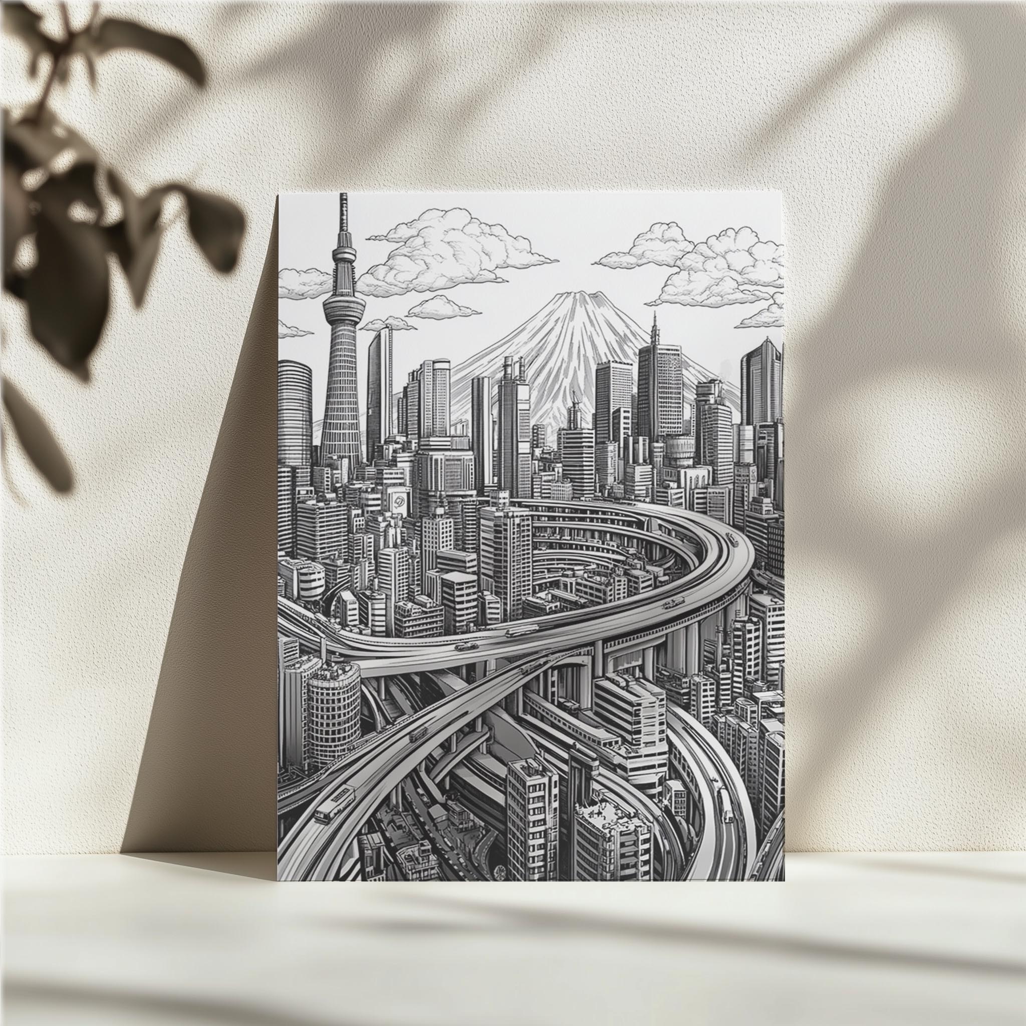A detailed black-and-white illustration of Tokyo’s skyline with Mount Fuji towering in the background. The intricate highways and tall skyscrapers contrast with the natural majesty of the mountain. This artwork captures the coexistence of modernity and tradition, making it a fantastic addition to offices, study areas, or homes with a love for Japanese culture.