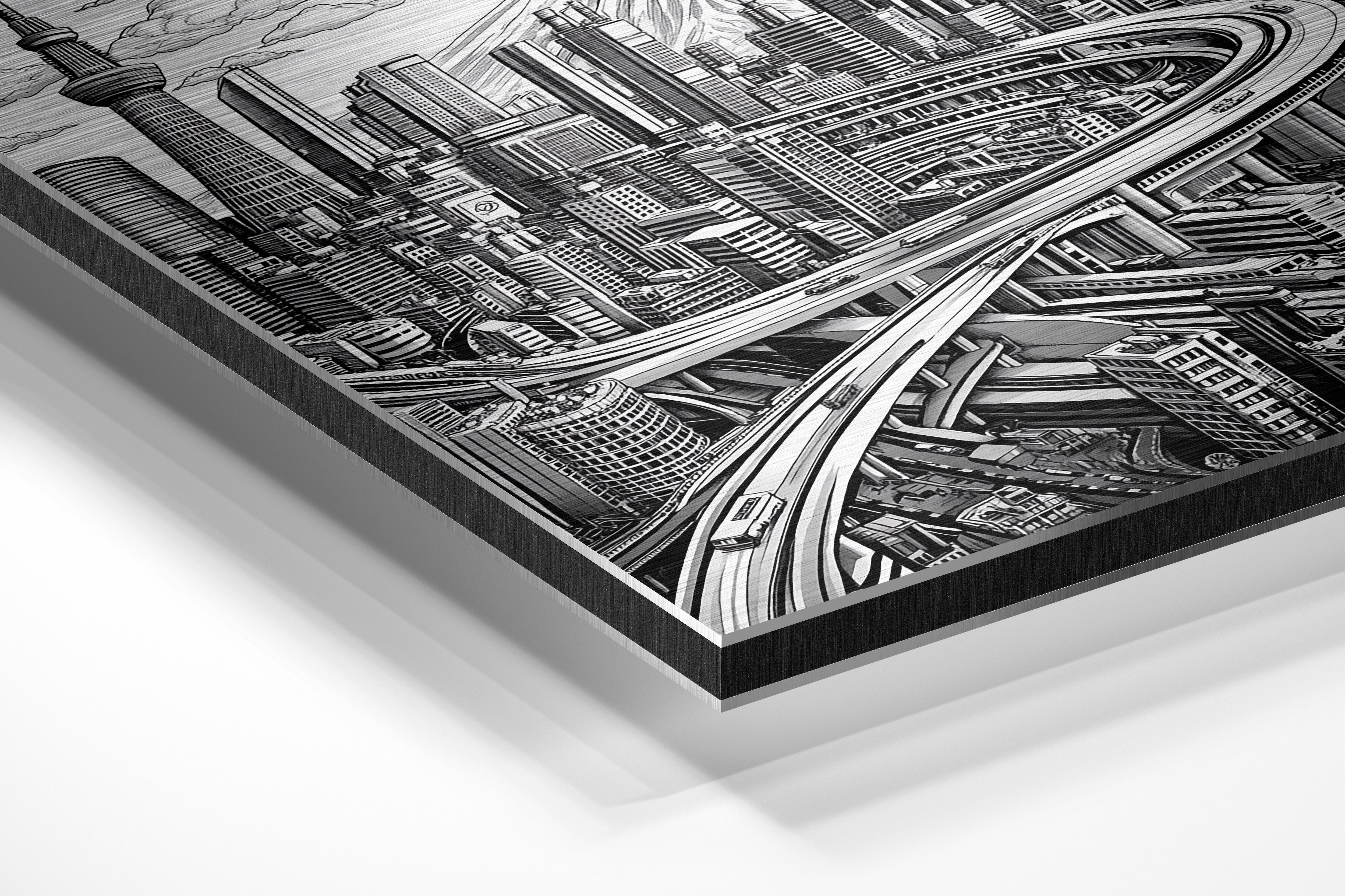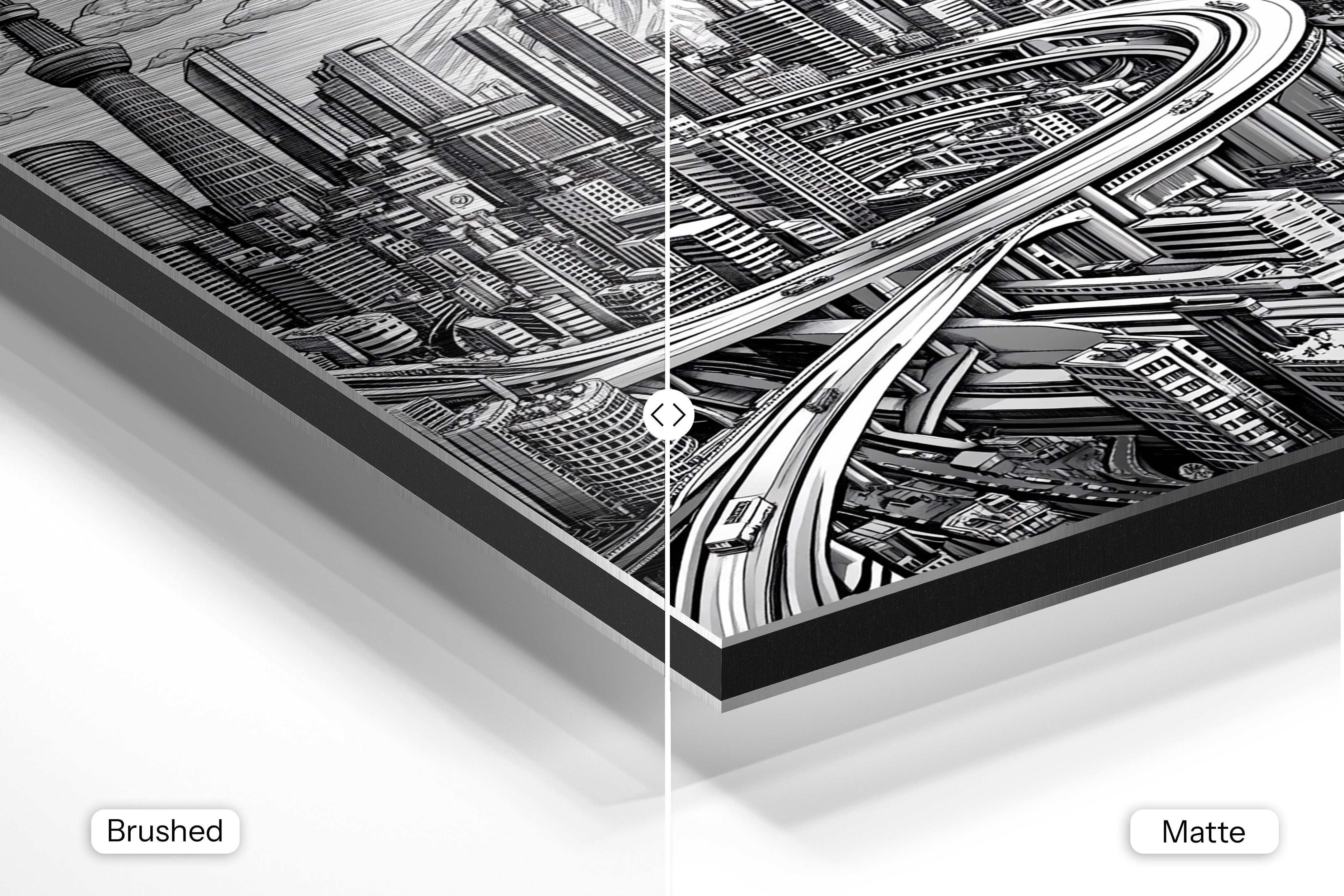 - Brushed Aluminum, on the other hand, features a raw metallic texture with visible brush strokes. Whites and highlights in your image let the silver surface show through, adding a dramatic, shimmering effect. Ideal for black-and-white images, minimalist designs, or abstract art, it creates a bold, industrial vibe with a modern edge.