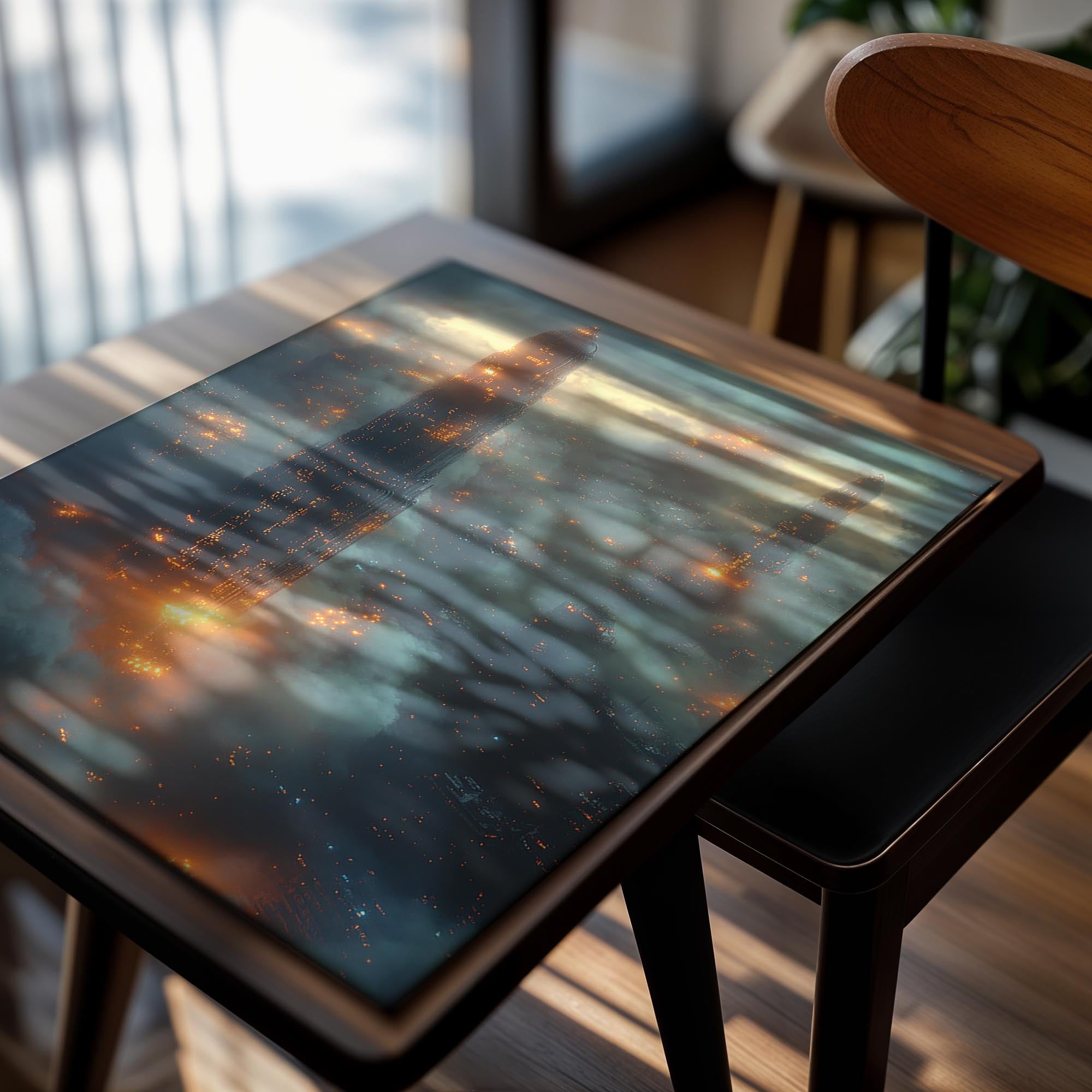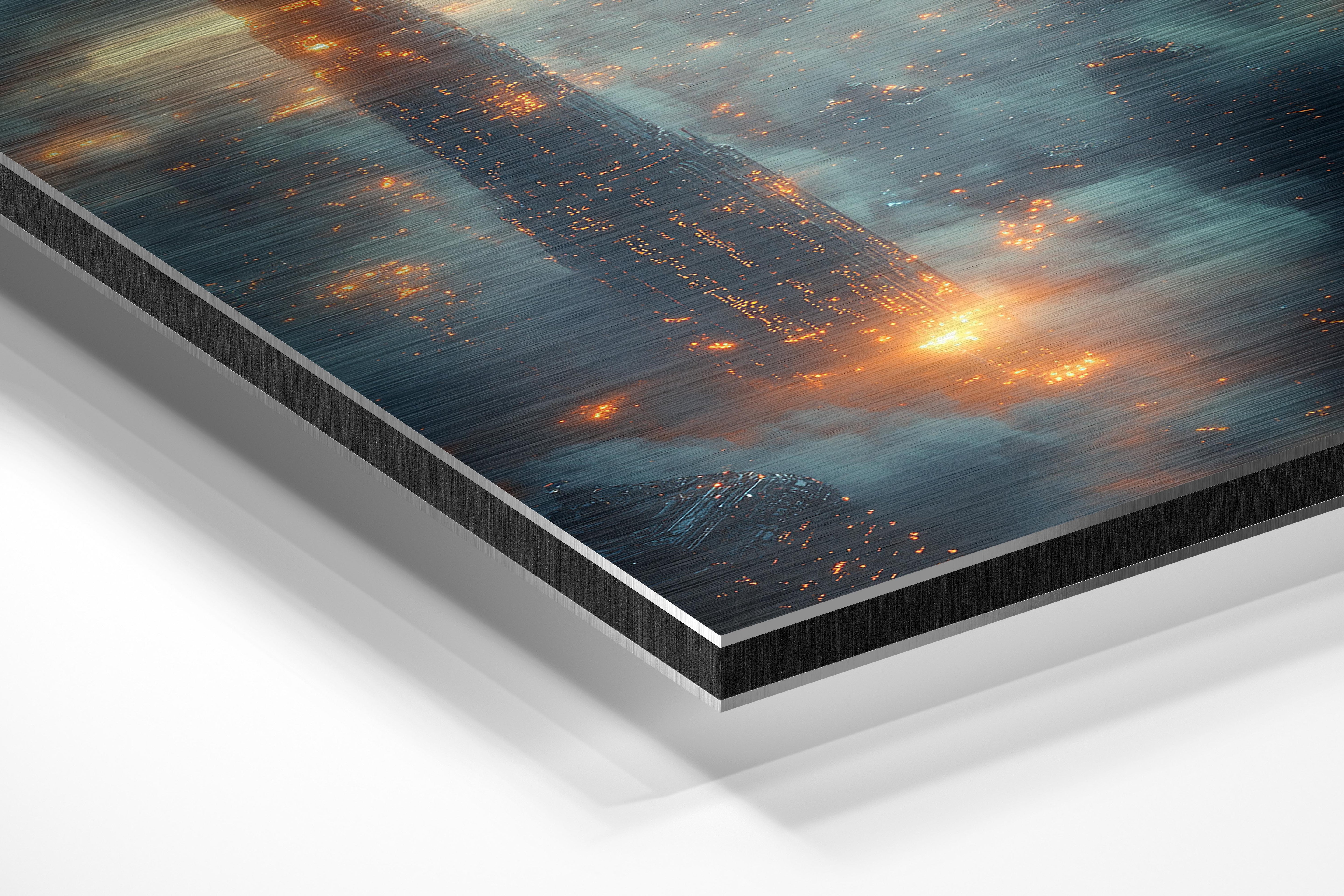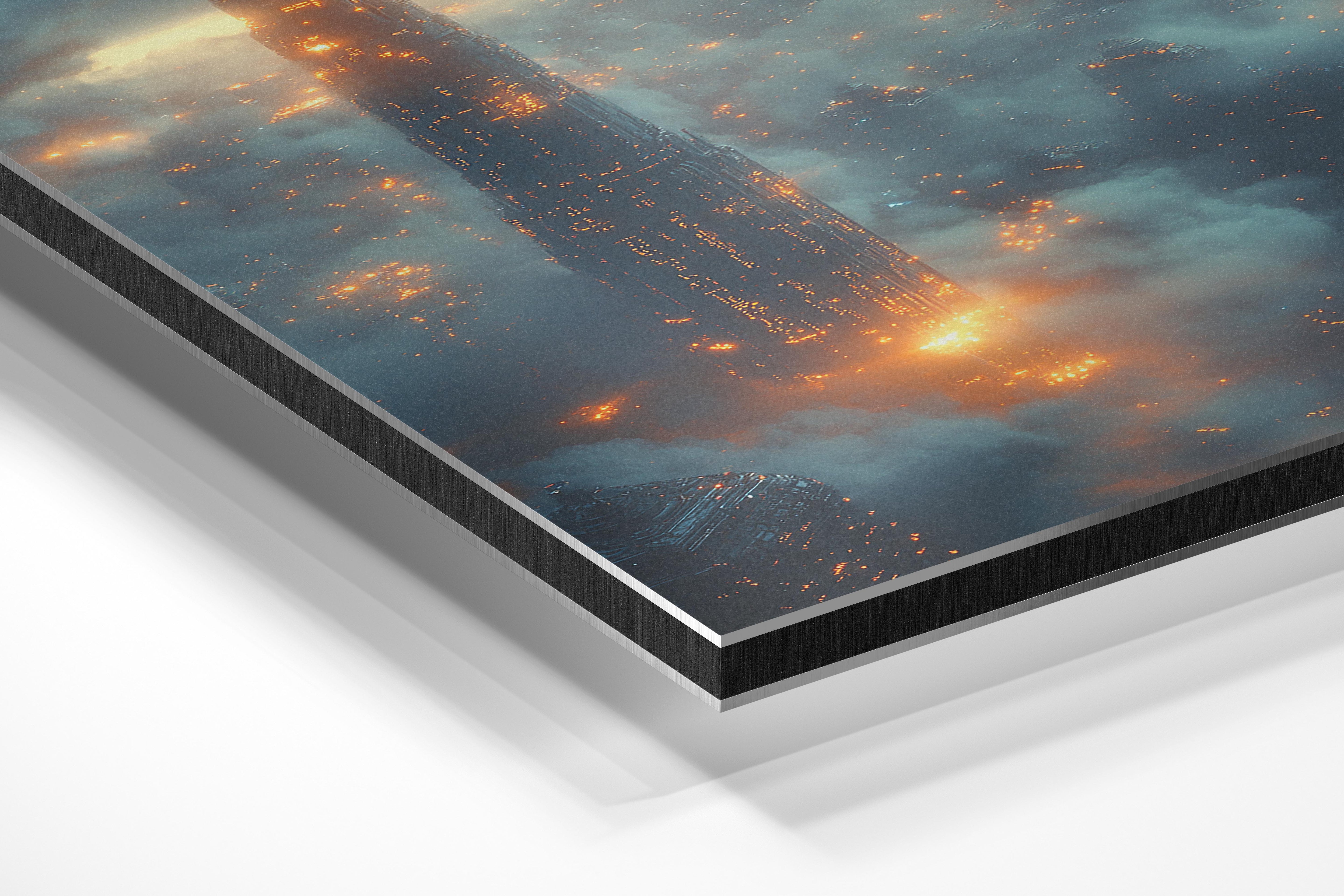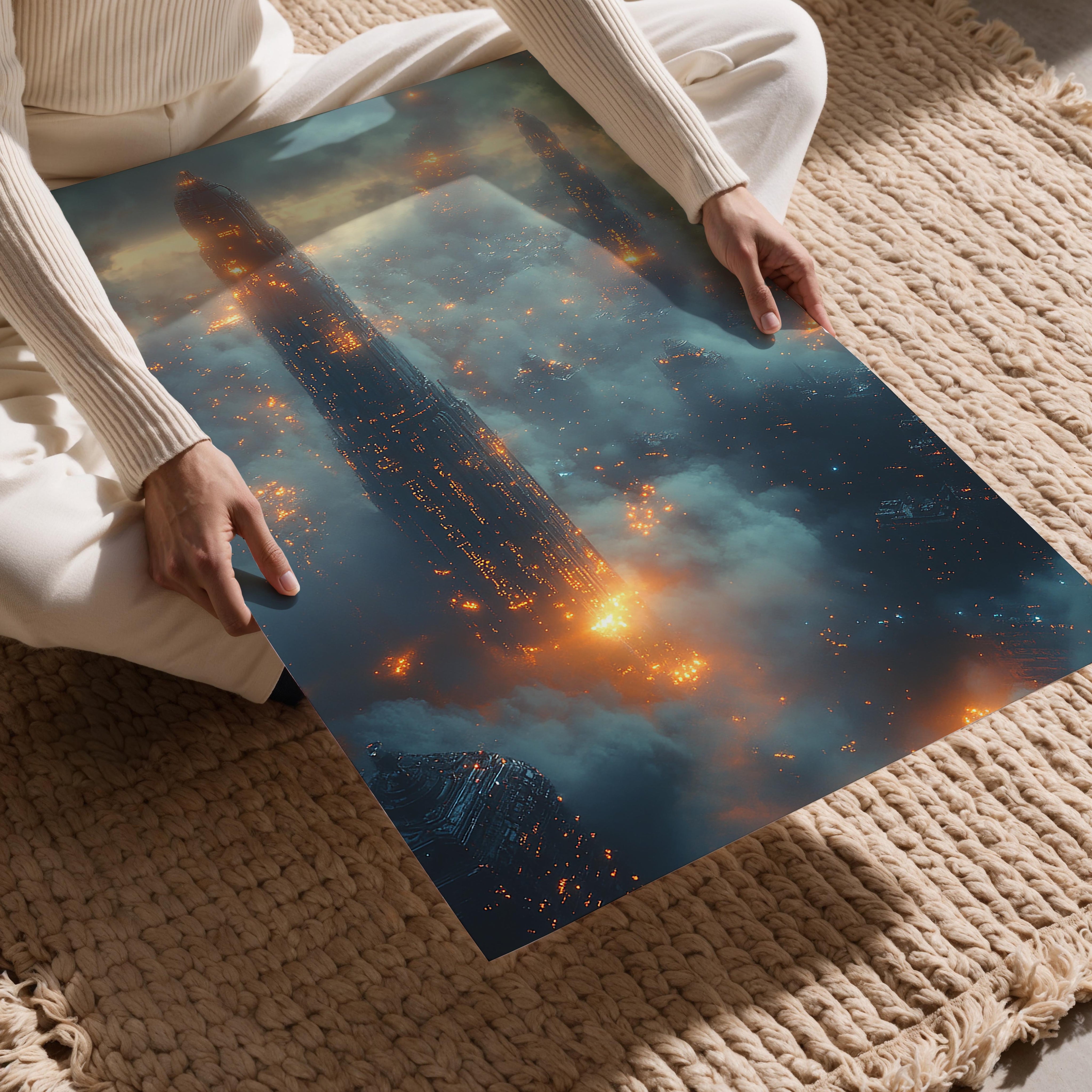 A breathtaking vision of towering city spires piercing through clouds, illuminated by warm orange lights. This image evokes themes of futuristic civilization and technological marvels, making it a perfect fit for modern interiors, sci-fi collections, or spaces designed to inspire imagination and wonder. The misty ambiance adds an ethereal quality, enhancing its artistic appeal.