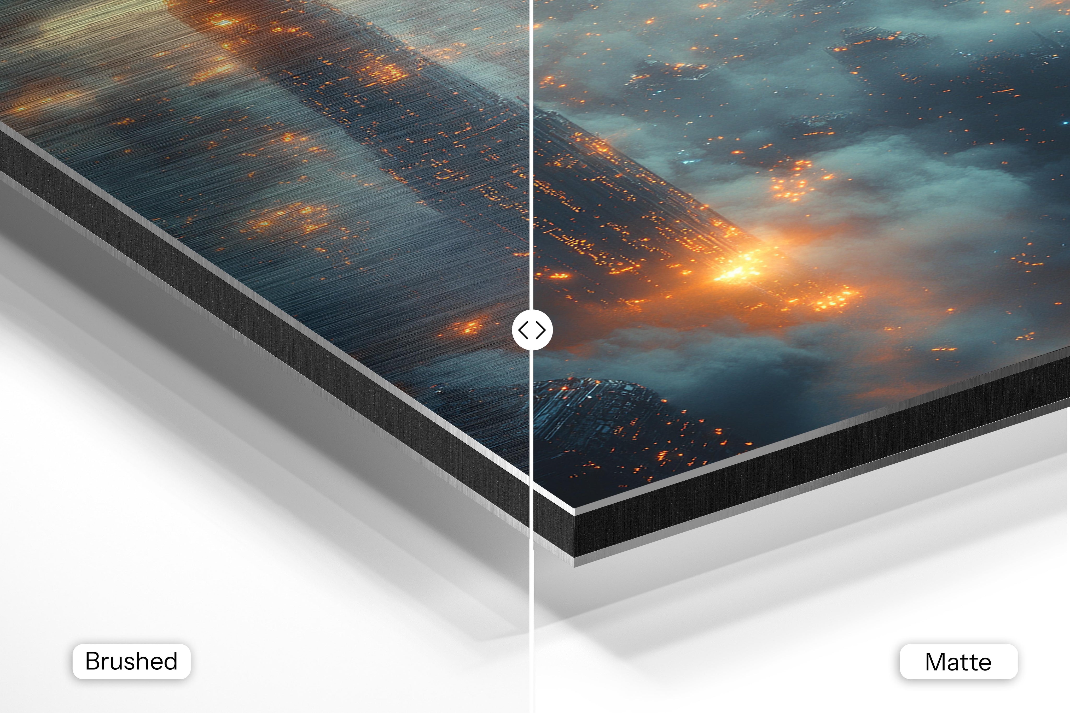 - Brushed Aluminum, on the other hand, features a raw metallic texture with visible brush strokes. Whites and highlights in your image let the silver surface show through, adding a dramatic, shimmering effect. Ideal for black-and-white images, minimalist designs, or abstract art, it creates a bold, industrial vibe with a modern edge.